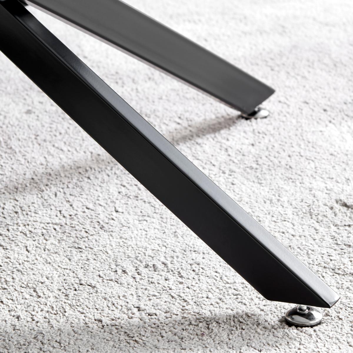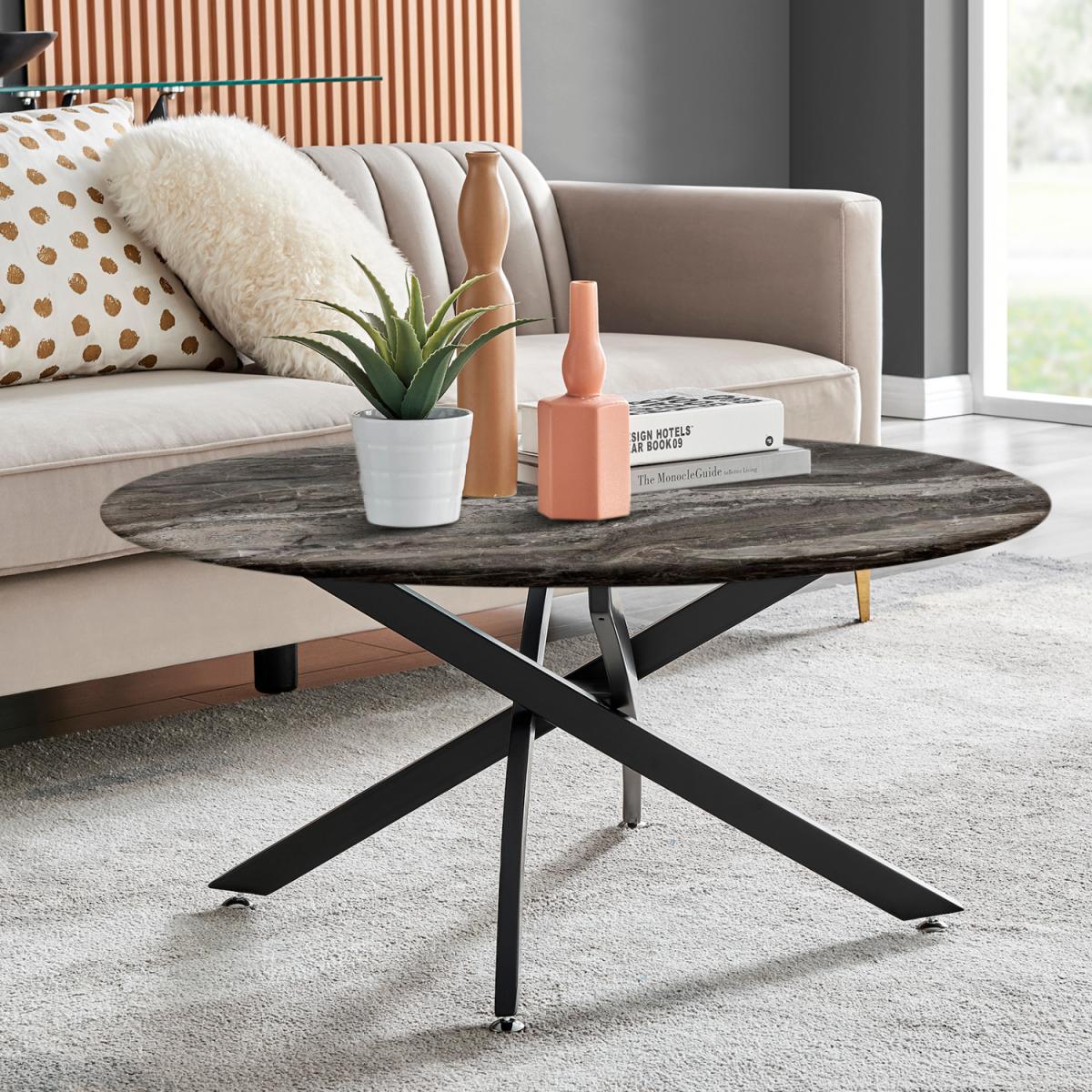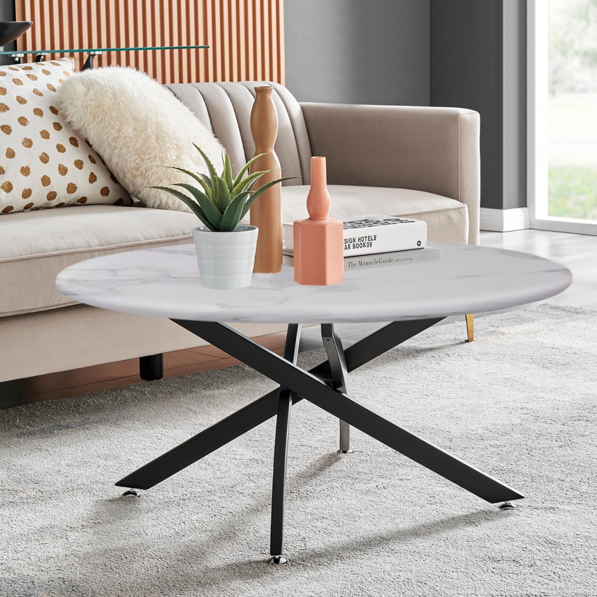 Our Novara glass marble effect round coffee table has semi-matte black legs in a stylish nested starburst design. We're excited to bring you this update to our popular Novara range! Combining minimalist design with classy contemporary style, the Novara marble coffee table will transform your living room. The marble-effect glass tabletop has a veining pattern and, when paired with the black legs, creates an ultra modern, sleek and spacious feel for your home that adds a focal point without overwhelming your space. This round table top is made from strong tempered glass with a marble effect and a smooth rounded edge. It's sat on top of sturdy black powder-coated legs, so it's not only designed to last but to look great while doing it! Available in a range of other colourmaterials, with matching side tables, so check out the full Novara range for more ideas. Note The marbling effect is a bespoke and unique pattern each time, to reflect the one-of-a-kind patterns of natural marble, so some variations will occur from the pattern shown in the photos.