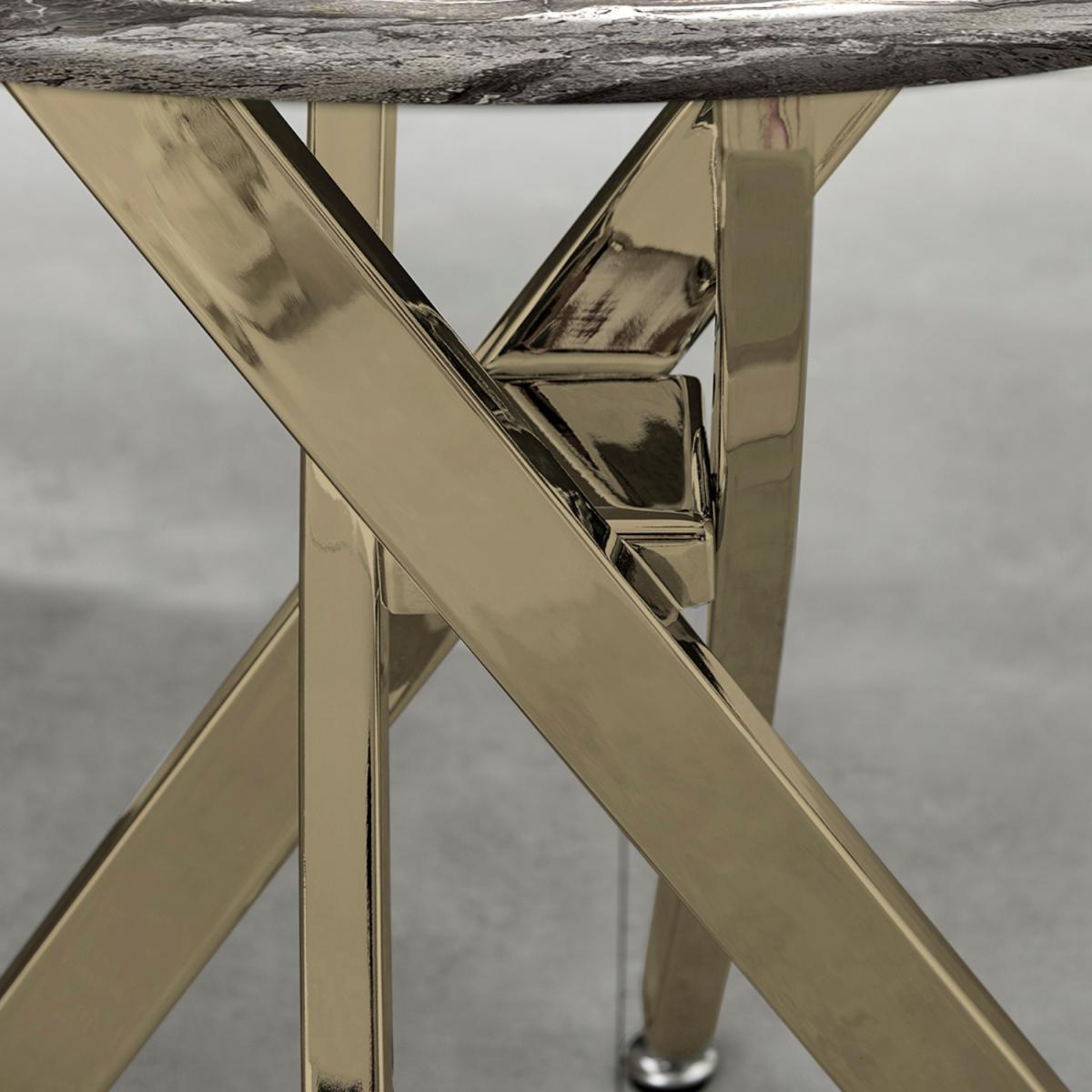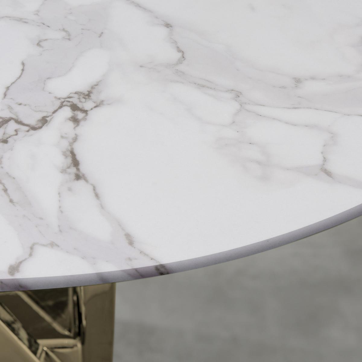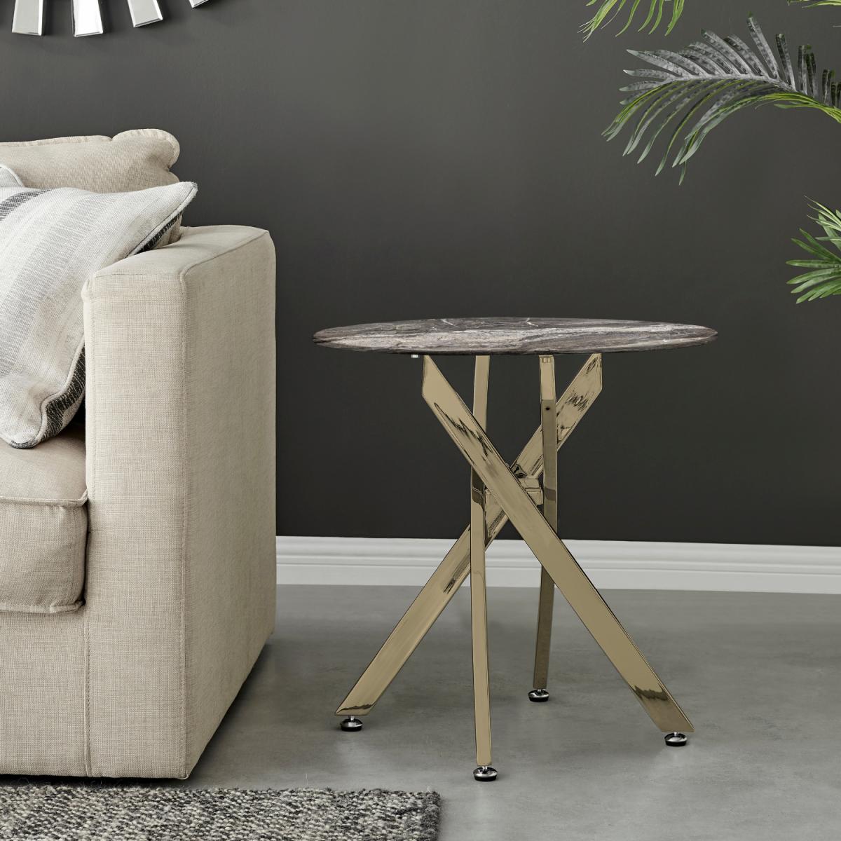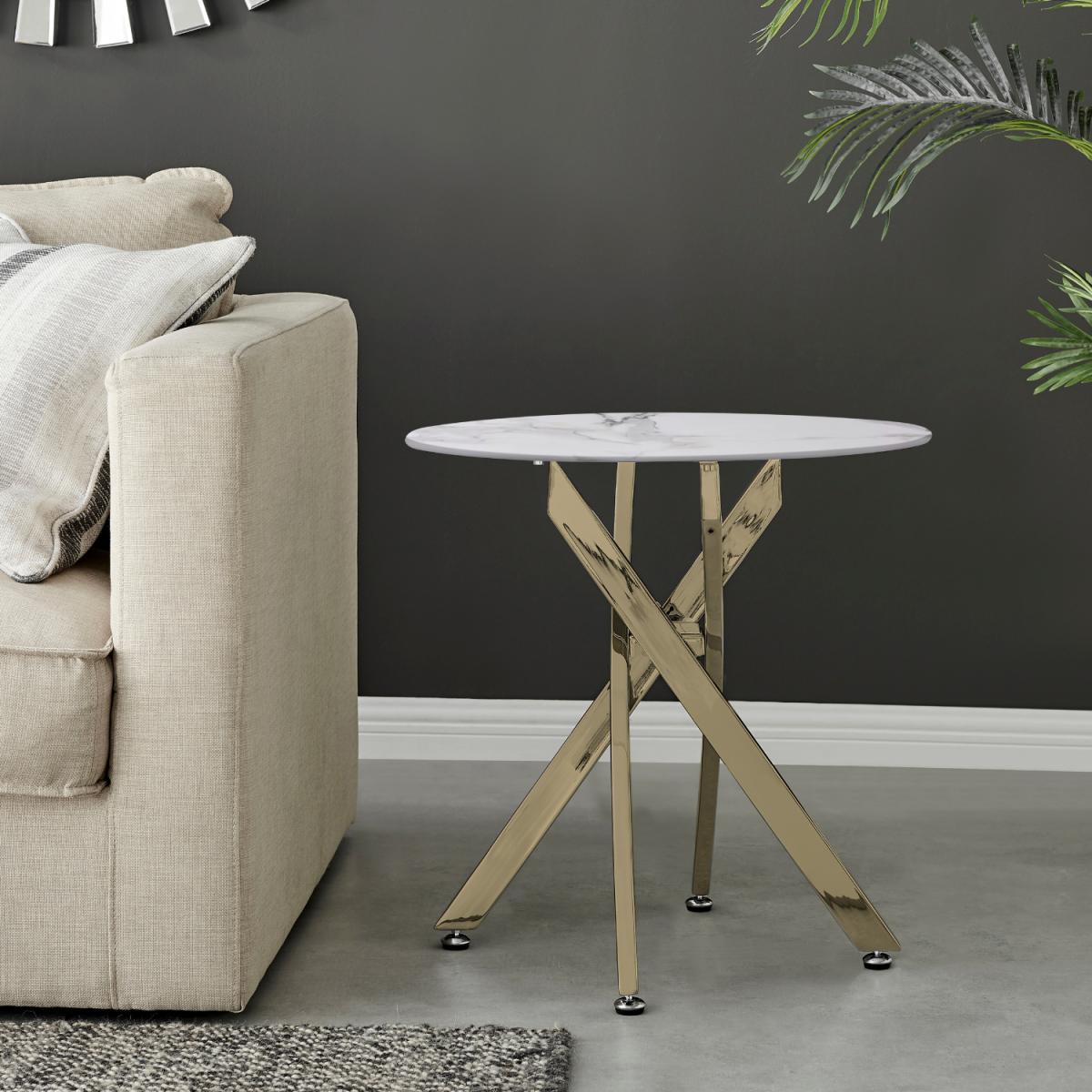 Our Novara glass marble effect round side table has shiny chrome gold legs in a stylish nested starburst design. Were excited to bring you this update to our popular Novara range! Combining minimalist design with classy contemporary style, the Novara glass marble end table will transform your living room or make a gorgeous bedside table. The marble-effect glass tabletop has a veining pattern and, when paired with the reflective gold legs, creates an ultra modern, sleek and spacious feel for your home that adds a focal point without overwhelming your space. This round tabletop is made from strong tempered glass with a marble effect and a flat edge. It's sat on top of sturdy gold chromed legs, so it's not only designed to last but to look great while doing it! Available in a range of colourmaterials, with matching console tables, coffee tables and dining sets, so check out the full Novara range for more ideas. Note The marbling effect is a bespoke and unique pattern each time, to reflect the one-of-a-kind patterns of natural marble, so some variations will occur from the pattern shown in the photos.