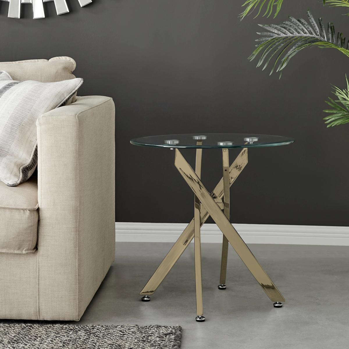 Our Novara round glass side table is effortlessly chic. The design of the legs is industrial but the bright chrome keeps it a minimalist and elegant modern coffee table. Coupled with the clear glass table top, it creates a lovely piece that's functional and will reflect the light to keep your living room bright and airy. An eye-catching feature without dominating your space. Part of our popular Novara range - you can pair up with one of our matching dining sets, or coffee tables. The table top is clear tempered safety glass. The legs are chrome metal that are strong and sturdy enough to withstand everyday use without compromising on design.