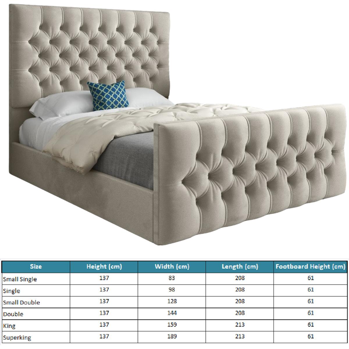 Classic and traditional design with this stunning chesterfield pleated upholstery headboard and matching upholstered footboard. Choice of buttons to choose from either fabric to match or diamant. The headboard is generously padded for comfort and bed is supplied with solid slats for long lasting mattress ventilation. The upholstered pleated footboard is complemented with chrome pipe feet. Bed features solid slats and is robust and strong.