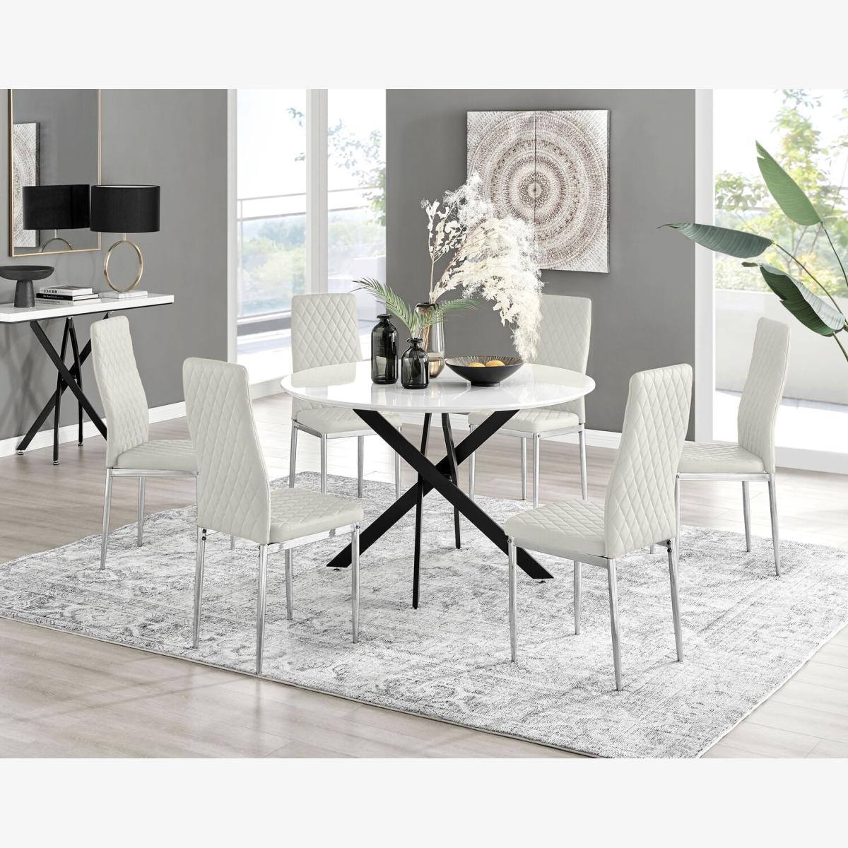 Our popular Novara round dining table here combines a super modern white high-gloss tabletop with chic matte black metal legs in an eye-catching nested starburst design. A sleek and minimalist dinner table with Industrial touches. The white tabletop and open space around the legs still keeps this table feeling light and airy. At 120cm across, this table will comfortably seat up to 6, with round tables also being great for more intimate, relaxed dining and smaller spaces. The strong metal legs not only make this table a real central feature for your room but keep it sturdy. The white gloss table top is smooth and easy to wipe clean too, meaning your Novara will stay looking great for years to come. Also available in a smaller 100cm size and in a range of other leg and tabletop finishes, with matching side tables, consoles and coffee tables, so be sure to check out the full Novara range! Upholstered in soft touch cream velvet and finished with diamond pattern stitching the Milan dining chairs would seamlessly fit in with most dining spaces, whilst not compromising on either style or comfort. The stylish shiny chrome silver leg and hatched velvet combination gives this chair a contemporary edge, whilst it's simple design allows for practical everyday usage. The chairs are made from high quality durable velvet that's easy to keep clean and are ergonomically designed for maximum comfort and support. They feature a deep foam seat cushion and plastic feet to protect the floor from any damage! At an unbeatable price you cannot go wrong with these chairs!