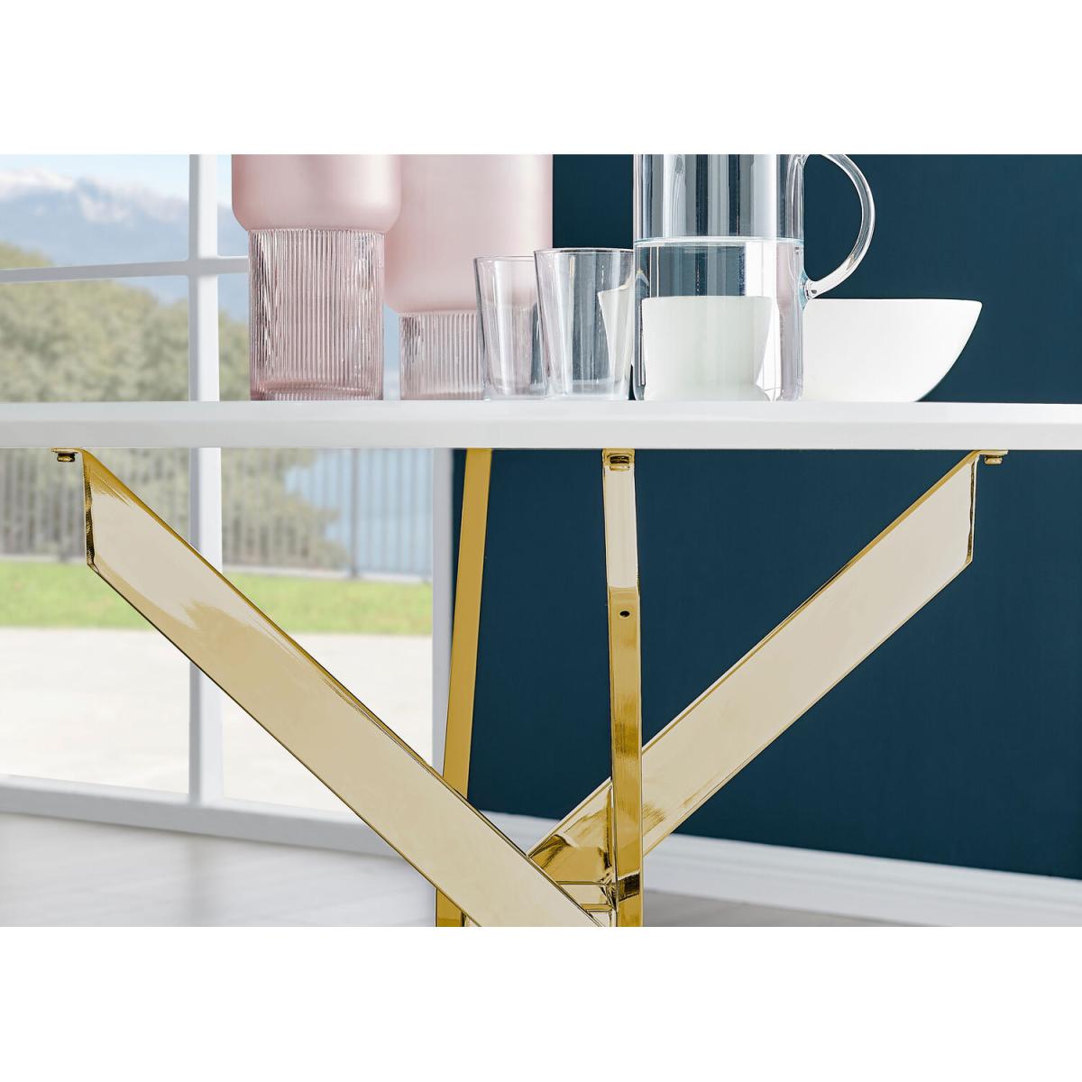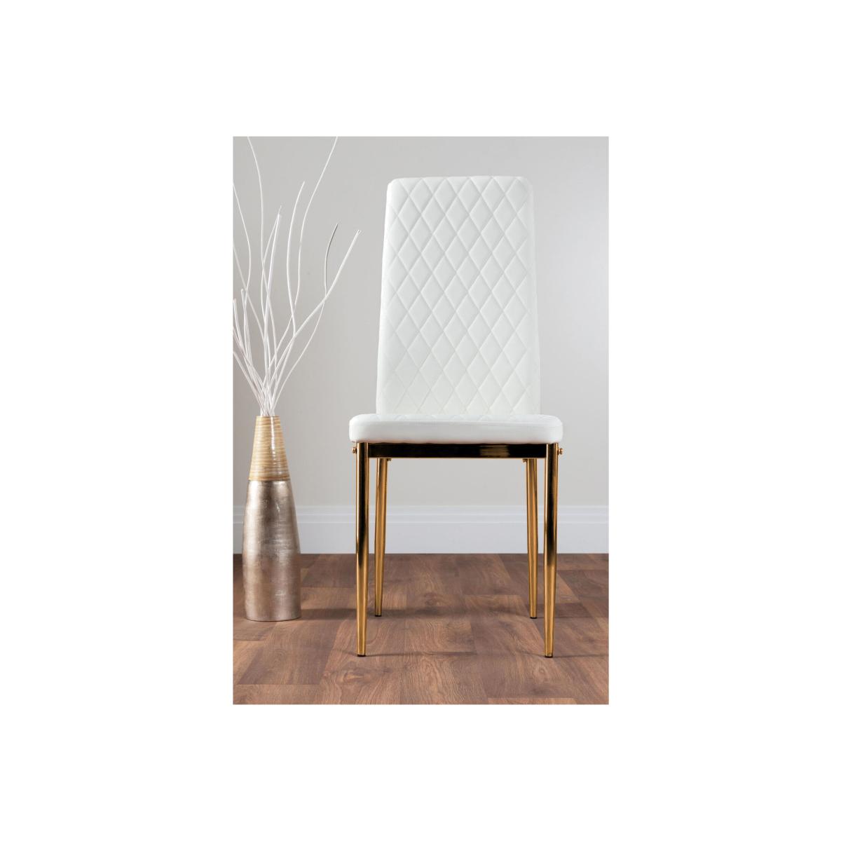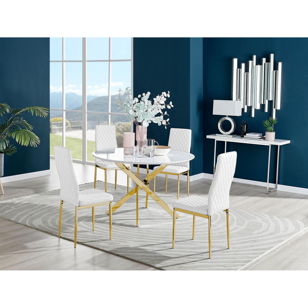 Our popular Novara round dining table here combines a super modern white high-gloss tabletop with shiny gold chrome legs in an eye-catching nested starburst design. A sleek and minimalist dinner table that will bounce light around your dining area and create a sense of space. At 120cm across, this table will comfortably seat up to 6, with round tables also being great for more intimate, relaxed dining and smaller spaces. The strong metal legs not only make this table a real central feature for your room but keep it sturdy. The white gloss table top is smooth and easy to wipe clean too, meaning your Novara will stay looking great for years to come.