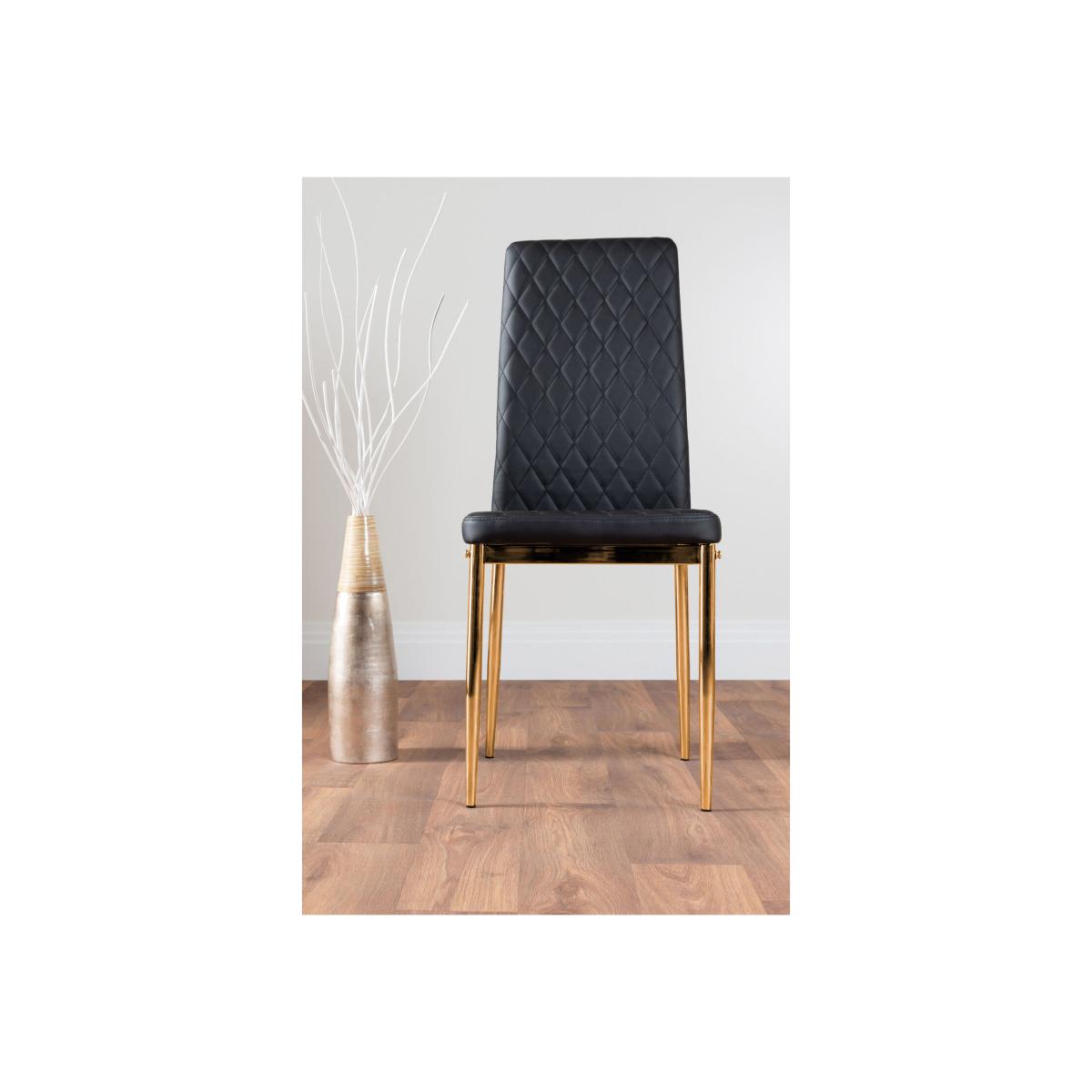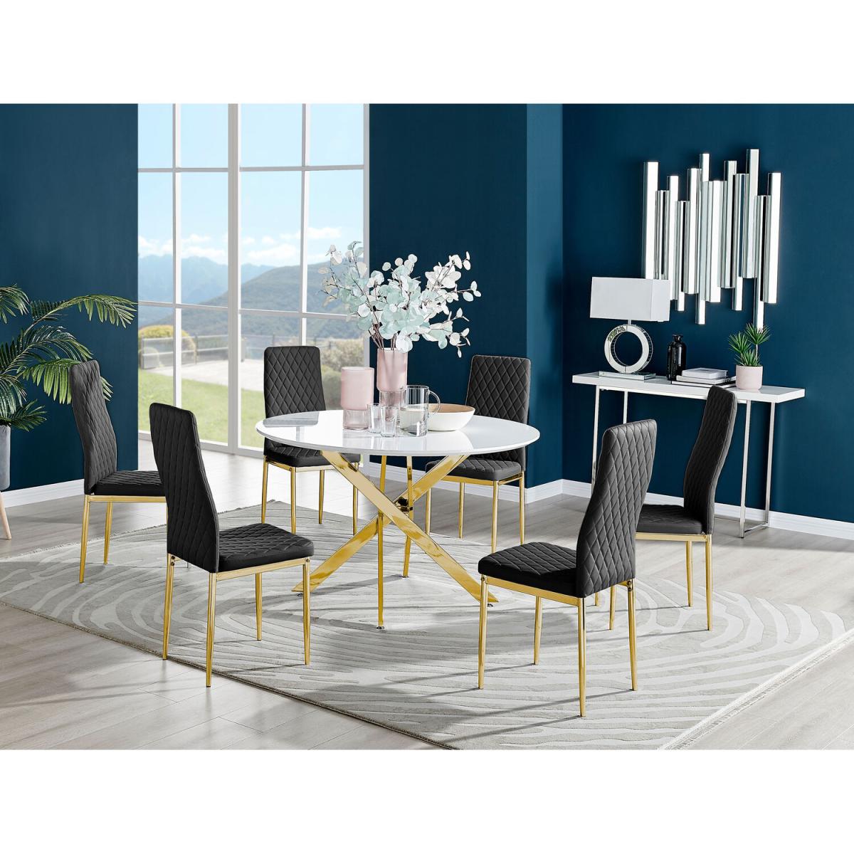 Our popular Novara round dining table here combines a super modern white high-gloss tabletop with shiny gold chrome legs in an eye-catching nested starburst design. A sleek and minimalist dinner table that will bounce light around your dining area and create a sense of space. At 120cm across, this table will comfortably seat up to 6, with round tables also being great for more intimate, relaxed dining and smaller spaces. The strong metal legs not only make this table a real central feature for your room but keep it sturdy. The white gloss table top is smooth and easy to wipe clean too, meaning your Novara will stay looking great for years to come.