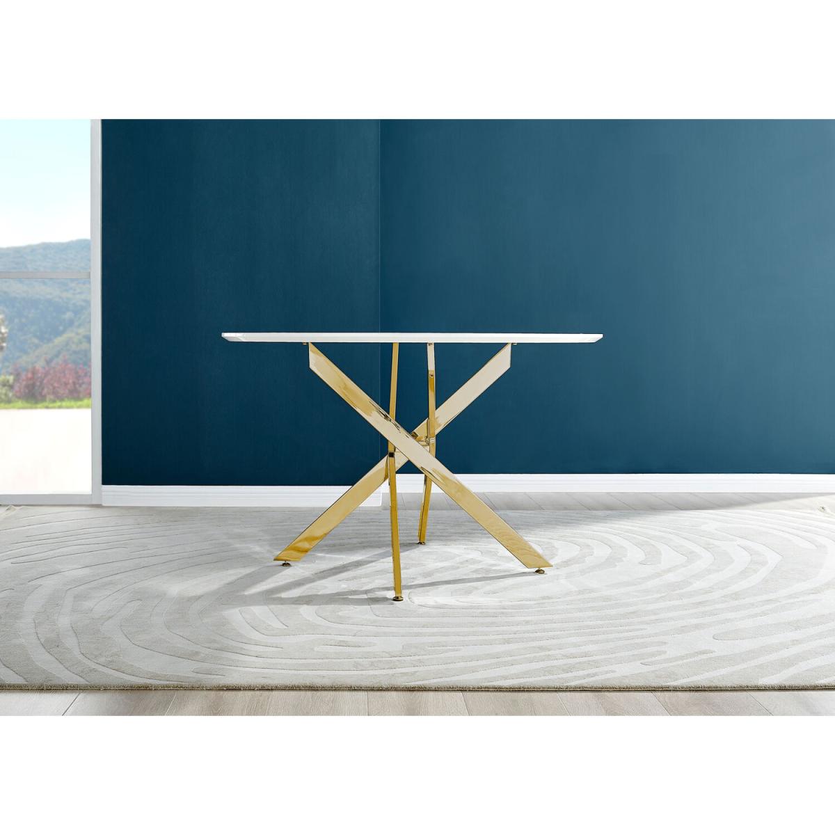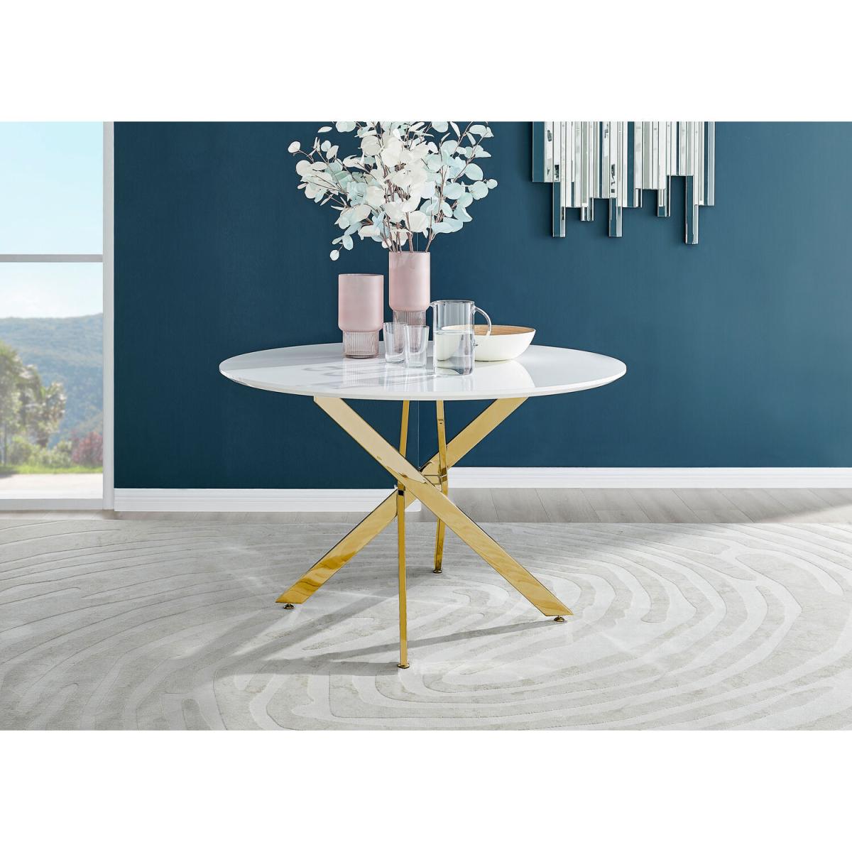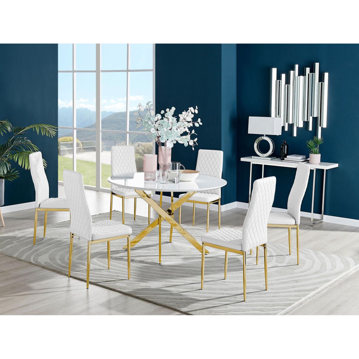 Our popular Novara round dining table here combines a super modern white high-gloss tabletop with shiny gold chrome legs in an eye-catching nested starburst design. A sleek and minimalist dinner table that will bounce light around your dining area and create a sense of space. At 120cm across, this table will comfortably seat up to 6, with round tables also being great for more intimate, relaxed dining and smaller spaces. The strong metal legs not only make this table a real central feature for your room but keep it sturdy. The white gloss table top is smooth and easy to wipe clean too, meaning your Novara will stay looking great for years to come.