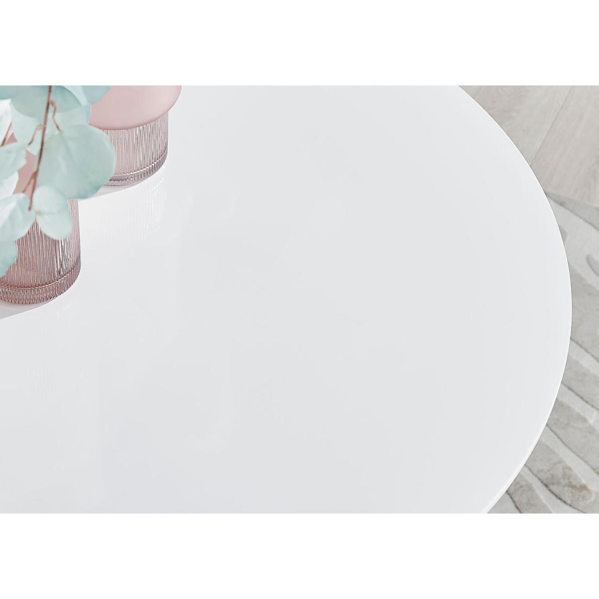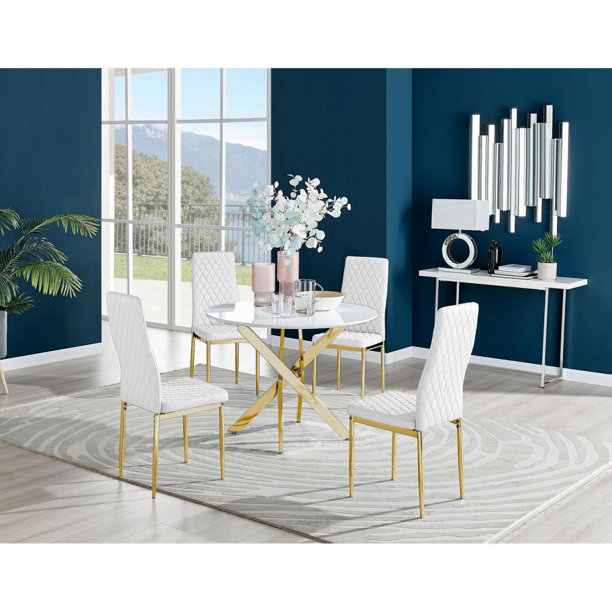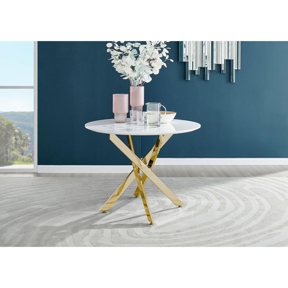 Our popular Novara round dining table here combines a super modern white high-gloss tabletop with shiny gold chrome legs in an eye-catching nested starburst design. A sleek and minimalist dinner table that will bounce light around your dining area and create a sense of space. At 100cm across, this table is perfect for smaller spaces and more intimate, relaxed dining. Seats 2 - 4, making this a great family table that will suit any modern home. The strong metal legs not only make this table a real central feature for your room but keep it sturdy. The white gloss table top is smooth and easy to wipe clean too, meaning your Novara will stay looking great for years to come.