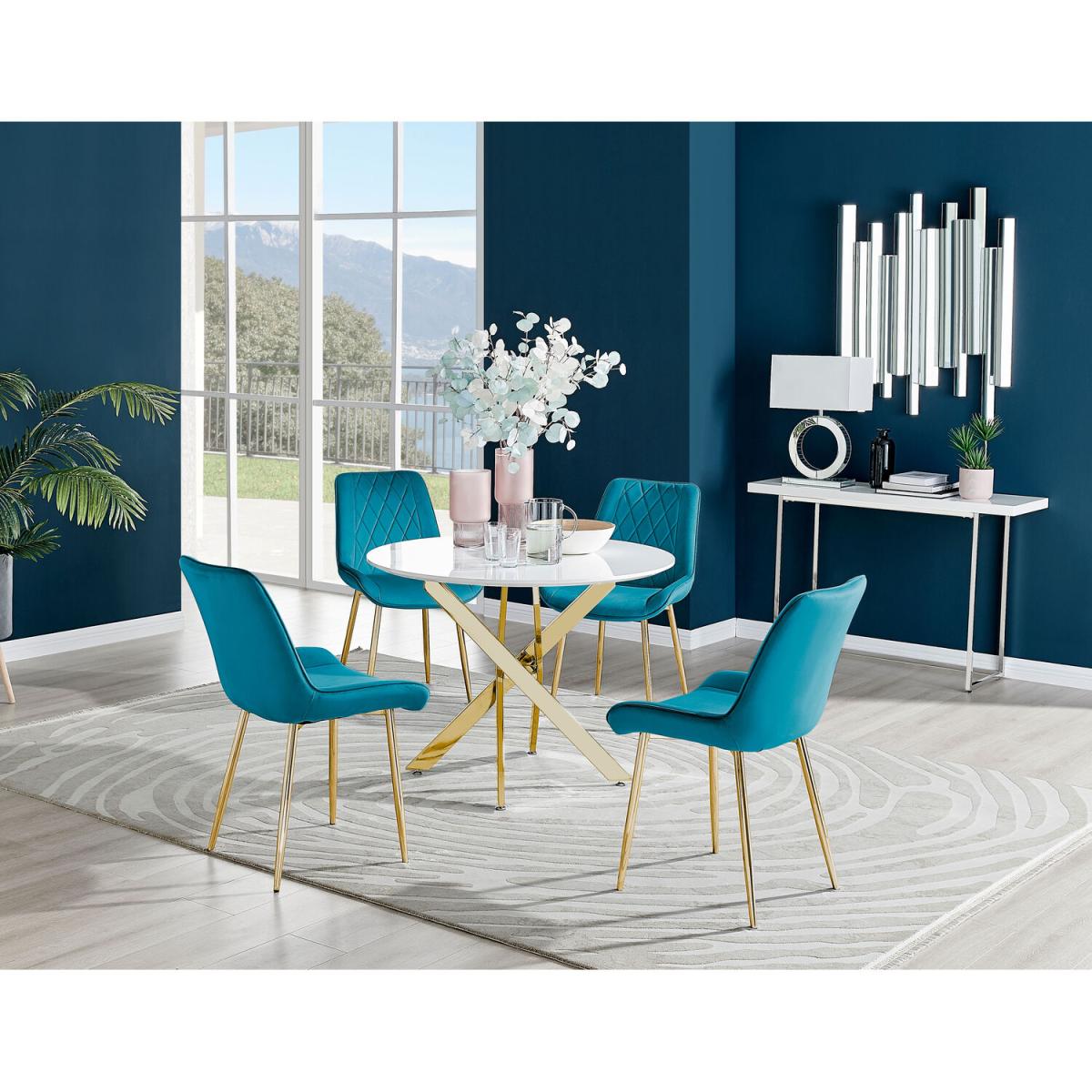 Our popular Novara round dining table here combines a super modern white high-gloss tabletop with shiny gold chrome legs in an eye-catching nested starburst design. A sleek and minimalist dinner table that will bounce light around your dining area and create a sense of space. At 100cm across, this table is perfect for smaller spaces and more intimate, relaxed dining. Seats 2 - 4, making this a great family table that will suit any modern home. The strong metal legs not only make this table a real central feature for your room but keep it sturdy. The white gloss table top is smooth and easy to wipe clean too, meaning your Novara will stay looking great for years to come.