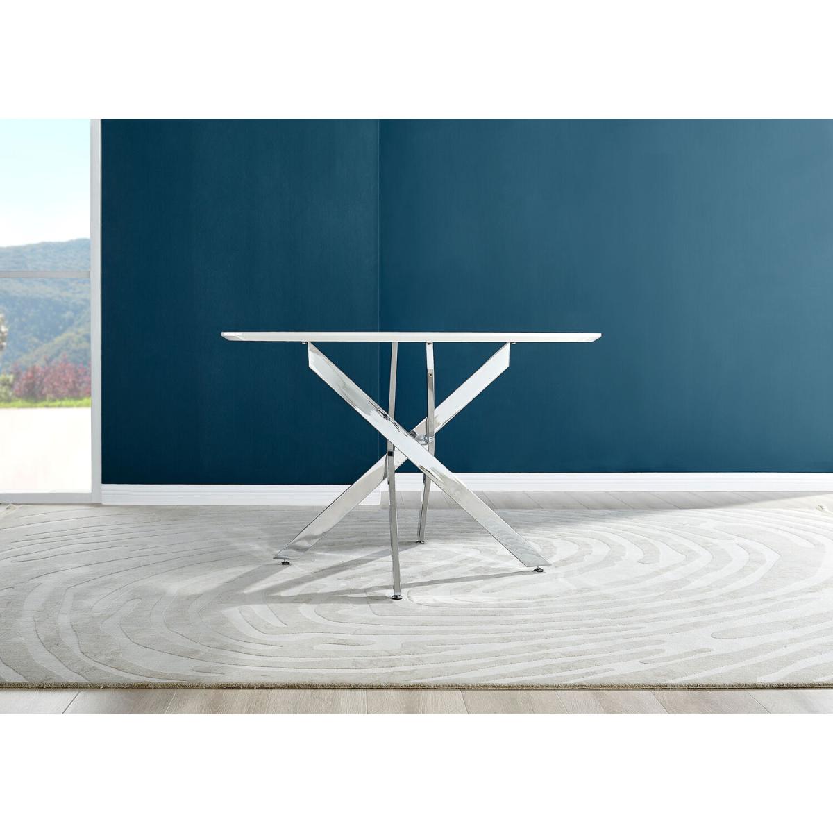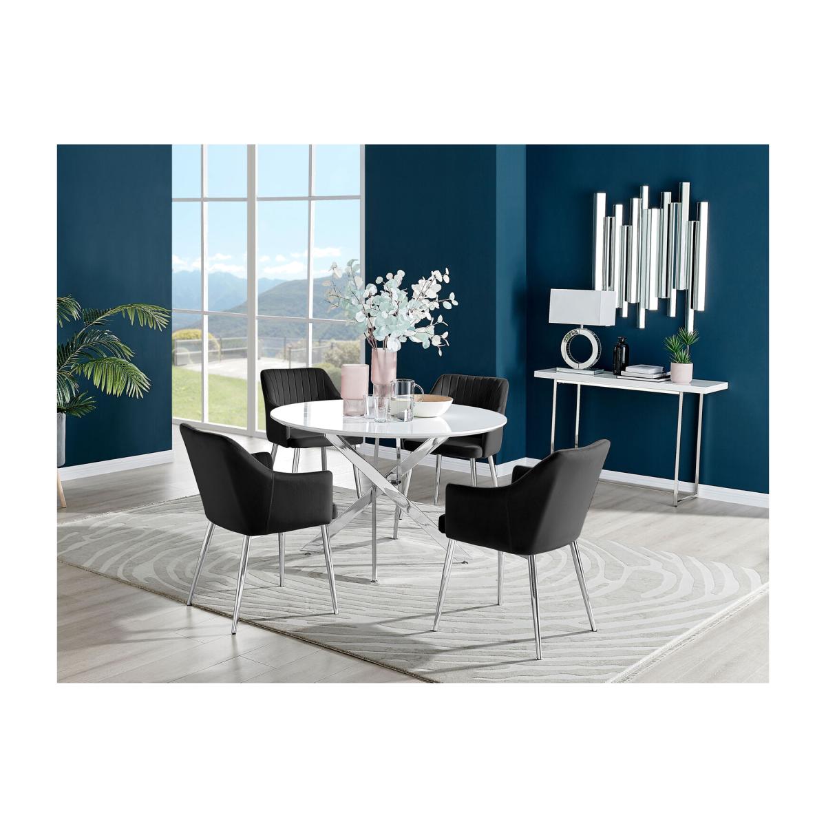 Our popular Novara round dining table here combines a super modern white high-gloss tabletop with shiny silver chrome legs in an eye-catching nested starburst design. A sleek and minimalist dinner table that will bounce light around your dining area and create a sense of space. At 120cm across, this table will comfortably seat up to 6, with round tables also being great for more intimate, relaxed dining and smaller spaces. The strong metal legs not only make this table a real central feature for your room but keep it sturdy. The white gloss table top is smooth and easy to wipe clean too, meaning your Novara will stay looking great for years to come.