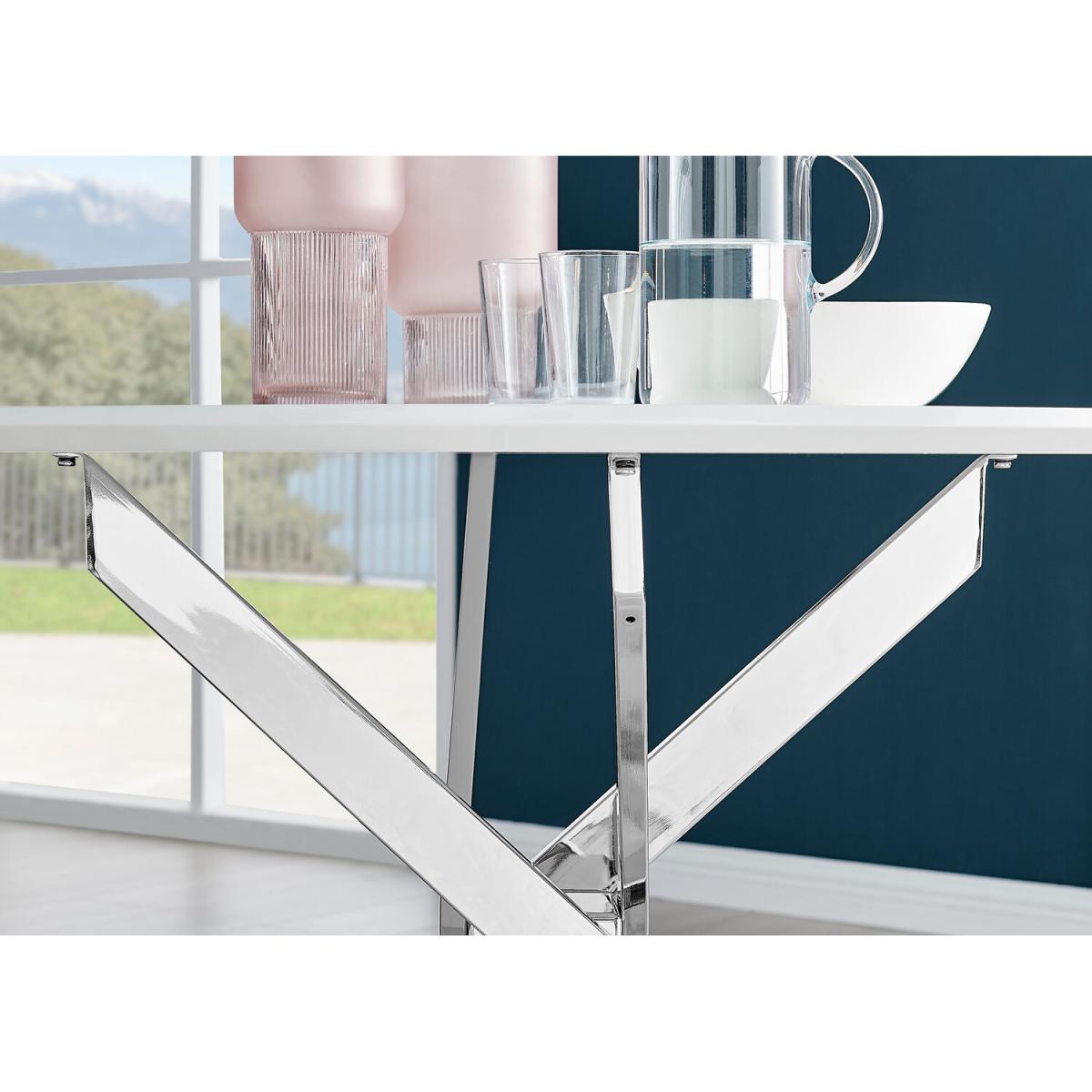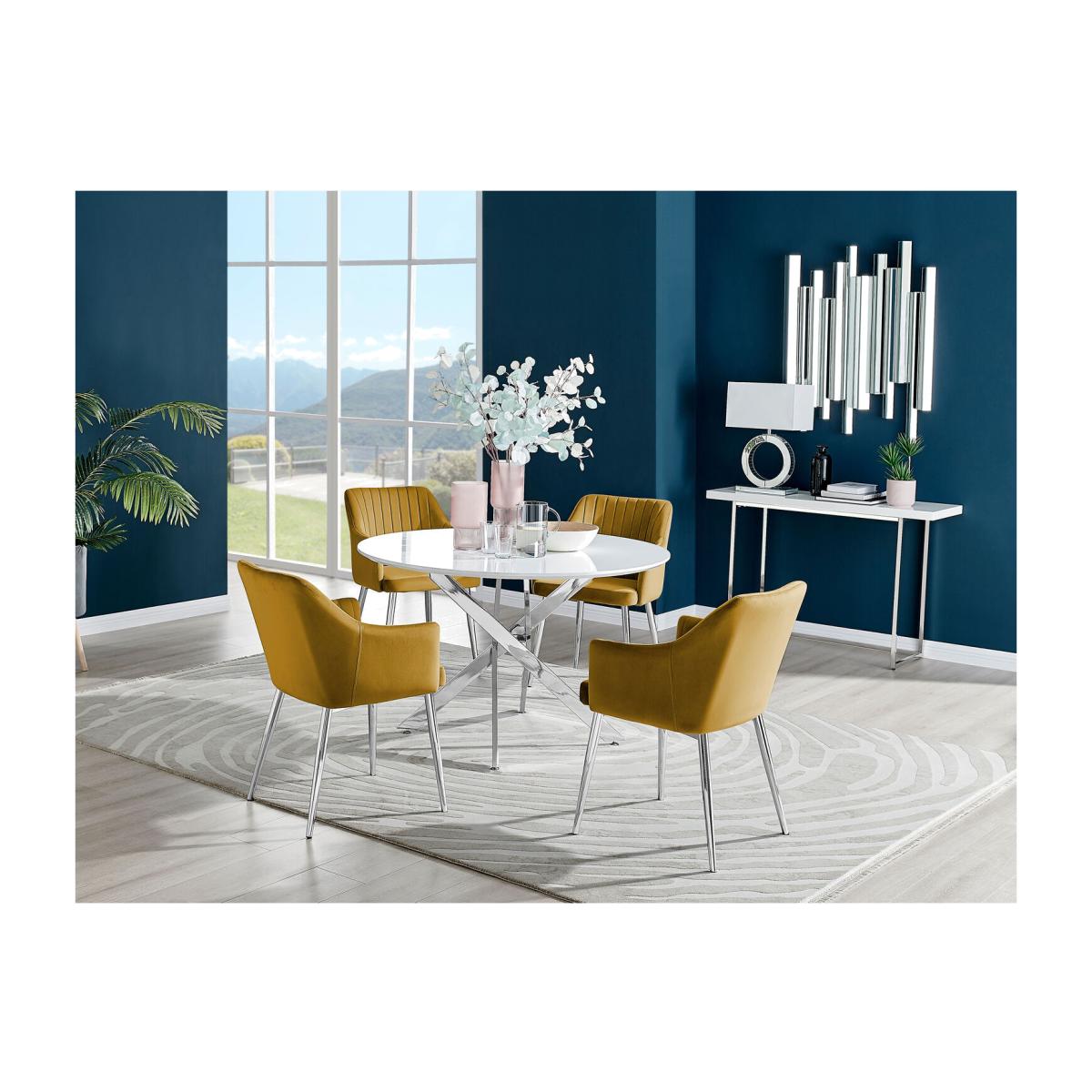 Our popular Novara round dining table here combines a super modern white high-gloss tabletop with shiny silver chrome legs in an eye-catching nested starburst design. A sleek and minimalist dinner table that will bounce light around your dining area and create a sense of space. At 120cm across, this table will comfortably seat up to 6, with round tables also being great for more intimate, relaxed dining and smaller spaces. The strong metal legs not only make this table a real central feature for your room but keep it sturdy. The white gloss table top is smooth and easy to wipe clean too, meaning your Novara will stay looking great for years to come.
