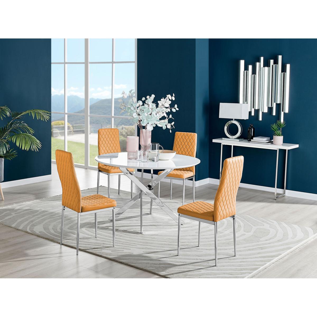 Our popular Novara round dining table here combines a super modern white high-gloss tabletop with shiny silver chrome legs in an eye-catching nested starburst design. A sleek and minimalist dinner table that will bounce light around your dining area and create a sense of space. At 120cm across, this table will comfortably seat up to 6, with round tables also being great for more intimate, relaxed dining and smaller spaces. The strong metal legs not only make this table a real central feature for your room but keep it sturdy. The white gloss table top is smooth and easy to wipe clean too, meaning your Novara will stay looking great for years to come.