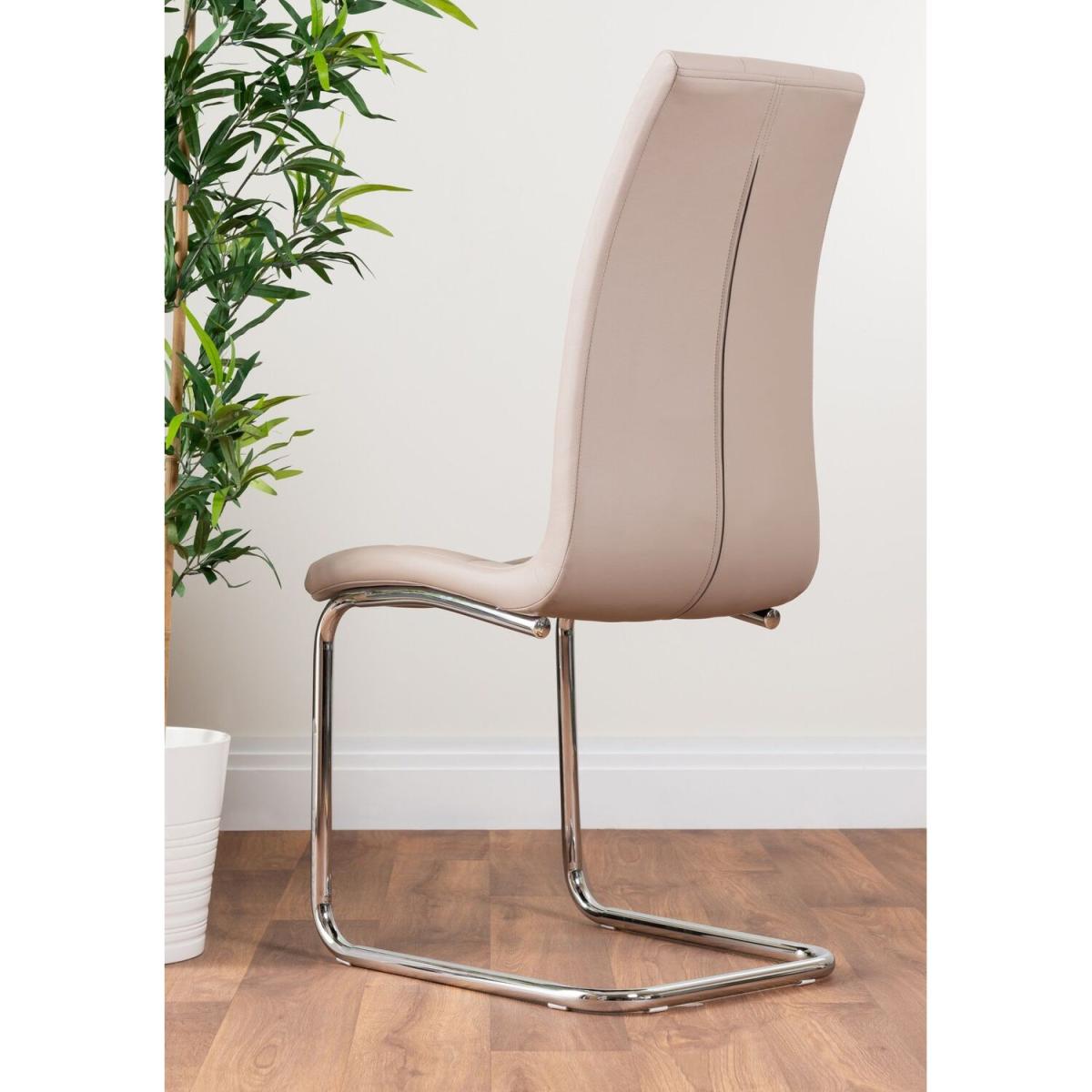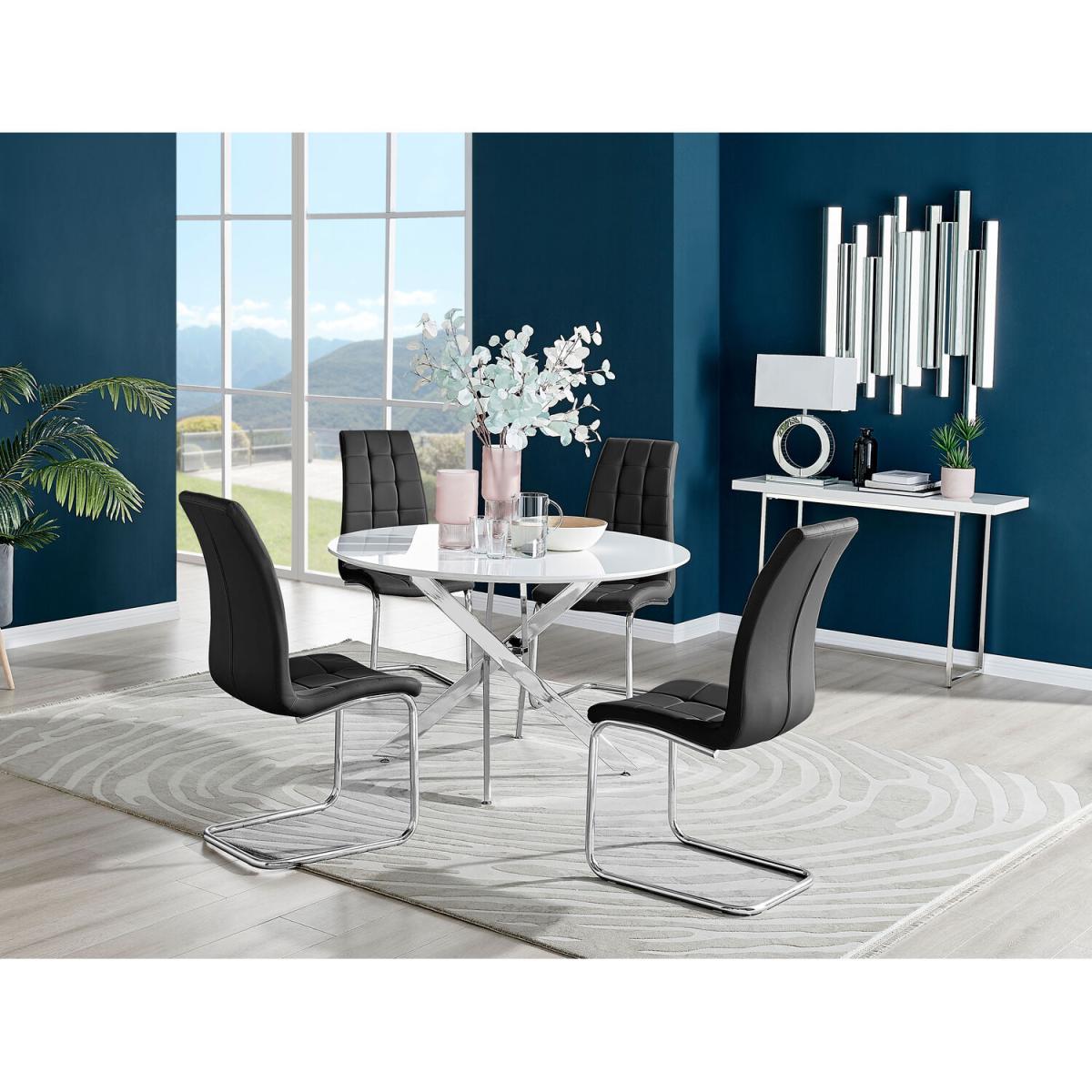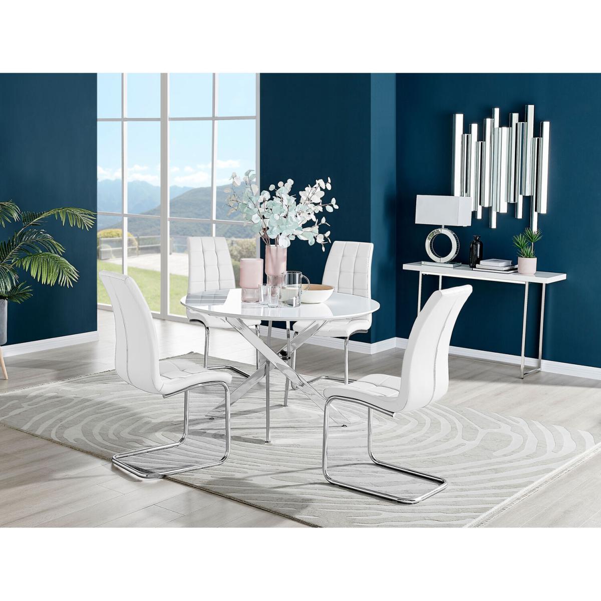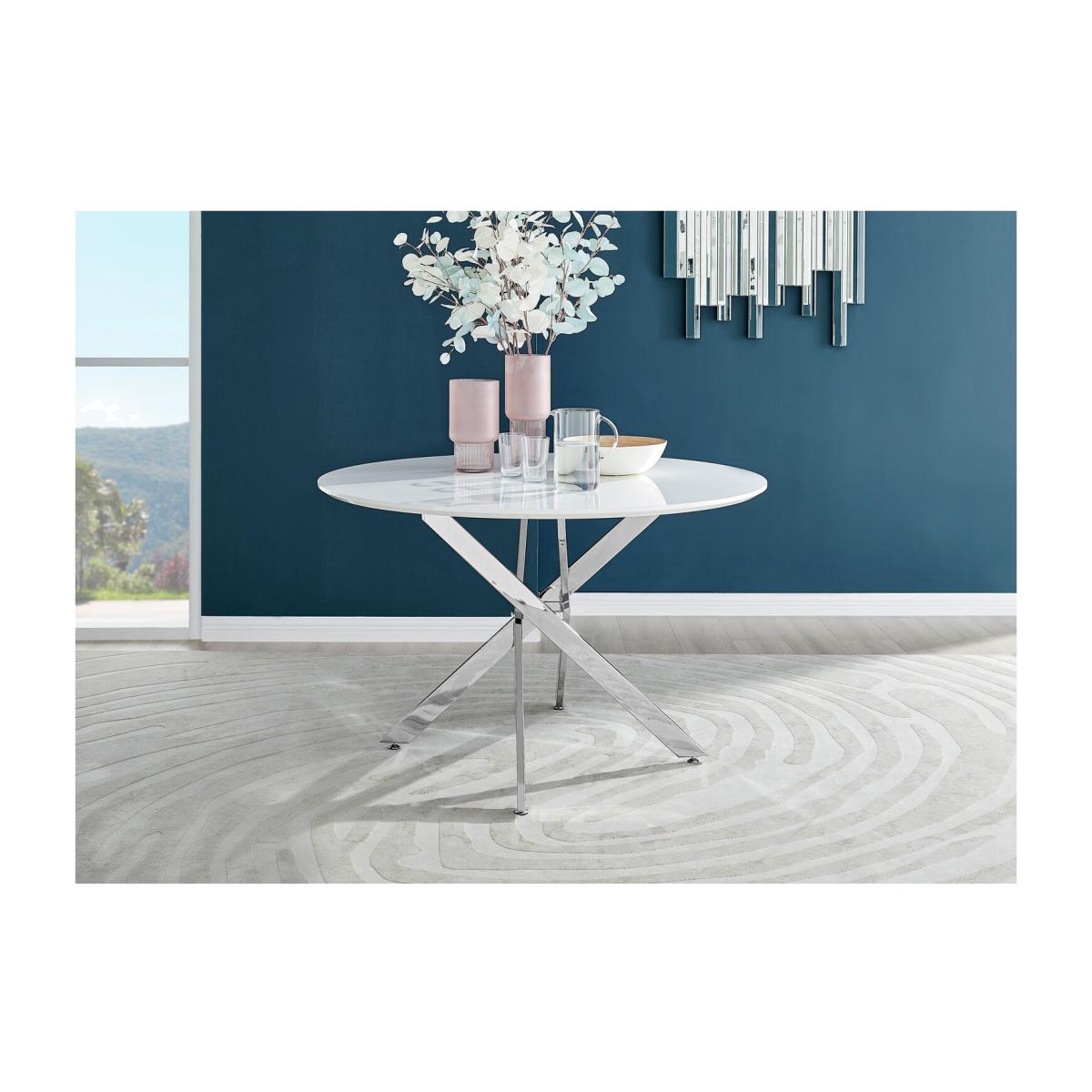 Our popular Novara round dining table here combines a super modern white high-gloss tabletop with shiny silver chrome legs in an eye-catching nested starburst design. A sleek and minimalist dinner table that will bounce light around your dining area and create a sense of space. At 120cm across, this table will comfortably seat up to 6, with round tables also being great for more intimate, relaxed dining and smaller spaces. The strong metal legs not only make this table a real central feature for your room but keep it sturdy. The white gloss table top is smooth and easy to wipe clean too, meaning your Novara will stay looking great for years to come.