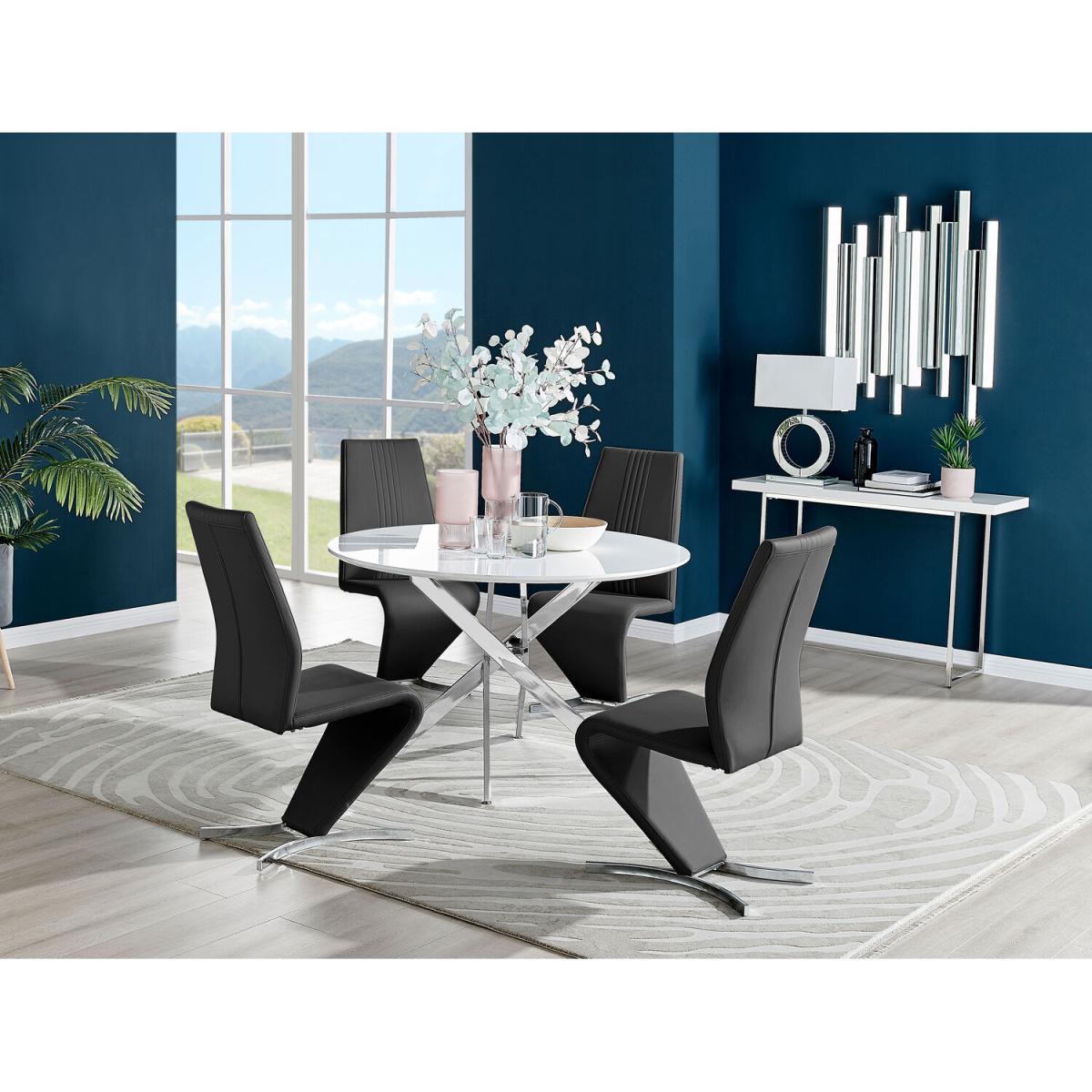 Our popular Novara round dining table here combines a super modern white high-gloss tabletop with shiny silver chrome legs in an eye-catching nested starburst design. A sleek and minimalist dinner table that will bounce light around your dining area and create a sense of space. At 120cm across, this table will comfortably seat up to 6, with round tables also being great for more intimate, relaxed dining and smaller spaces. The strong metal legs not only make this table a real central feature for your room but keep it sturdy. The white gloss table top is smooth and easy to wipe clean too, meaning your Novara will stay looking great for years to come.