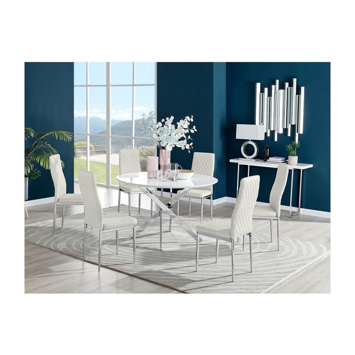 Our popular Novara round dining table here combines a super modern white high-gloss tabletop with shiny silver chrome legs in an eye-catching nested starburst design. A sleek and minimalist dinner table that will bounce light around your dining area and create a sense of space. At 120cm across, this table will comfortably seat up to 6, with round tables also being great for more intimate, relaxed dining and smaller spaces. The strong metal legs not only make this table a real central feature for your room but keep it sturdy. The white gloss table top is smooth and easy to wipe clean too, meaning your Novara will stay looking great for years to come. Also available in a smaller 100cm size and in arrange of other leg and tabletop finishes, with matching side tables, consoles and coffee tables, so be sure to check out the full Novara range! Upholstered in soft touch cream velvet and finished with diamond pattern stitching the Milan dining chairs would seamlessly fit in with most dining spaces, whilst not compromising on either style or comfort. The stylish shiny chrome silver leg and hatched velvet combination gives this chair a contemporary edge, whilst it's simple design allows for practical everyday usage. The chairs are made from high quality durable velvet that's easy to keep clean and are ergonomically designed for maximum comfort and support. They feature a deep foam seat cushion and plastic feet to protect the floor from any damage! At an unbeatable price you cannot go wrong with these chairs!