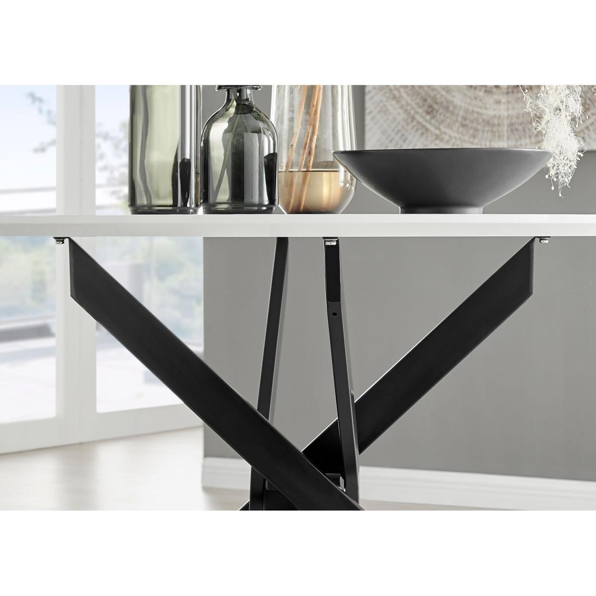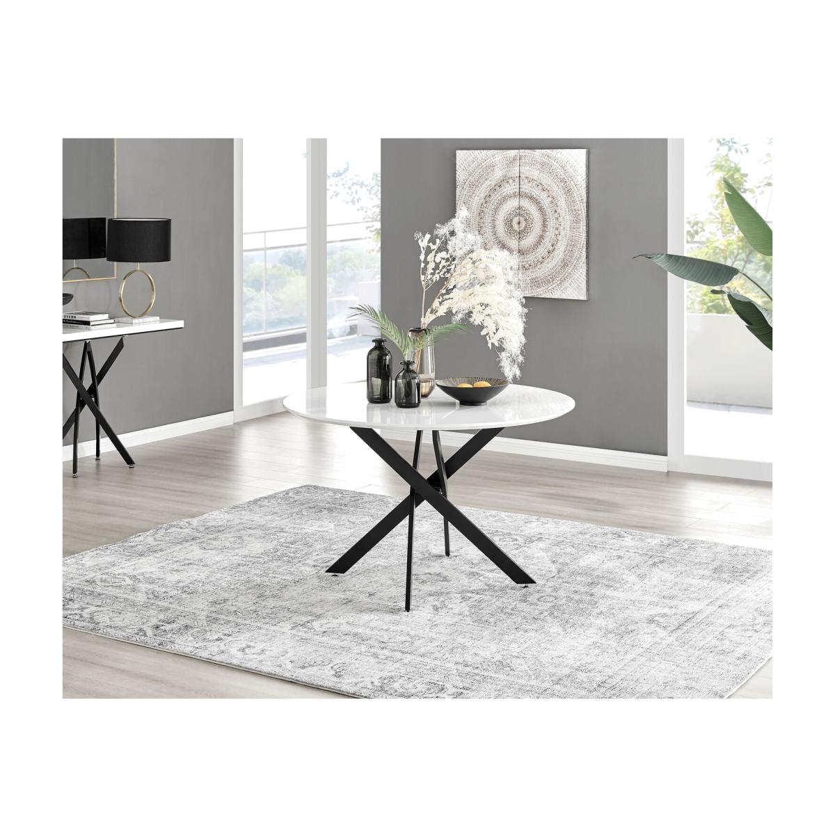 Our popular Novara round dining table here combines a super modern white high-gloss tabletop with chic matte black metal legs in an eye-catching nested starburst design. A sleek and minimalist dinner table with Industrial touches. The white tabletop and open space around the legs still keeps this table feeling light and airy. At 120cm across, this table will comfortably seat up to 6, with round tables also being great for more intimate, relaxed dining and smaller spaces.