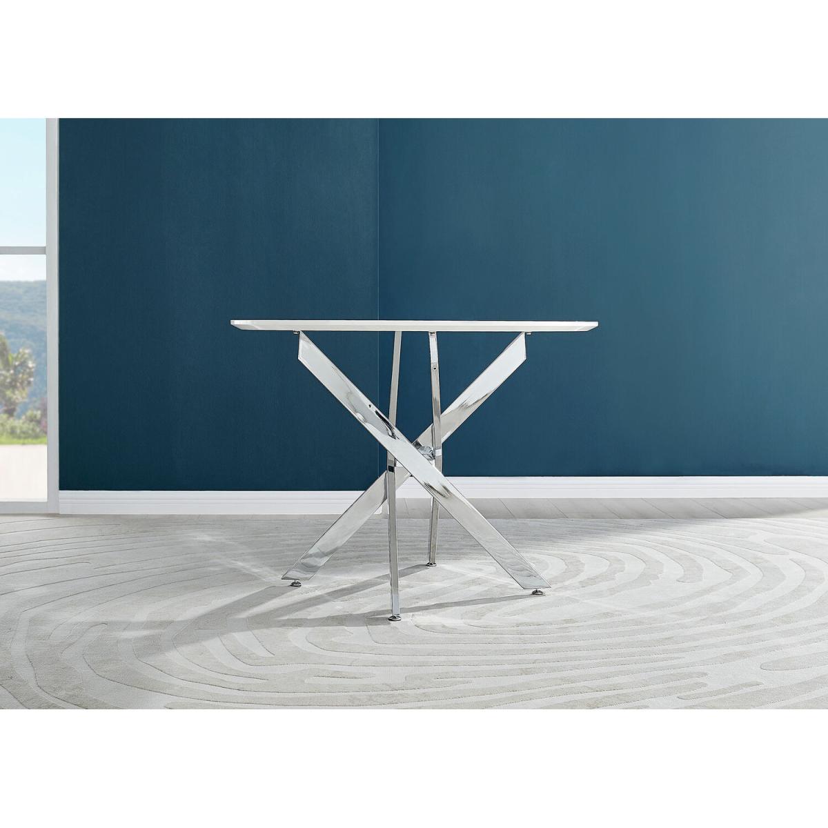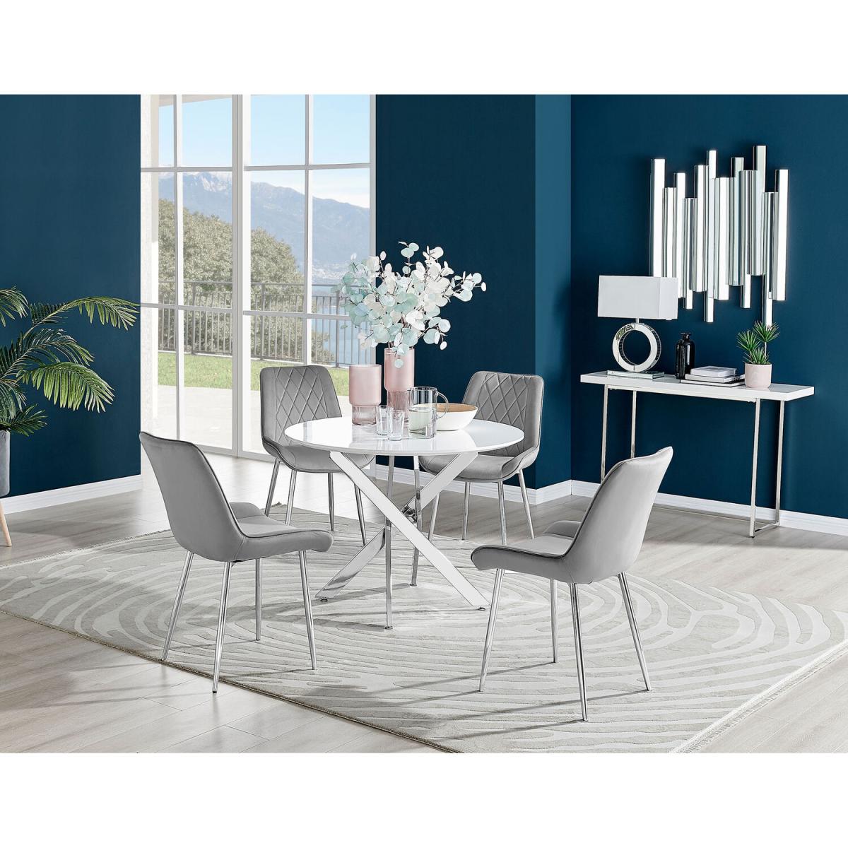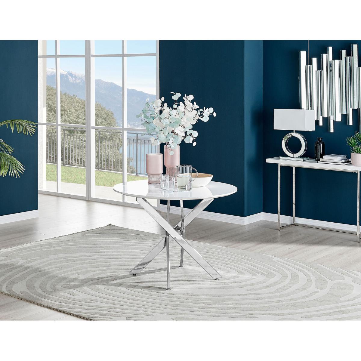 Our popular Novara round dining table here combines a super modern white high-gloss tabletop with shiny silver chrome legs in an eye-catching nested starburst design. A sleek and minimalist dinner table that will bounce light around your dining area and create a sense of space. At 100cm across, this table is perfect for smaller spaces and more intimate, relaxed dining. Seats 2 - 4, making this a great family table that will suit any modern home. The strong metal legs not only make this table a real central feature for your room but keep it sturdy. The white gloss table top is smooth and easy to wipe clean too, meaning your Novara will stay looking great for years to come.