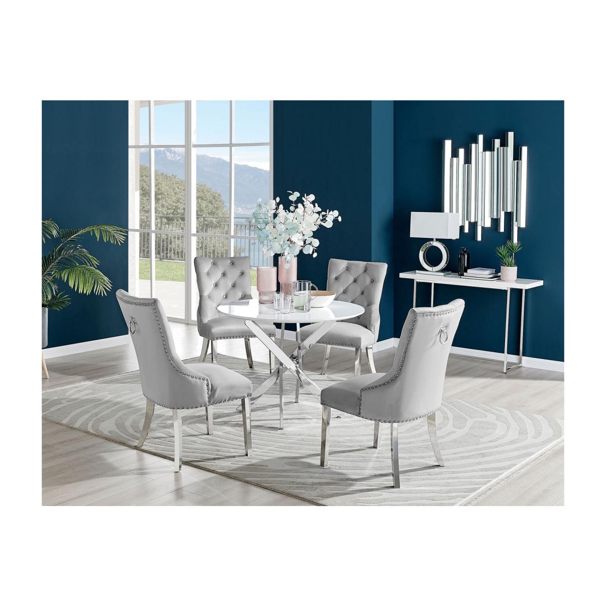 Our popular Novara round dining table here combines a super modern white high-gloss tabletop with shiny silver chrome legs in an eye-catching nested starburst design. A sleek and minimalist dinner table that will bounce light around your dining area and create a sense of space. At 100cm across, this table is perfect for smaller spaces and more intimate, relaxed dining. Seats 2 - 4, making this a great family table that will suit any modern home. The Belgravia velvet knocker back dining chair is the ultimate in dining chair opulence with its scoop back design that allows you and your guests to lean back and feel supported by the wrap-around arms. Stylish Chesterfield-inspired button tufting and diamond stitching add to the modern chic look. The design gives us straight lines and soft padded curves contemporary and comfortable.