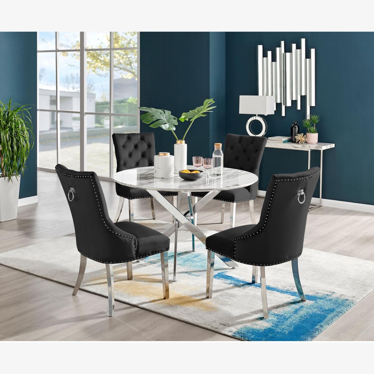 Our popular Novara round dining table here combines a super modern white marble effect tabletop with shiny silver chrome legs in an eye-catching nested starburst design. A sleek and minimalist dinner table that will bounce light around your dining area and create a sense of space. At 120cm across, this table will comfortably seat up to 6, with round tables also being great for more intimate, relaxed dining and smaller spaces. The Belgravia velvet knocker dining chair is the ultimate in dining chair opulence with its scoop back design that allows you and your guests to lean back and feel supported by the wrap-around arms. Stylish Chesterfield-inspired button tufting and diamond stitching add to the modern chic look. The design gives us straight lines and soft padded curves contemporary and comfortable.