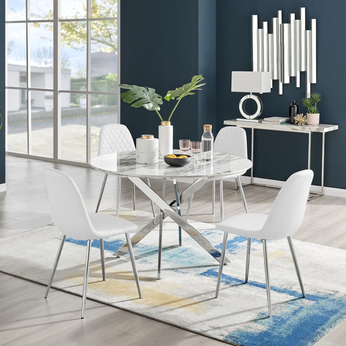 Our popular Novara round dining table here combines a super modern white marble effect tabletop with shiny silver chrome legs in an eye-catching nested starburst design. A sleek and minimalist dinner table that will bounce light around your dining area and create a sense of space. At 120cm across, this table will comfortably seat up to 6, with round tables also being great for more intimate, relaxed dining and smaller spaces. The strong metal legs not only make this table a real central feature for your room but keep it sturdy. The white marble effect veneer is very on-trend right now and easy to wipe clean too, meaning your Novara will stay looking great for years to come.