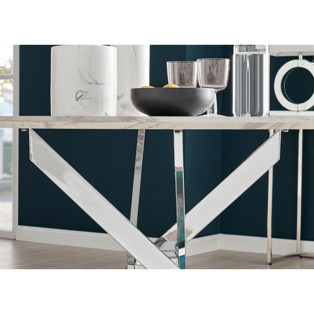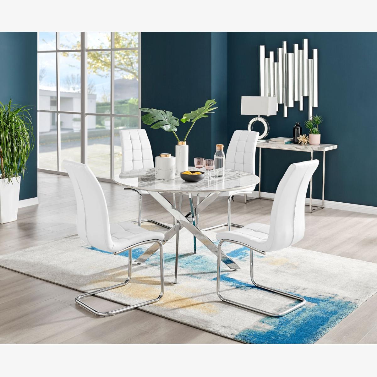 Our popular Novara round dining table here combines a super modern white marble effect tabletop with shiny silver chrome legs in an eye-catching nested starburst design. A sleek and minimalist dinner table that will bounce light around your dining area and create a sense of space. At 120cm across, this table will comfortably seat up to 6, with round tables also being great for more intimate, relaxed dining and smaller spaces. The strong metal legs not only make this table a real central feature for your room but keep it sturdy. The white marble effect veneer is very on-trend right now and easy to wipe clean too, meaning your Novara will stay looking great for years to come.