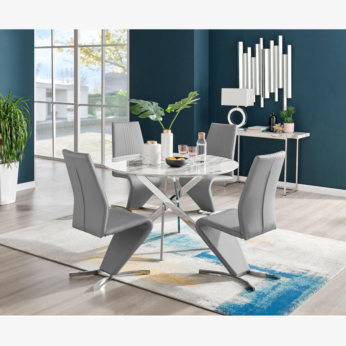Our popular Novara round dining table here combines a super modern white marble effect tabletop with shiny silver chrome legs in an eye-catching nested starburst design. A sleek and minimalist dinner table that will bounce light around your dining area and create a sense of space. At 120cm across, this table will comfortably seat up to 6, with round tables also being great for more intimate, relaxed dining and smaller spaces. The strong metal legs not only make this table a real central feature for your room but keep it sturdy. The white marble effect veneer is very on-trend right now and easy to wipe clean too, meaning your Novara will stay looking great for years to come.
