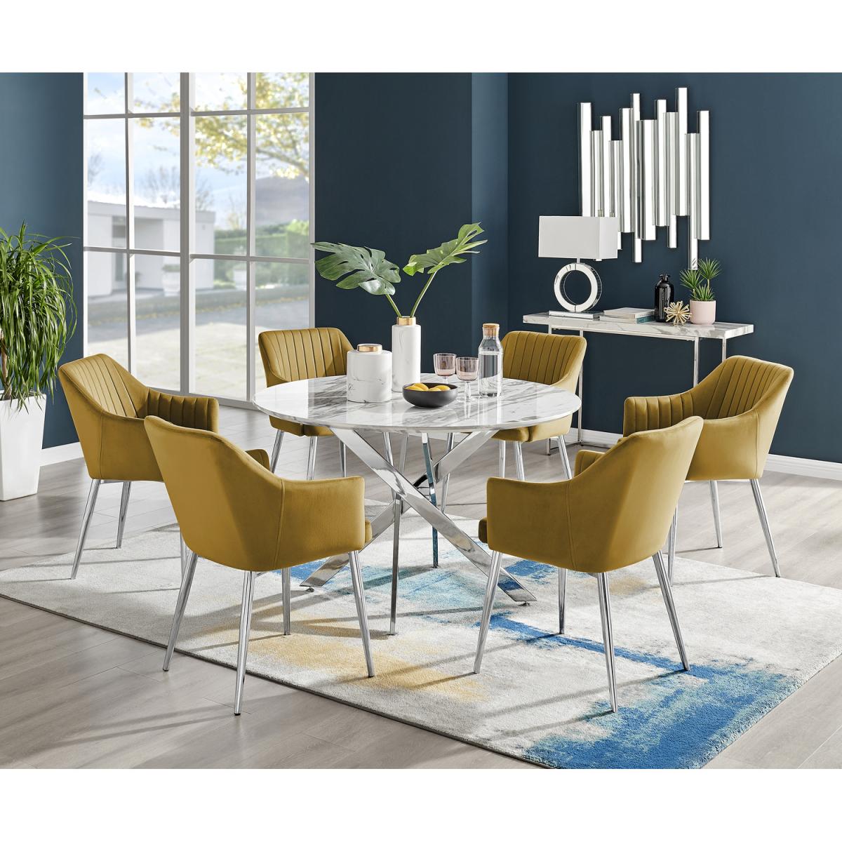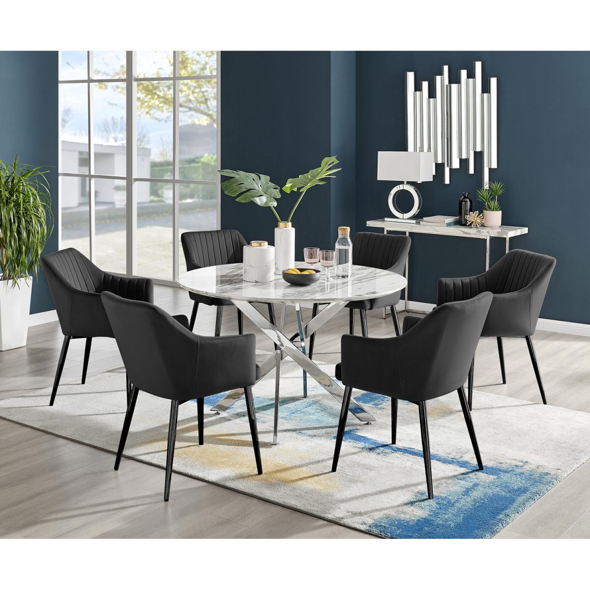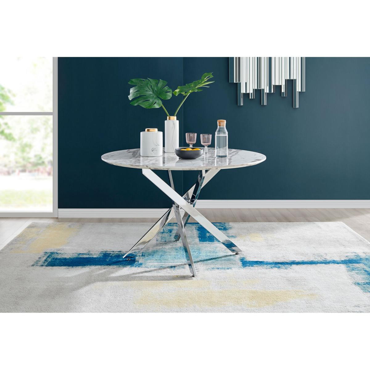 Our popular Novara round dining table here combines a super modern white marble effect tabletop with shiny silver chrome legs in an eye-catching nested starburst design. A sleek and minimalist dinner table that will bounce light around your dining area and create a sense of space. At 120cm across, this table will comfortably seat up to 6, with round tables also being great for more intimate, relaxed dining and smaller spaces. The strong metal legs not only make this table a real central feature for your room but keep it sturdy. The white marble effect veneer is very on-trend right now and easy to wipe clean too, meaning your Novara will stay looking great for years to come.