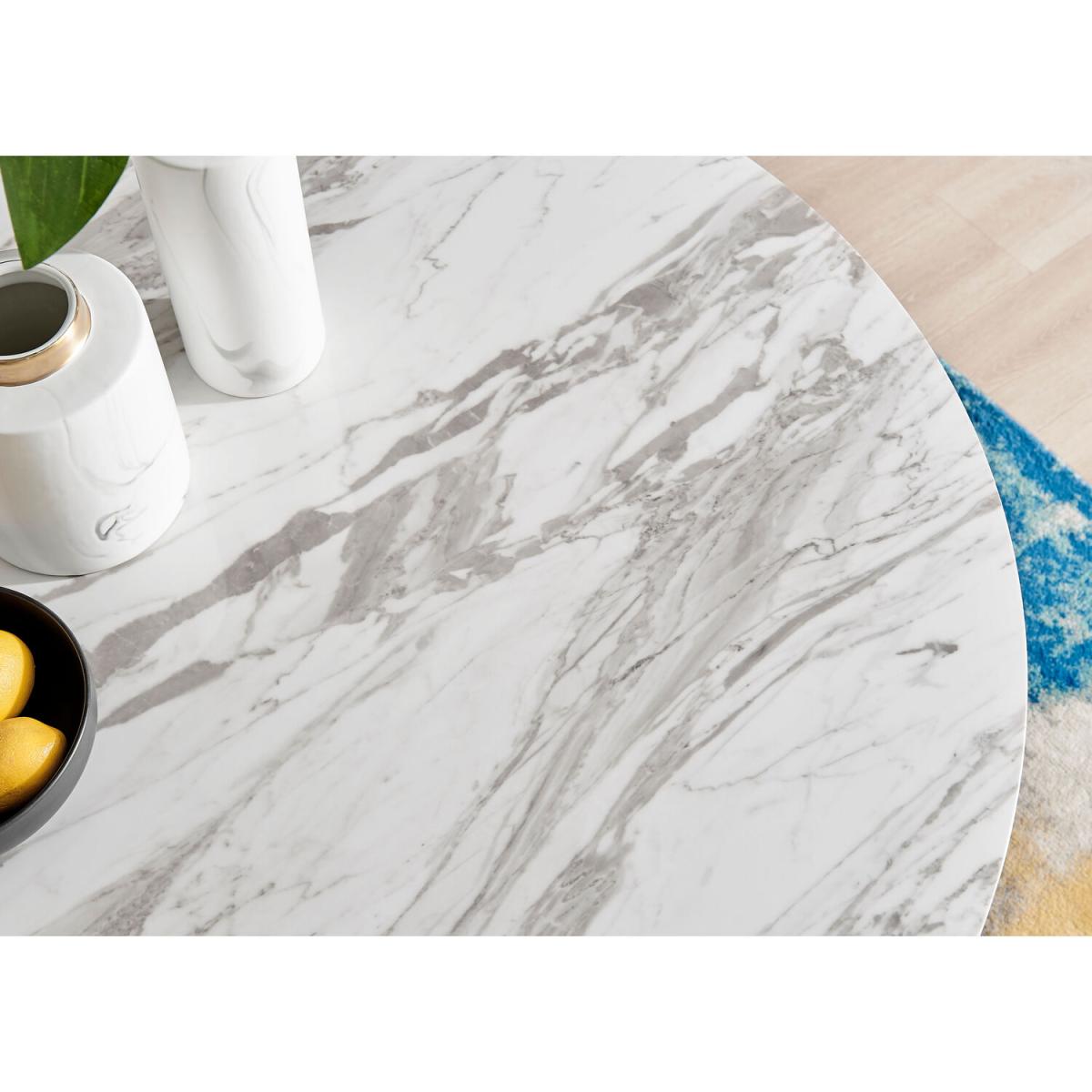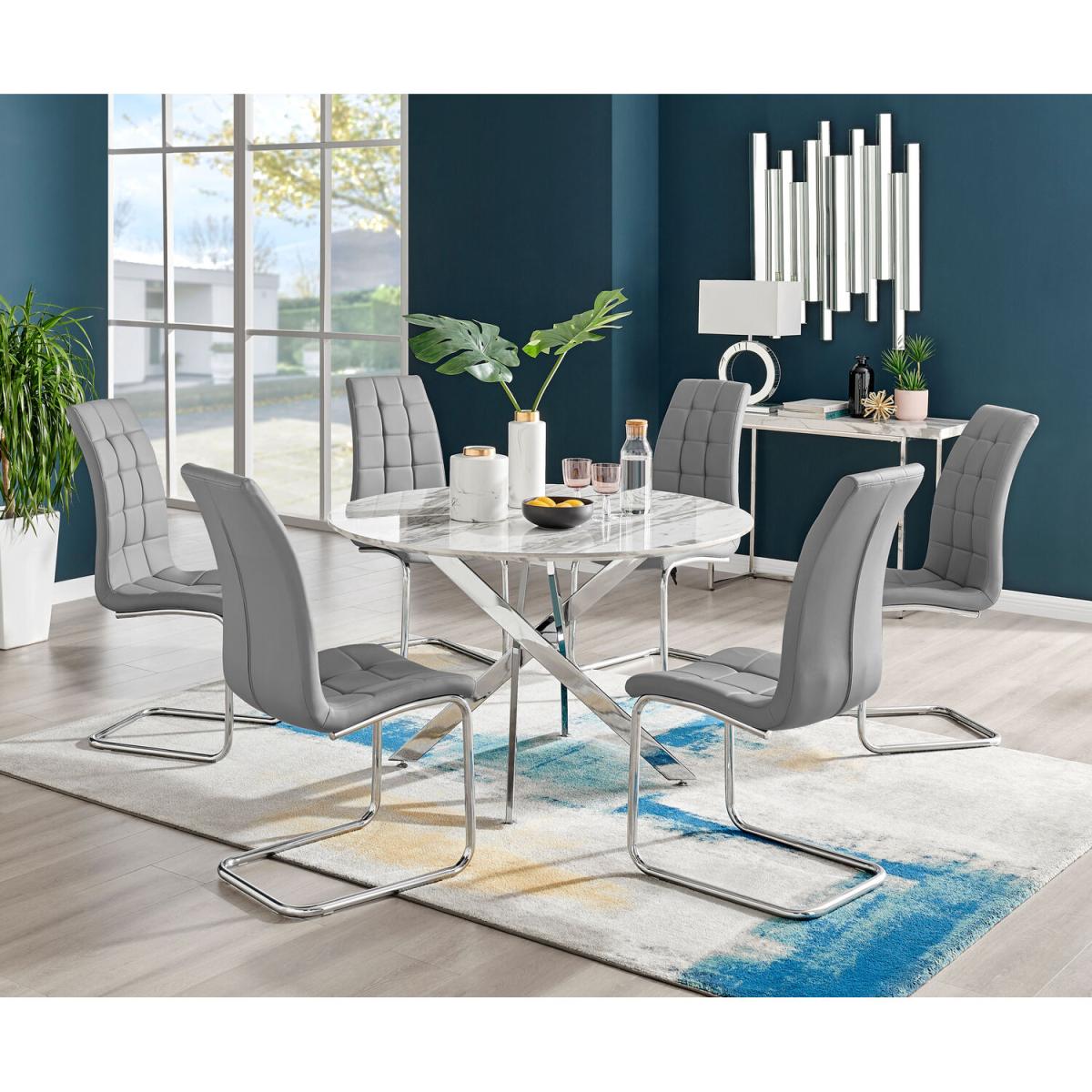 Our popular Novara round dining table here combines a super modern white marble effect tabletop with shiny silver chrome legs in an eye-catching nested starburst design. A sleek and minimalist dinner table that will bounce light around your dining area and create a sense of space. At 120cm across, this table will comfortably seat up to 6, with round tables also being great for more intimate, relaxed dining and smaller spaces. The strong metal legs not only make this table a real central feature for your room but keep it sturdy. The white marble effect veneer is very on-trend right now and easy to wipe clean too, meaning your Novara will stay looking great for years to come.