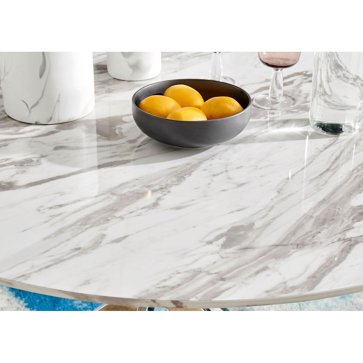 Our popular Novara round dining table here combines a super modern white marble effect tabletop with shiny silver chrome legs in an eye-catching nested starburst design. A sleek and minimalist dinner table that will bounce light around your dining area and create a sense of space. At 120cm across, this table will comfortably seat up to 6, with round tables also being great for more intimate, relaxed dining and smaller spaces. The strong metal legs not only make this table a real central feature for your room but keep it sturdy. The white marble effect veneer is very on-trend right now and easy to wipe clean too, meaning your Novara will stay looking great for years to come.
