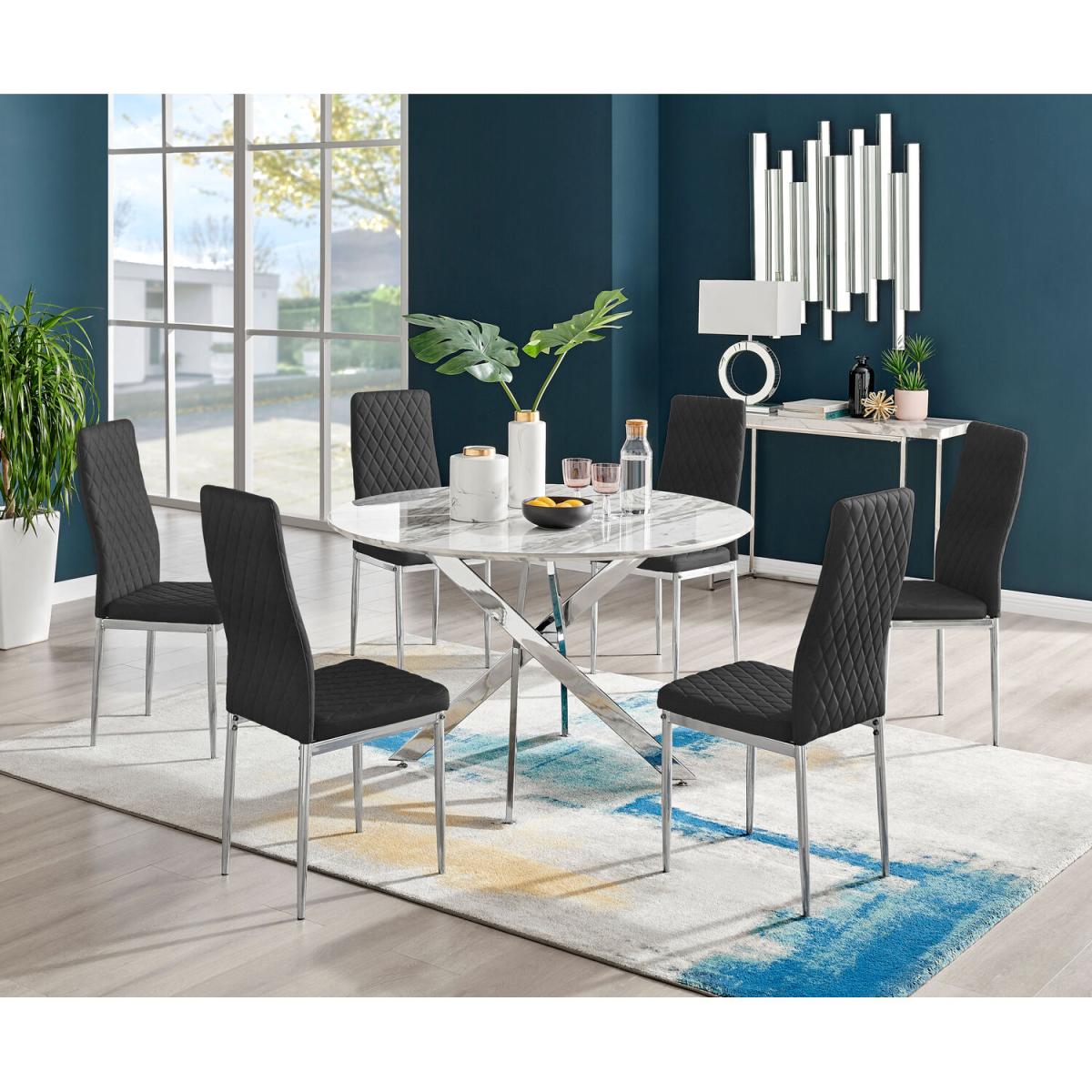 Our popular Novara round dining table here combines a super modern white marble effect tabletop with shiny silver chrome legs in an eye-catching nested starburst design. A sleek and minimalist dinner table that will bounce light around your dining area and create a sense of space. At 120cm across, this table will comfortably seat up to 6, with round tables also being great for more intimate, relaxed dining and smaller spaces. The strong metal legs not only make this table a real central feature for your room but keep it sturdy. The white marble effect veneer is very on-trend right now and easy to wipe clean too, meaning your Novara will stay looking great for years to come. Also available in a smaller 100cm size with range of other leg and tabletop finishes, and with matching side tables, consoles and coffee tables, so be sure to check out the full Novara range! Upholstered in soft touch black velvet and finished with diamond pattern stitching the Milan dining chairs would seamlessly fit in with most dining spaces, whilst not compromising on either style or comfort. The stylish shiny chrome silver leg and hatched velvet combination gives this chair a contemporary edge, whilst it's simple design allows for practical everyday usage. The chairs are made from high quality durable velvet that's easy to keep clean and are ergonomically designed for maximum comfort and support. They feature a deep foam seat cushion and plastic feet to protect the floor from any damage! At an unbeatable price you cannot go wrong with these chairs!