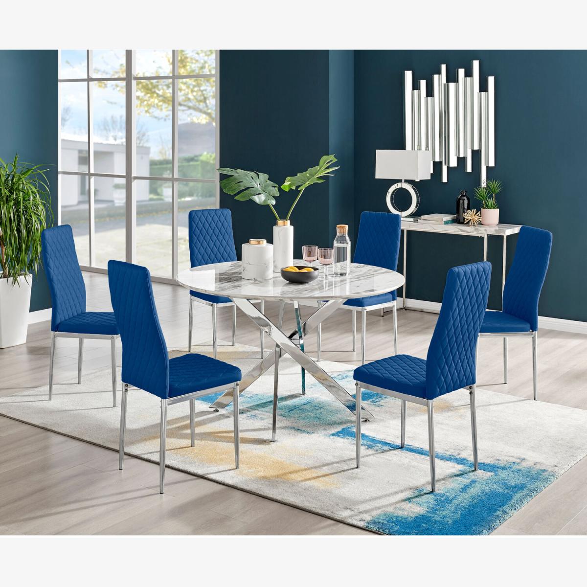 Our popular Novara round dining table here combines a super modern white marble effect tabletop with shiny silver chrome legs in an eye-catching nested starburst design. A sleek and minimalist dinner table that will bounce light around your dining area and create a sense of space. At 120cm across, this table will comfortably seat up to 6, with round tables also being great for more intimate, relaxed dining and smaller spaces. The strong metal legs not only make this table a real central feature for your room but keep it sturdy. The white marble effect veneer is very on-trend right now and easy to wipe clean too, meaning your Novara will stay looking great for years to come. Also available in a smaller 100cm size with range of other leg and tabletop finishes, and with matching side tables, consoles and coffee tables, so be sure to check out the full Novara range! Upholstered in soft touch navy blue velvet and finished with diamond pattern stitching the Milan dining chairs would seamlessly fit in with most dining spaces, whilst not compromising on either style or comfort. The stylish shiny chrome silver leg and hatched velvet combination gives this chair a contemporary edge, whilst it's simple design allows for practical everyday usage. The chairs are made from high quality durable velvet that's easy to keep clean and are ergonomically designed for maximum comfort and support. They feature a deep foam seat cushion and plastic feet to protect the floor from any damage! At an unbeatable price you cannot go wrong with these chairs!