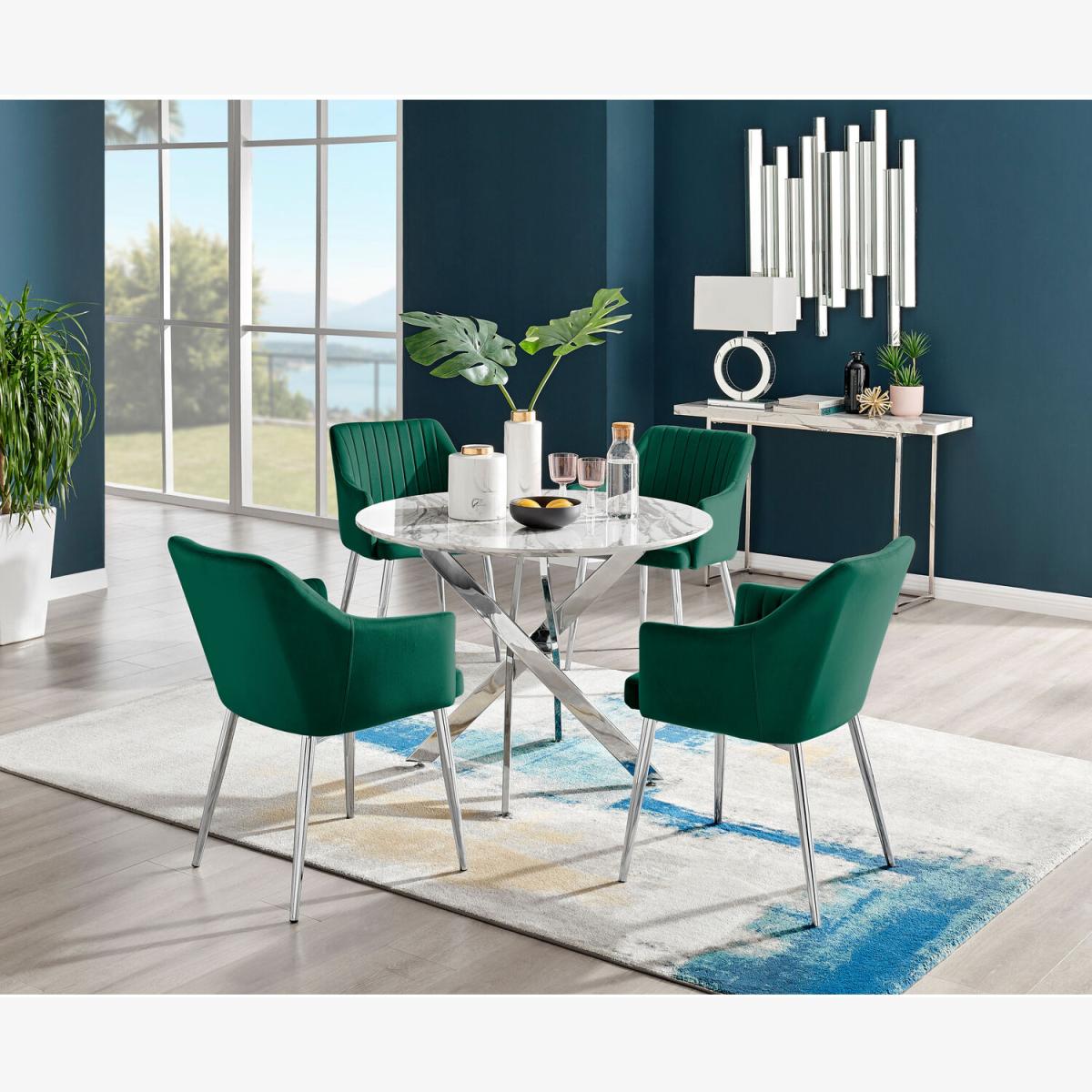 Our popular Novara round dining table here combines a super modern white marble effect tabletop with shiny silver chrome legs in an eye-catching nested starburst design. A sleek and minimalist dinner table that will bounce light around your dining area and create a sense of space. At 100cm across, this table is perfect for smaller spaces and more intimate, relaxed dining. Seats 2 - 4, making this a great family table that will suit any modern home. The strong metal legs not only make this table a real central feature for your room but keep it sturdy. The white marble effect veneer is very on-trend right now and easy to wipe clean too, meaning your Novara will stay looking great for years to come.