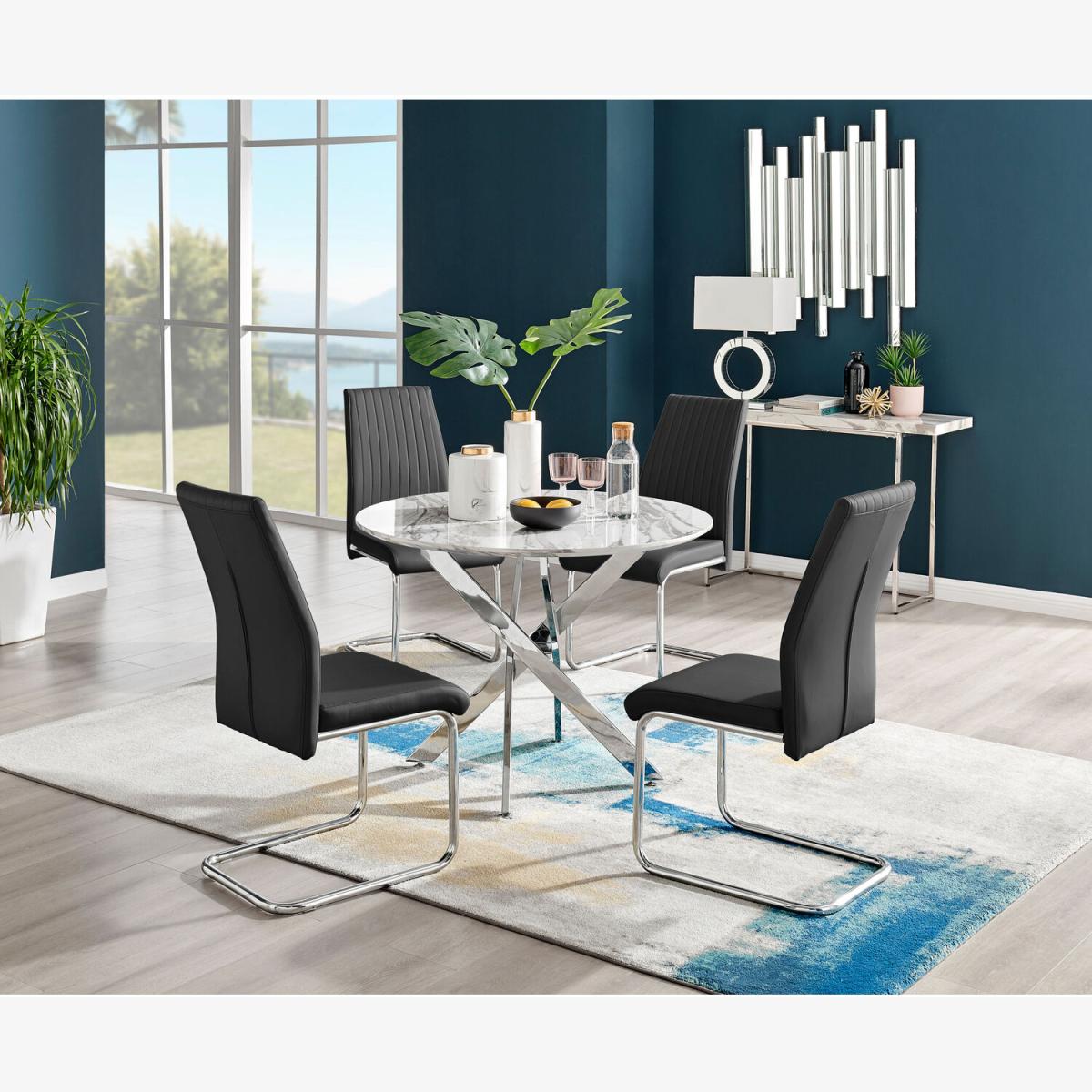 Our popular Novara round dining table here combines a super modern white marble effect tabletop with shiny silver chrome legs in an eye-catching nested starburst design. A sleek and minimalist dinner table that will bounce light around your dining area and create a sense of space. At 100cm across, this table is perfect for smaller spaces and more intimate, relaxed dining. Seats 2 - 4, making this a great family table that will suit any modern home. The strong metal legs not only make this table a real central feature for your room but keep it sturdy. The white marble effect veneer is very on-trend right now and easy to wipe clean too, meaning your Novara will stay looking great for years to come.