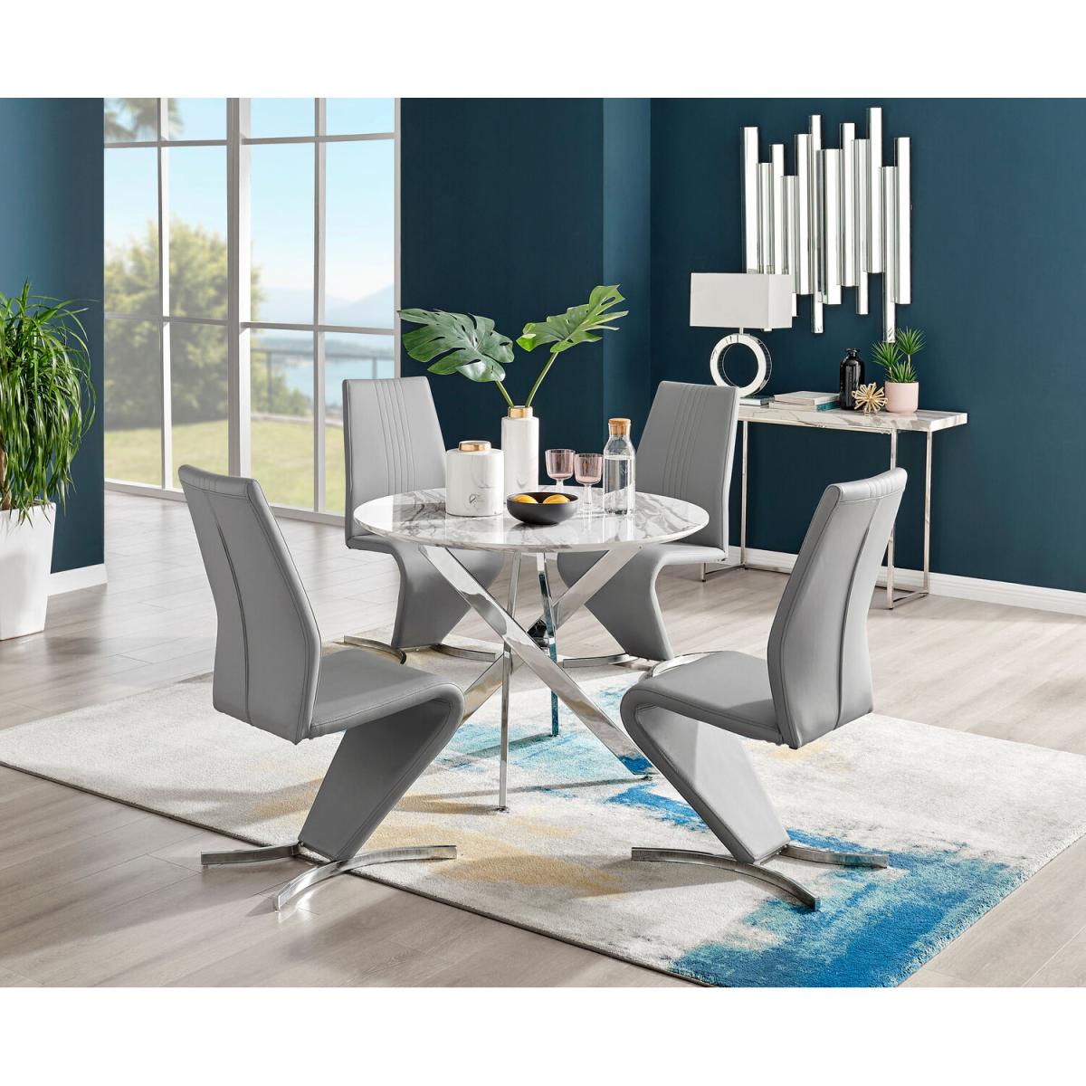 Our popular Novara round dining table here combines a super modern white marble effect tabletop with shiny silver chrome legs in an eye-catching nested starburst design. A sleek and minimalist dinner table that will bounce light around your dining area and create a sense of space. At 100cm across, this table is perfect for smaller spaces and more intimate, relaxed dining. Seats 2 - 4, making this a great family table that will suit any modern home. The strong metal legs not only make this table a real central feature for your room but keep it sturdy. The white marble effect veneer is very on-trend right now and easy to wipe clean too, meaning your Novara will stay looking great for years to come.