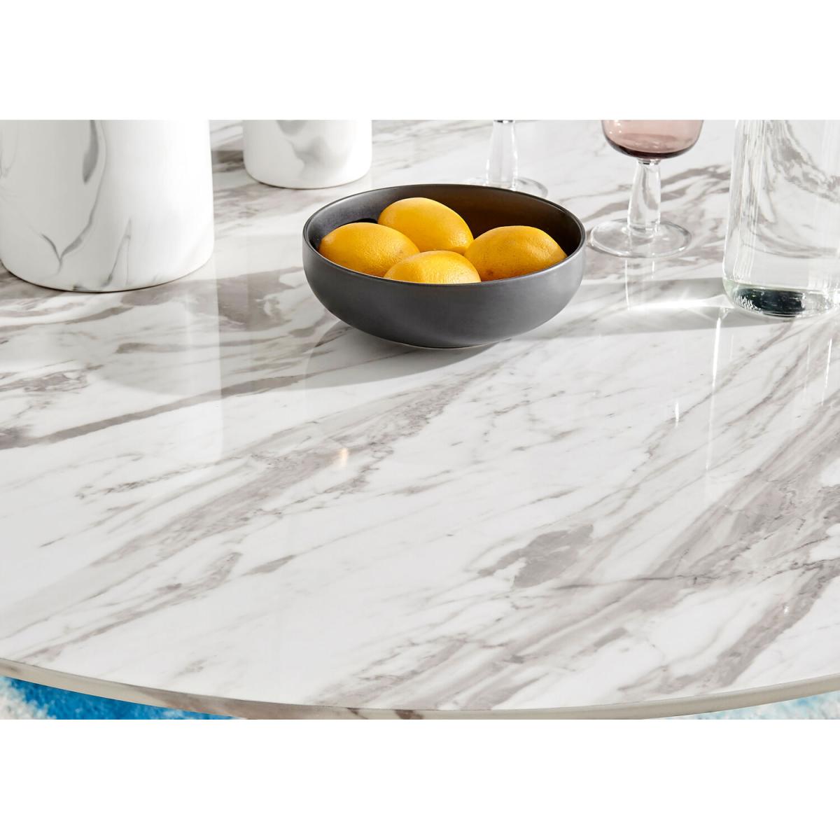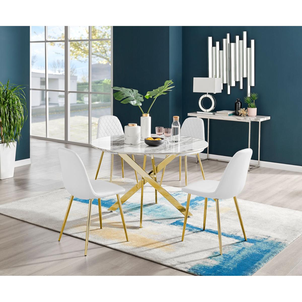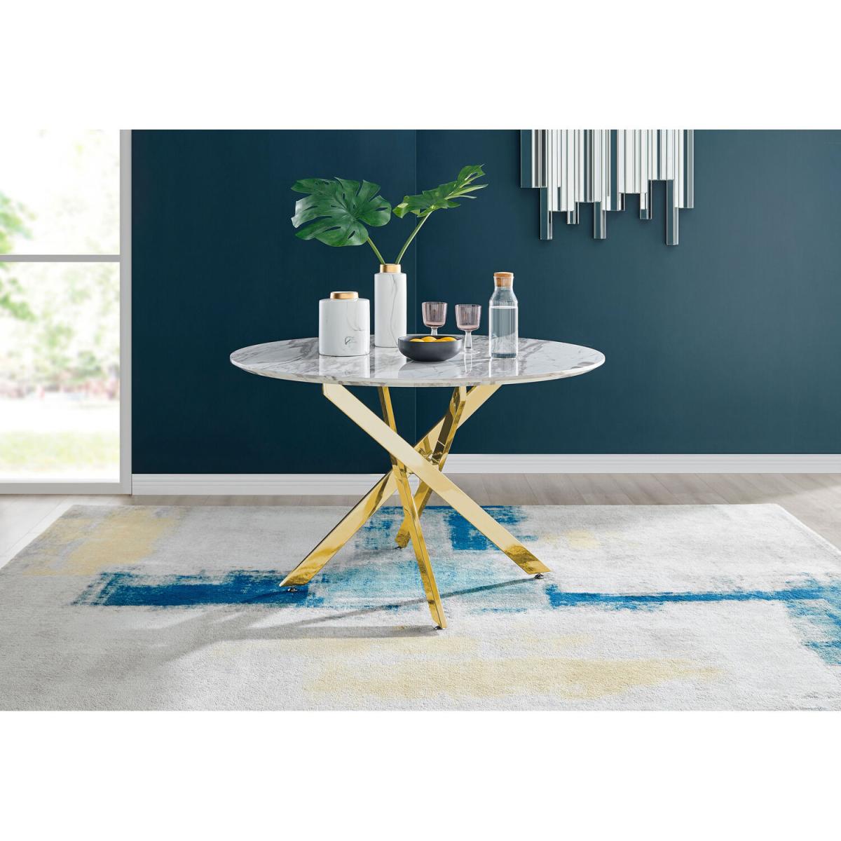 Our popular Novara round dining table here combines a super modern white marble effect tabletop with shiny gold chrome legs in an eye-catching nested starburst design. A sleek and minimalist dinner table that will bounce light around your dining area and create a sense of space. At 120cm across, this table will comfortably seat up to 6, with round tables also being great for more intimate, relaxed dining and smaller spaces. The strong metal legs not only make this table a real central feature for your room but keep it sturdy. The white marble effect veneer is very on-trend right now and easy to wipe clean too, meaning your Novara will stay looking great for years to come.
