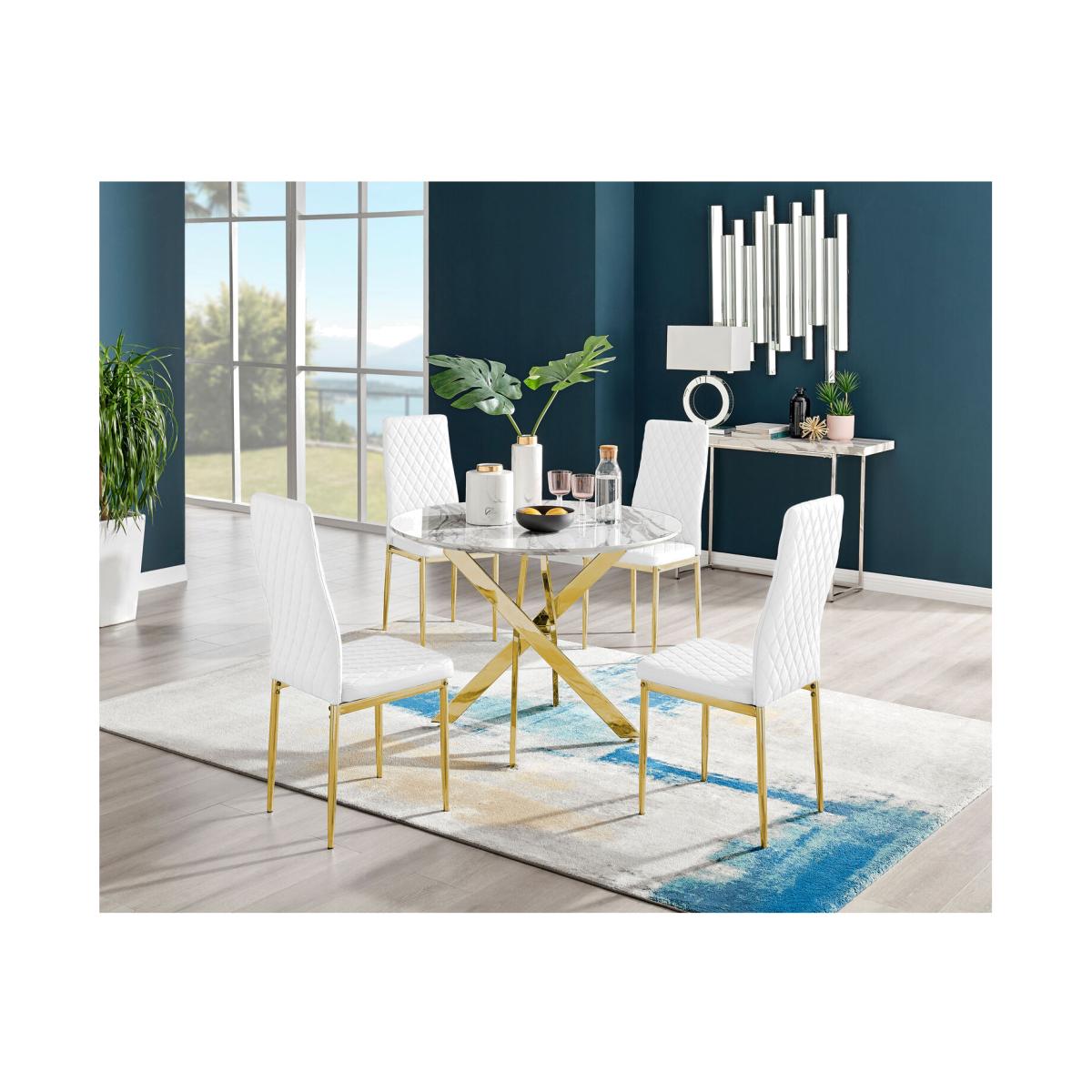 Our popular Novara round dining table here combines a super modern white marble effect tabletop with shiny gold chrome legs in an eye-catching nested starburst design. A sleek and minimalist dinner table that will bounce light around your dining area and create a sense of space. At 100cm across, this table is perfect for smaller spaces and more intimate, relaxed dining. Seats 2 - 4, making this a great family table that will suit any modern home. The strong metal legs not only make this table a real central feature for your room but keep it sturdy. The white marble effect veneer is very on-trend right now and easy to wipe clean too, meaning your Novara will stay looking great for years to come.