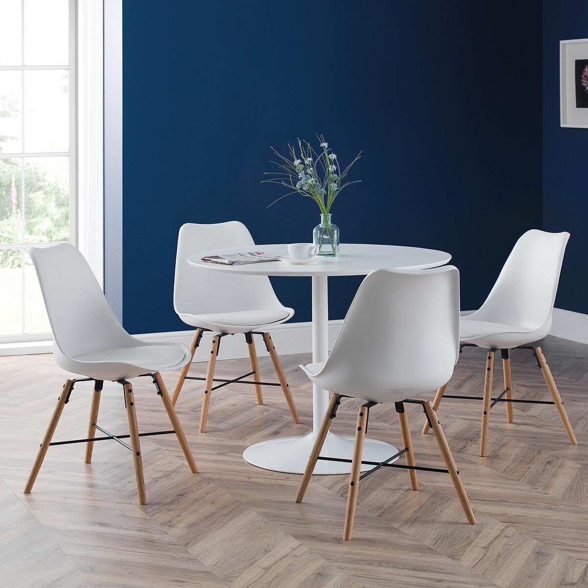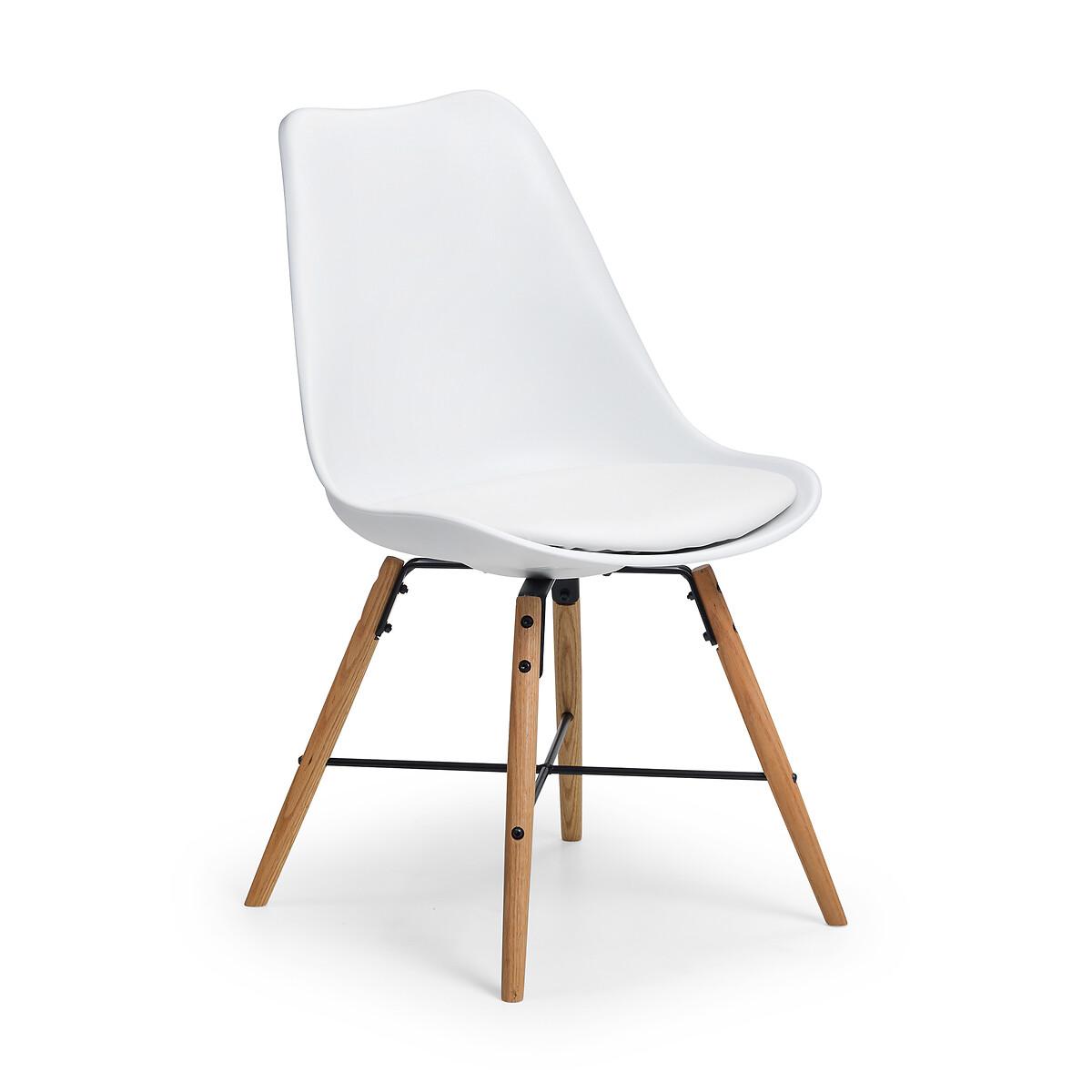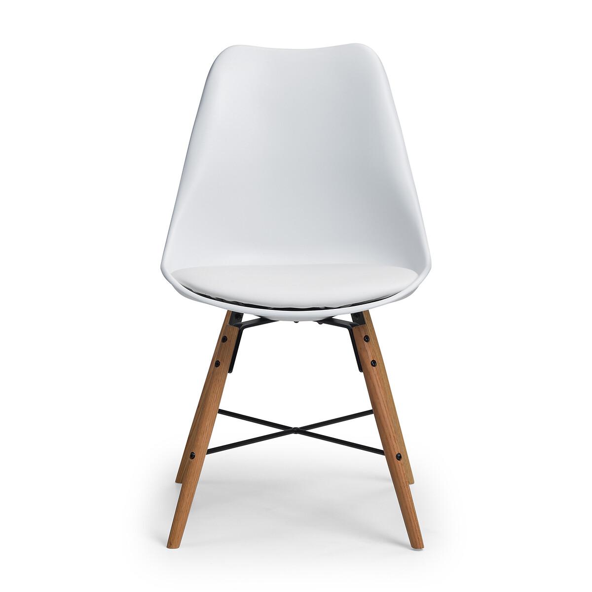 The Novie dining chair is inspired by the classic Eiffel chair, and features a curved design that conforms to the natural curve of the spine, paired with a high-quality padded seat for the ultimate in comfort. Oak effect legs create the perfect scandi look. A steel cross bar creates a modern industrial feel. Product Details • Set of 2 • Sleek plastic seat • Faux leather padded cushion • Easy clean seat • Cross metal base • Wood legs • Assembly required • Fixings included • 12 month manufacterers guarantee. Product Composition - 70% Polypropylene, 10% Pu, 10% Iron &10% Wood. Product Dimensions - 54 cm x 48 cm x 83 cm , Weight - 11 KGSeat height - 44 cm. Back height - 41 cm Package Dimensions - 68 cm x 50 cm x 20 cm, Weight 13.5 kg. Please note: this product cannot be be delivered to all Offshore Islands Northern Ireland or Republic of Ireland. This product will be dispatched by one of our trusted suppliers. You’ll be contacted by their selected courier about your delivery.