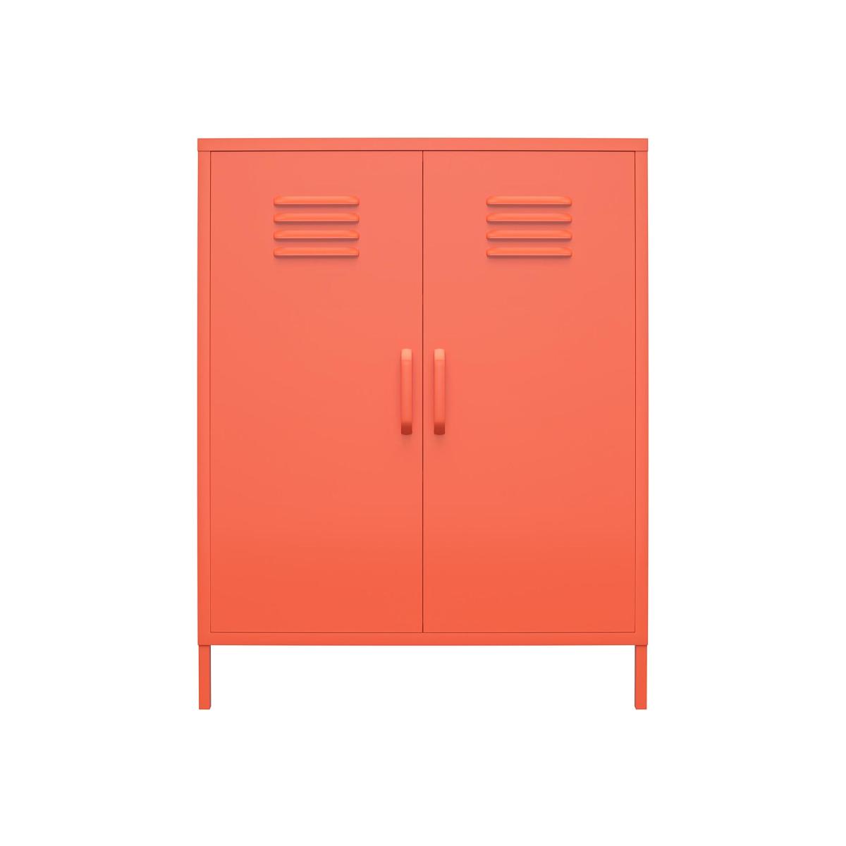 Get the perfect storage solution for any room in your house with the Novogratz Cache 2 Door Metal Locker Storage Cabinet Made of powder-coated metal, the bright color adds a fun pop of color while the metal makes it easy to clean spills with a damp cloth