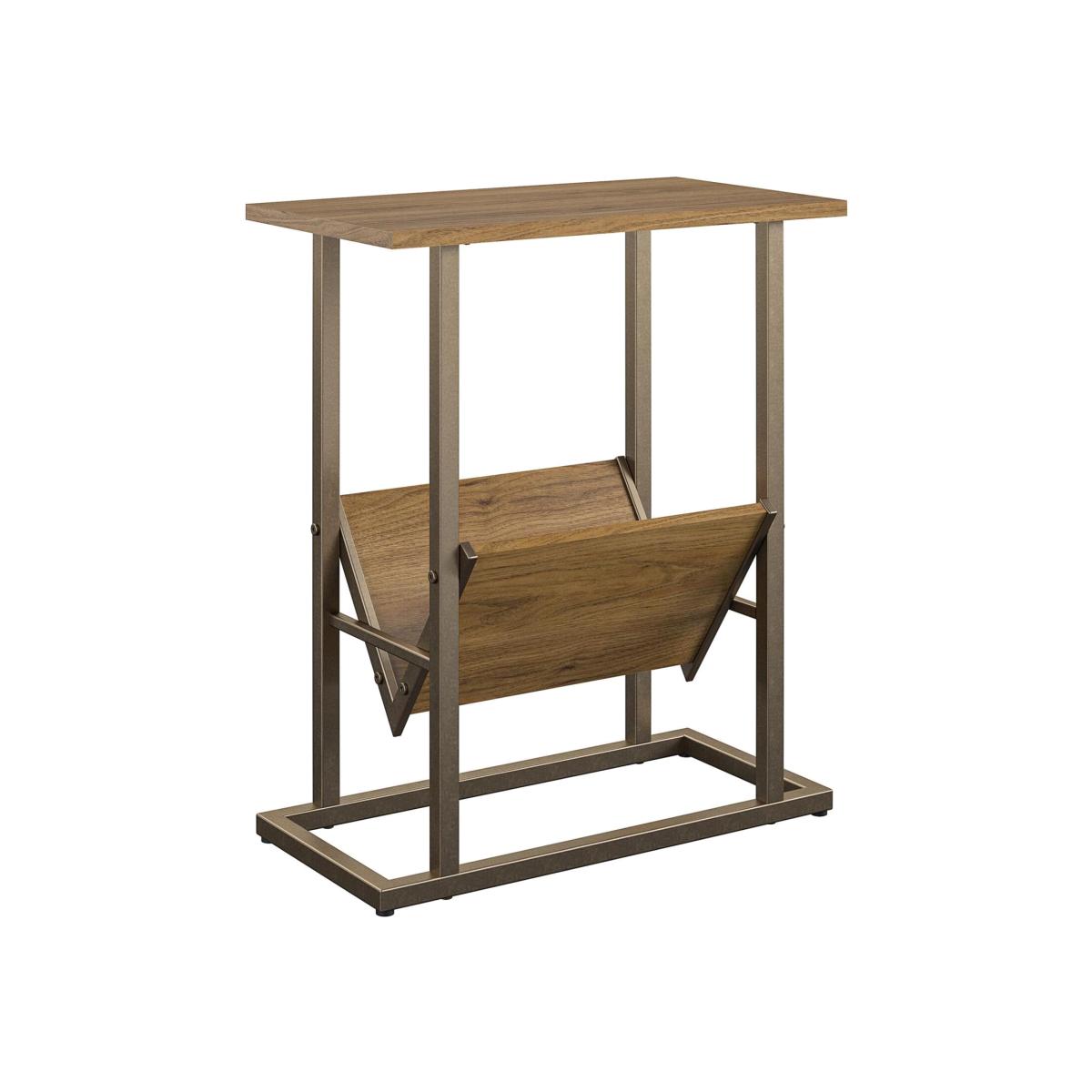 Give your living room a fun and contemporary look with the Novogratz Regal End Table. The light walnut woodgrain or blue finish on the laminated particleboard pairs with the bronze or blue metal frame for a fun mid-century modern feel.