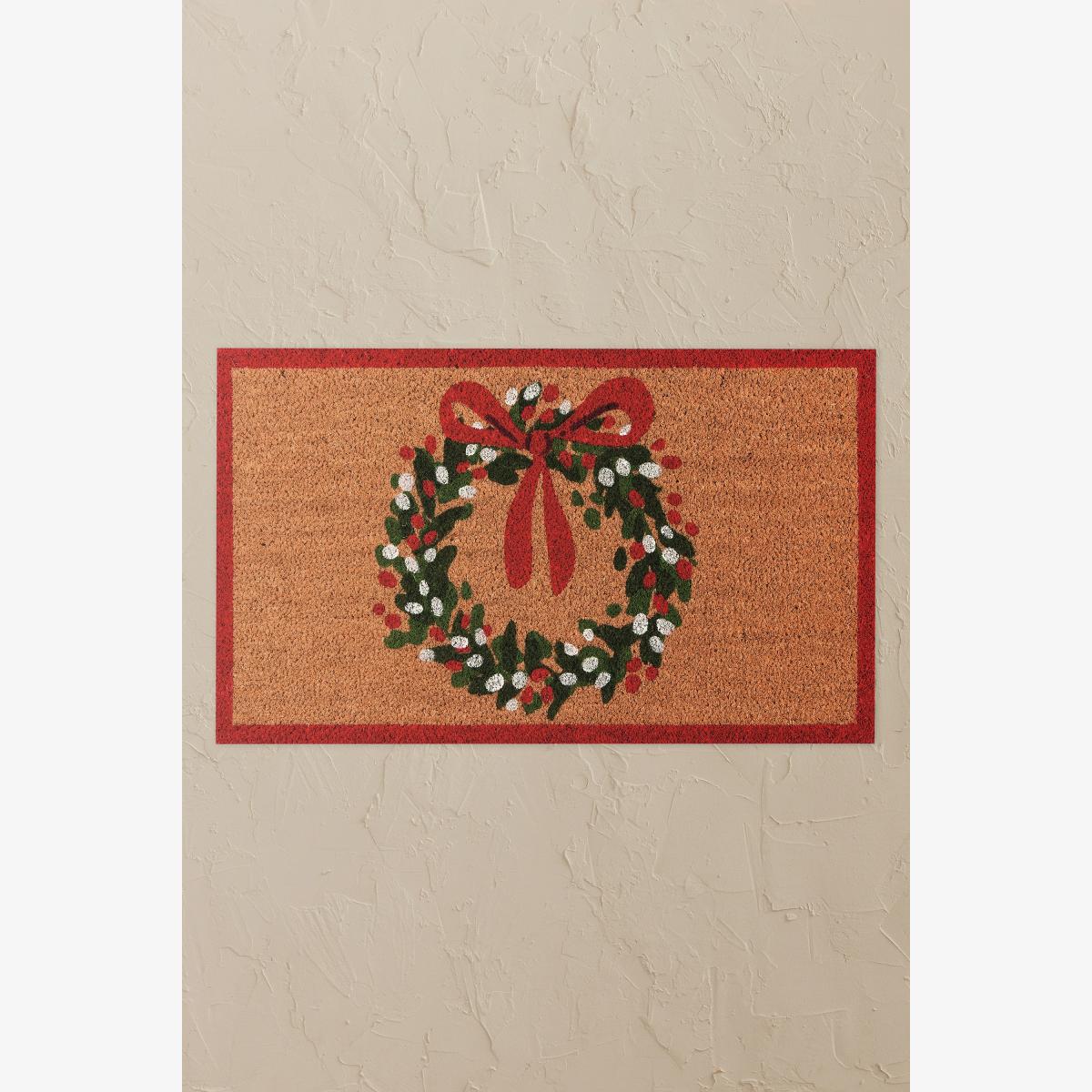 Crafted from coir fiber, adorn your doorstep with the cheerful Wreaths doormat, showcasing an evergreen wreath topped with a festive red bow, printed with fade-resistant inks. Wreaths Christmas Doormat by Now Designs Size: 18" x30" at Anthropologie