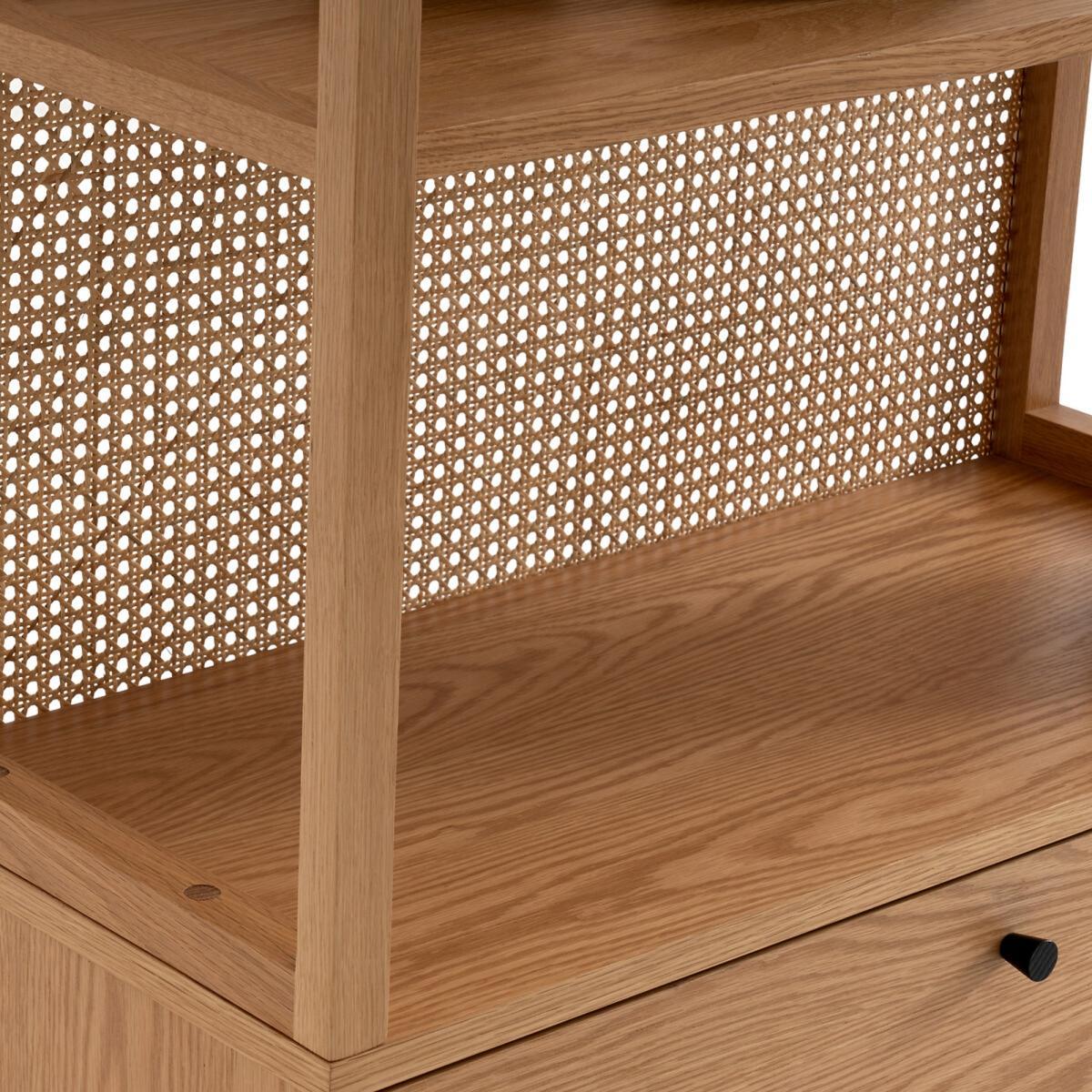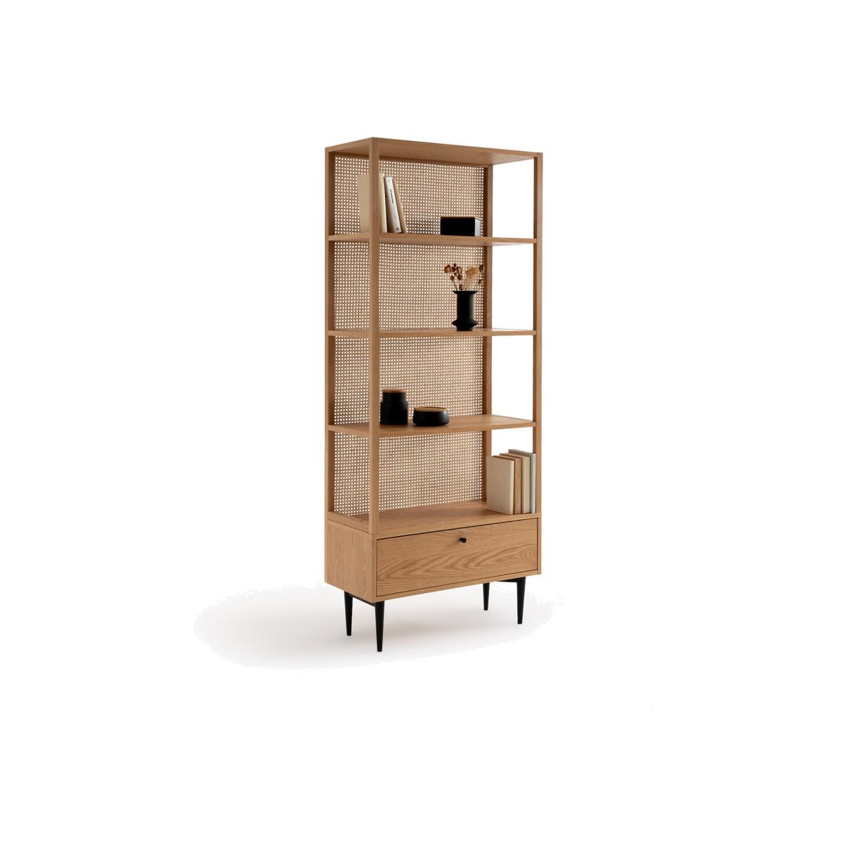 Oak veneer, rattan cane and tapered legs: the range of Noya furniture brings a natural note to your interior. This bookcase offers a great storage solution. Beautiful and functional. Designed by La Redoute Interiors.