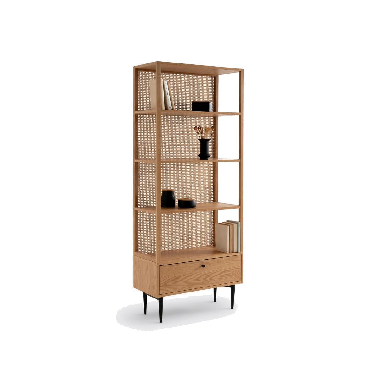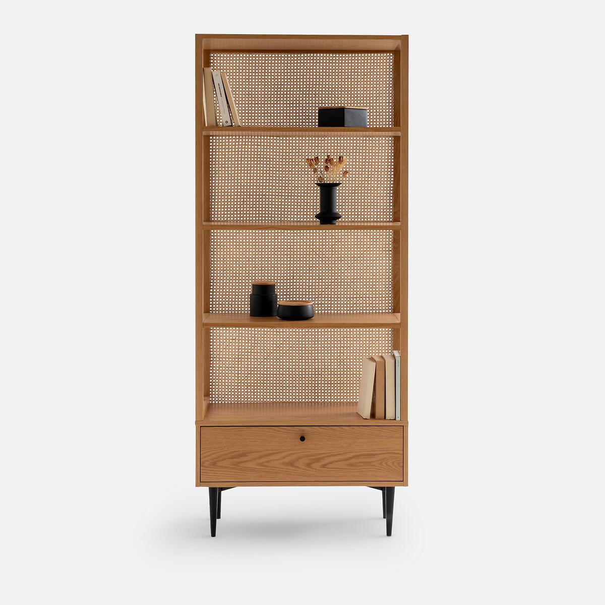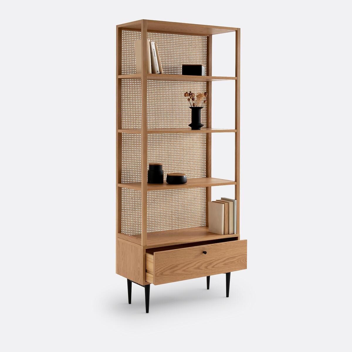 Oak veneer, rattan cane and tapered legs: the Noya furniture range brings a decorative touch to your interior. This bookcase offers a great storage solution. Beautiful and functional. Designed by La Redoute Intérieurs. Product Details • Solid oak structure • Shelves (x4) and drawer in MDF and oak veneered particle board, nitrocellulose varnish finish • Base (reinforcements and feet) in solid oak, matt black paint, nitrocellulose finish • Natural cane base, nitrocellulose varnish finish • Wooden slides • Black painted oak handle • Tapered legs • Felt pads • Fixes to the wallDimensions. Overall • Width: 80cm • Height: 190cm • Depth: 36cm • Height of legs: 20cm. Usable space • Compartments (x3):L74 x H34.7 x D35cm • Single Niche: L74 x H32.7 x D35cm • Drawer:L73 x H16 x D25cm • Sold with feet to be attached. • WOOD FROM SUSTAINABLY MANAGED FORESTS. FSC® certified wood comes from forests that are environmentally, socially and economically well managed. Dimensions and weight of parcel • L90 x H184 x D46cm • 41kg
