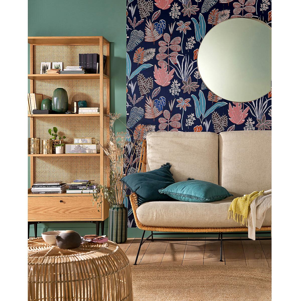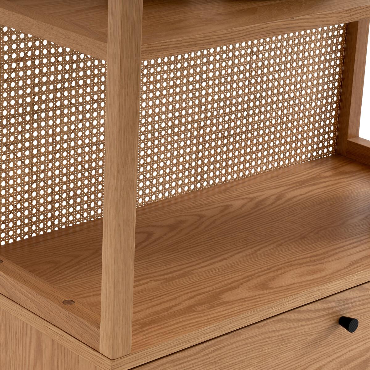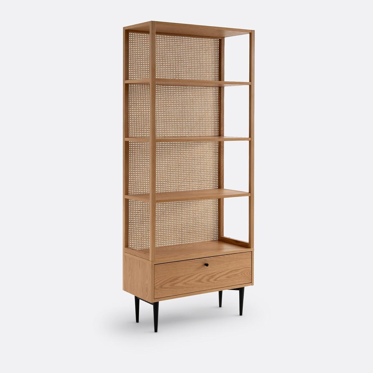 Oak veneer, rattan cane and tapered legs: the Noya furniture range brings a decorative touch to your interior. This bookcase offers a great storage solution. Beautiful and functional. Designed by La Redoute Intérieurs. Product Details • Solid oak structure • Shelves (x4) and drawer in MDF and oak veneered particle board, nitrocellulose varnish finish • Base (reinforcements and feet) in solid oak, matt black paint, nitrocellulose finish • Natural cane base, nitrocellulose varnish finish • Wooden slides • Black painted oak handle • Tapered legs • Felt pads • Fixes to the wallDimensions. Overall • Width: 80cm • Height: 190cm • Depth: 36cm • Height of legs: 20cm. Usable space • Compartments (x3):L74 x H34.7 x D35cm • Single Niche: L74 x H32.7 x D35cm • Drawer:L73 x H16 x D25cm • Sold with feet to be attached. • WOOD FROM SUSTAINABLY MANAGED FORESTS. FSC® certified wood comes from forests that are environmentally, socially and economically well managed. Dimensions and weight of parcel • L90 x H184 x D46cm • 41kg