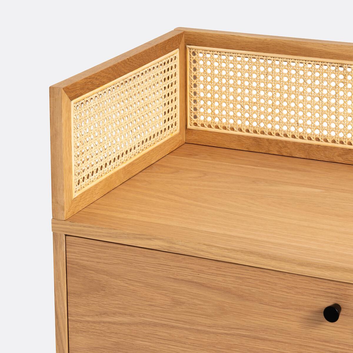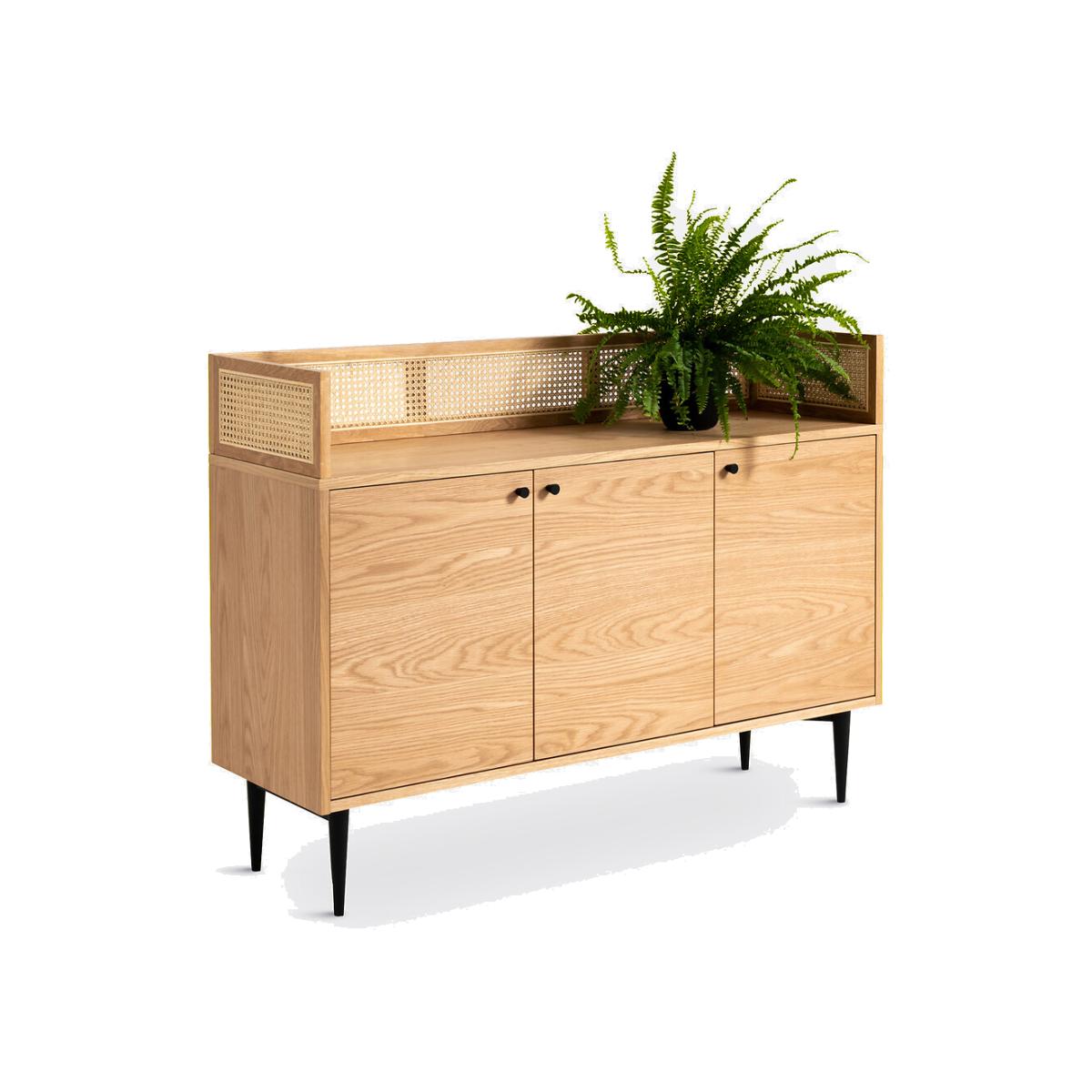 Oak veneer, rattan cane and tapered legs: The Noya furniture range adds a touch of design to your home. This 3-door sideboard offers plenty of storage space. Its protective backsplash prevents objects from falling behind. Beautiful and functional. Designed by La Redoute Interiors. Product Details • 3 doors, soft closing hinges, 1 removable and adjustable shelf behind each door • Solid oak, MDF and oak veneered particle board • Base (reinforcements and feet) in solid oak, matt black paint • Backsplash in solid oak and natural cane • Oak handle, black paint • Nitrocellulose varnish finish • Tapered legs with felt glides • Pre-assembled box, backrest and feet to be assembled. Dimensions • Overall • Width: 130cm • Height: 95cm • Depth: 40cm • Height of legs: 20cm. Usable dimensions • Backrest: H18cm • Compartments (without shelf): L41 x H53.5 x D36cmDelivery:. Assembly required. Available for home delivery. Note! Please check that all access points are large enough to accommodate your delivery (doors, stairs, lifts). Dimensions and weight of parcel • L138.5 x H71.5 x D48.5cm • 51kg