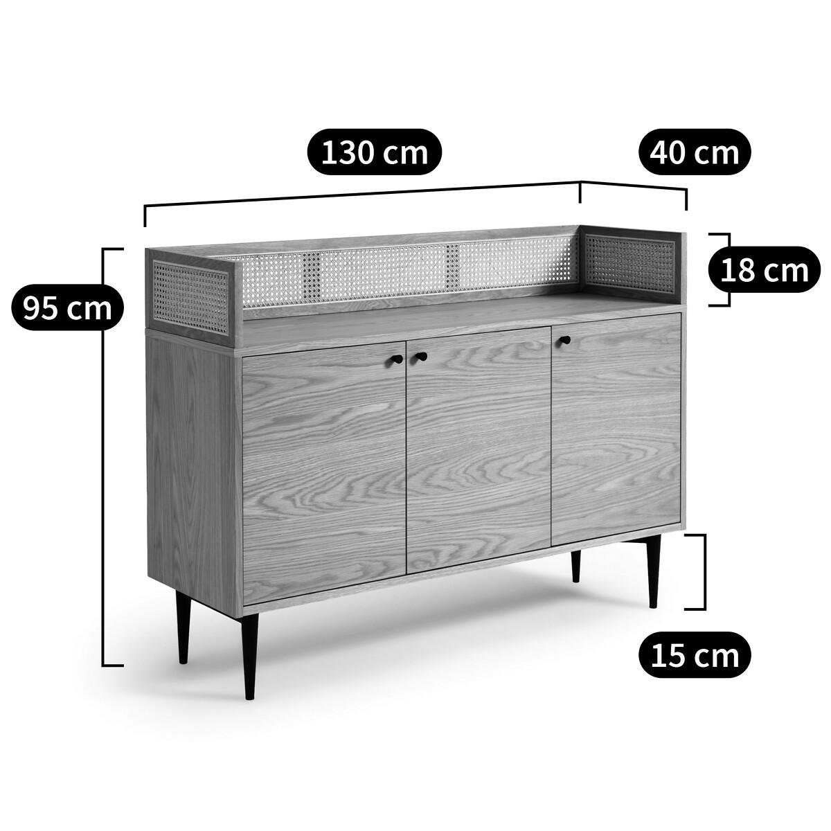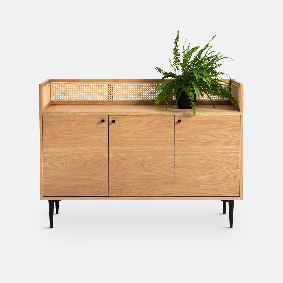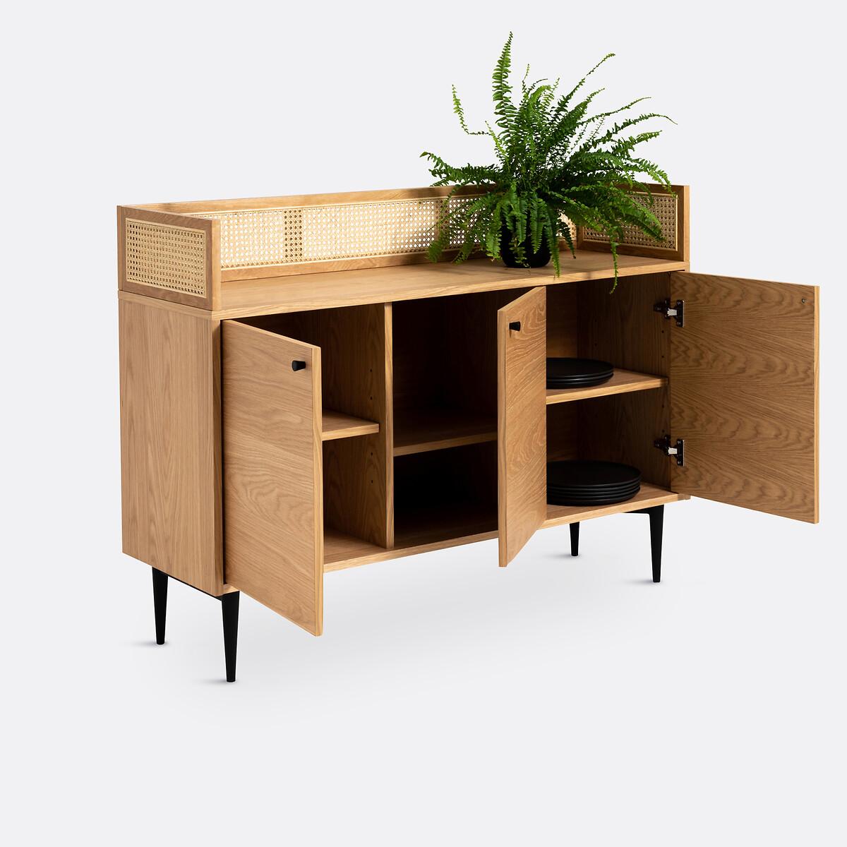 Oak veneer, rattan cane and tapered legs: The Noya furniture range adds a touch of design to your home. This 3-door sideboard offers plenty of storage space. Its protective backsplash prevents objects from falling behind. Beautiful and functional. Designed by La Redoute Intérieurs. Product Details • 3 doors, soft closing hinges, 1 removable and adjustable shelf behind each door • Solid oak, MDF and oak veneered particle board • Base (reinforcements and feet) in solid oak, matt black paint • Backsplash in solid oak and natural cane • Oak handle, black paint • Nitrocellulose varnish finish • Tapered legs with felt glides • Pre-assembled box, backrest and feet to be assembled. Dimensions • Overall • Width: 130cm • Height: 95cm • Depth: 40cm • Height of legs: 20cm. Usable dimensions • Backrest: H18cm • Compartments (without shelf): L41 x H53.5 x D36cmDelivery:. Assembly required. Available for home delivery. Note! Please check that all access points are large enough to accommodate your delivery (doors, stairs, lifts). • WOOD FROM SUSTAINABLY MANAGED FORESTS. FSC® certified wood comes from forests that are environmentally, socially and economically well managed. Dimensions and weight of parcel • L138.5 x H71.5 x D48.5cm • 51kg