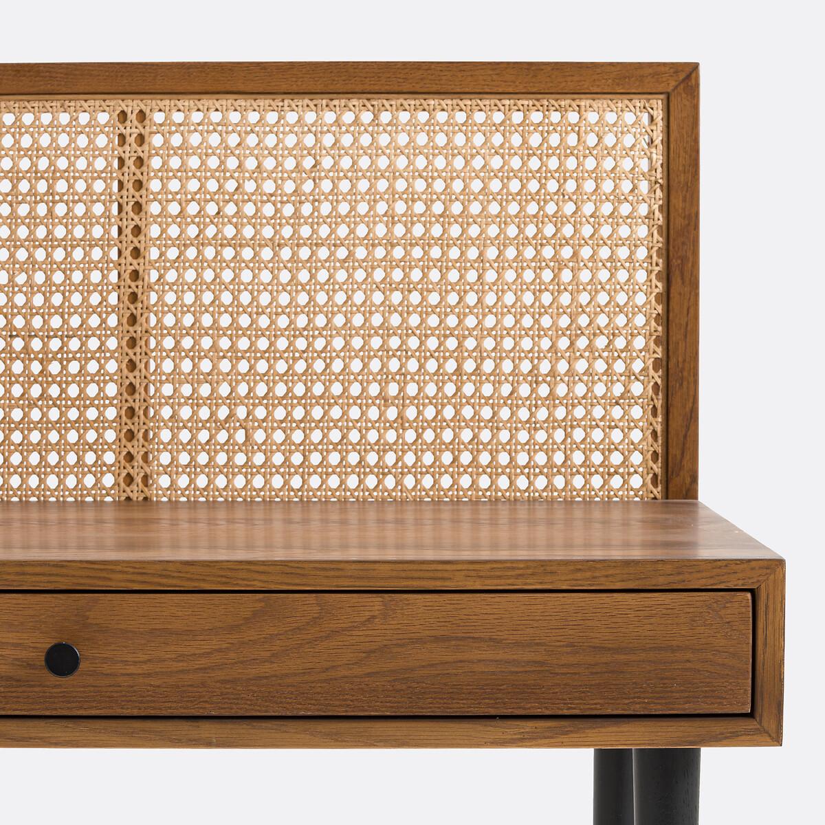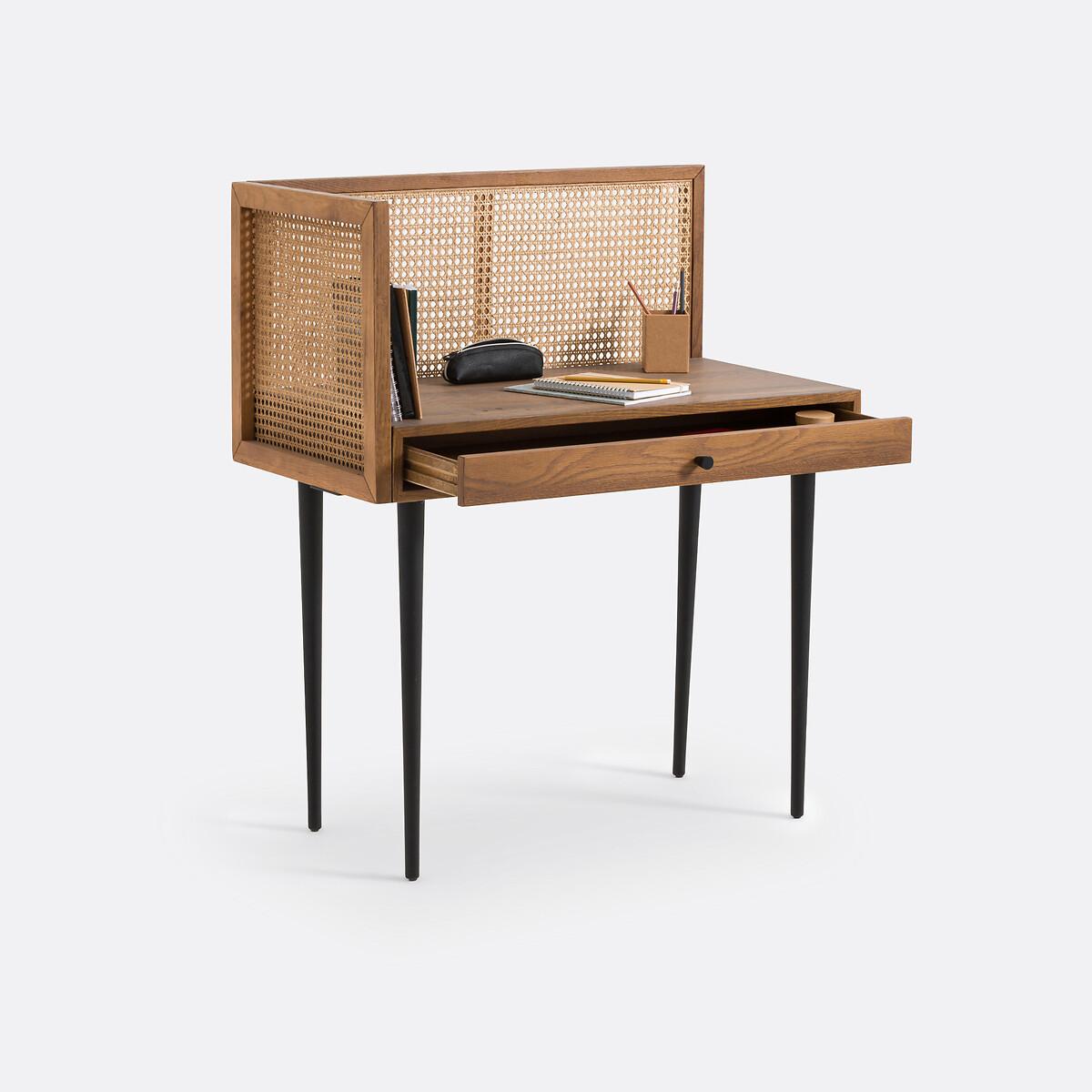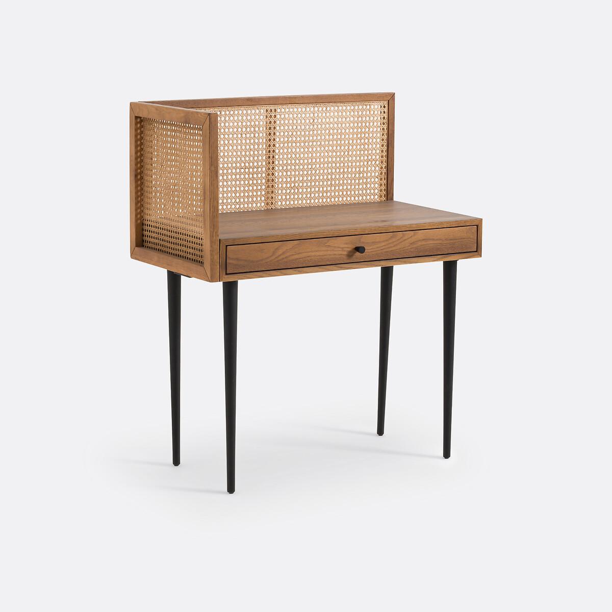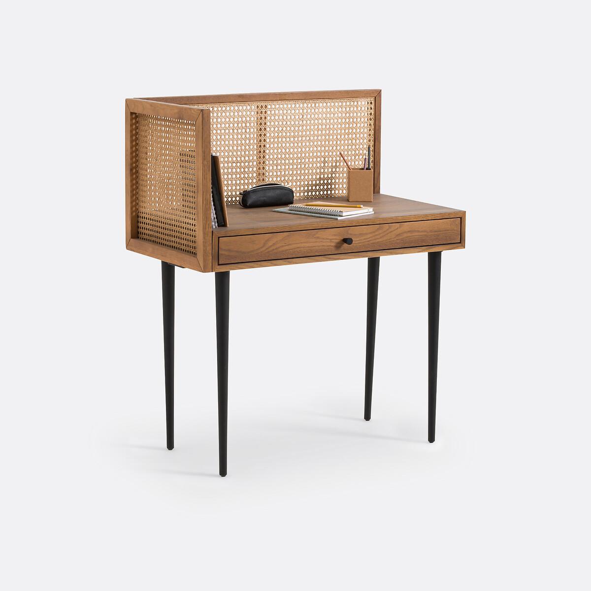 The Noya desk is equipped with reversible rattan panels. Its vintage spirit, its noble materials, its finishing qualities and its fifties design, bring a friendly and warm touch..
