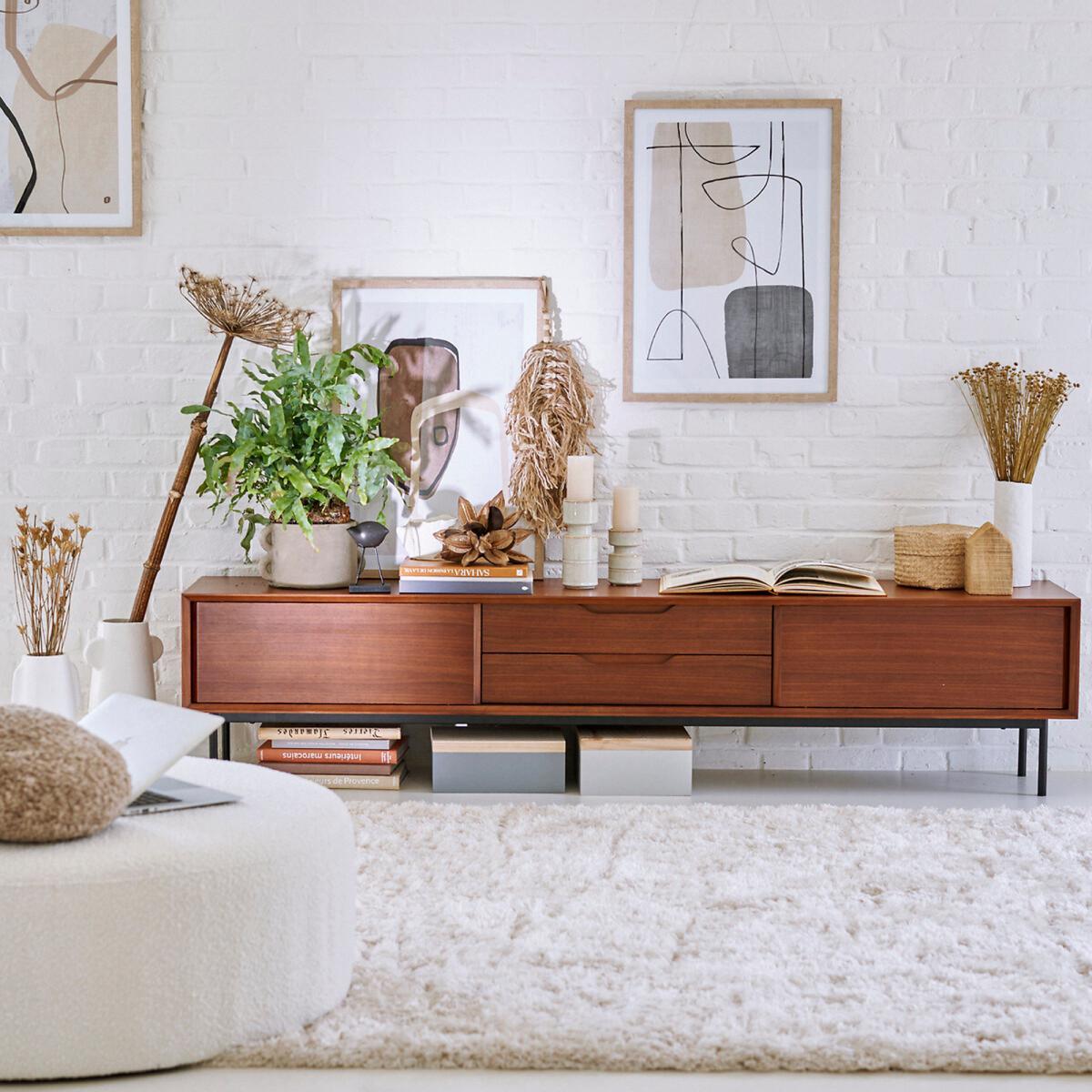 I love this walnut media unit for its sleek yet functional design, which makes it a versatile addition to various interiors. Its rich wood tone adds warmth and personality, especially suited to mid-century modern or Scandinavian-inspired spaces. It works well in open-plan living areas where you want a statement piece that offers practicality-thanks to quite sizeable storage for media accessories, extras, or décor items. When styling, consider pairing it with minimalistic accessories, such as simple vases or small sculptures, to keep the look clean. For added visual interest, you might try contrasting it with textured cushions or rugs in muted tones for a balanced, contemporary feel. Overall, it’s a smart choice for those looking to combine style with practical storage.