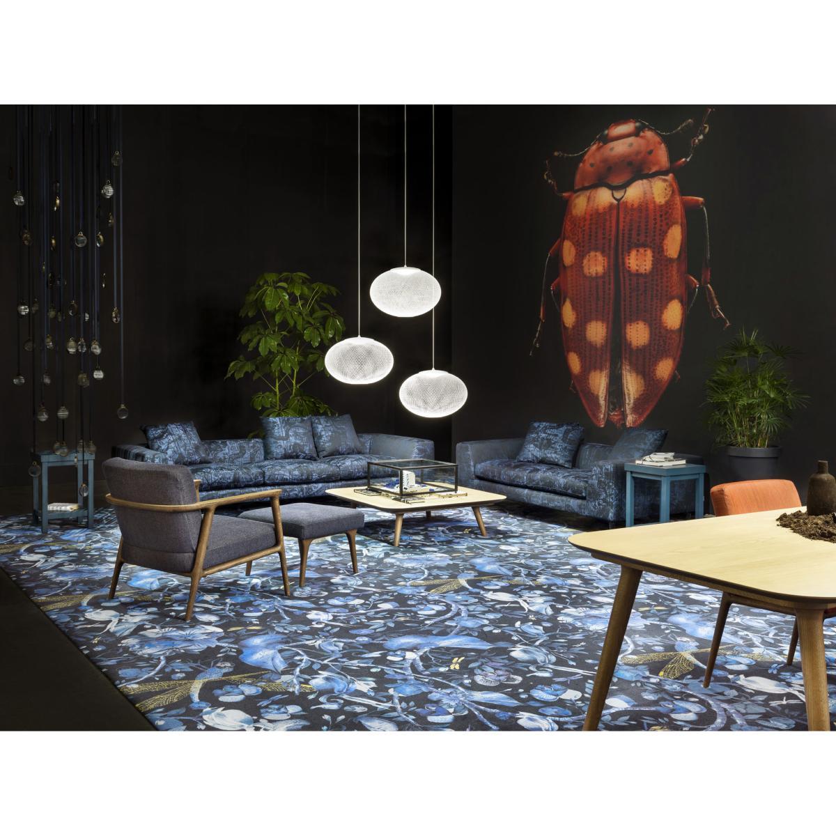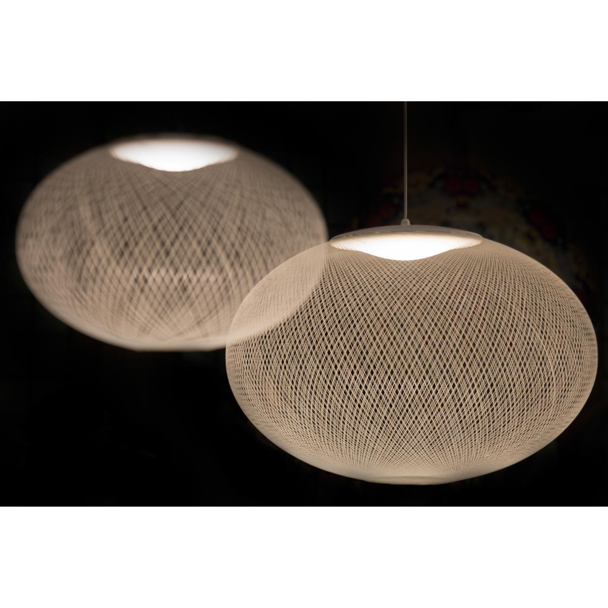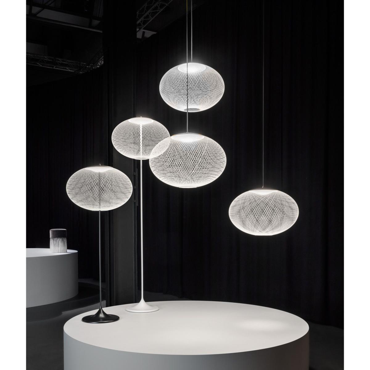 The fibreglass threads are finer while the shape of the lamp more elongated and symmetric, forming a harmonious bubble of glossy light.
