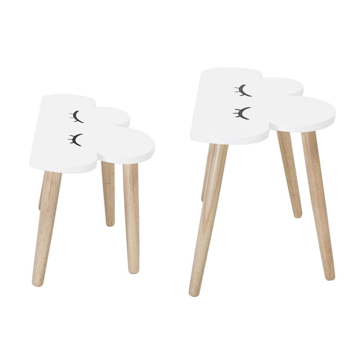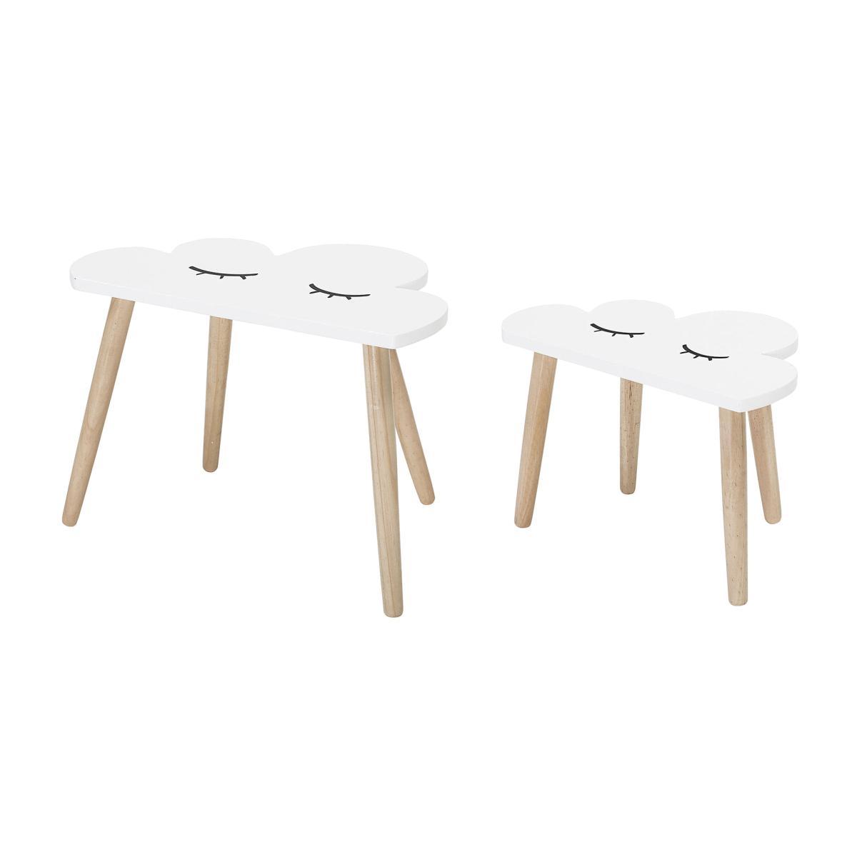 A fun and Scandinavian style for these adorable cloud-shaped nested tables. They will take your little ones into an enchanted and poetic world, conducive to developing their imagination. The lacquered white pine top with wavy contours is decorated with fun "closed eye" patterns. The flared light wooden legs provide a retro touch to the shape. The Cloud tables personalise the kids' bedroom in a fun and creative way. They will become essential: bed side tables, small coffee tables in a leisure corner, a desk to draw, a table to enjoy a snack or showcase your most wonderful items.