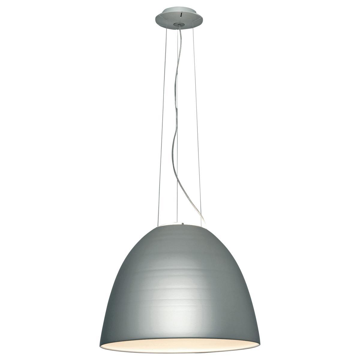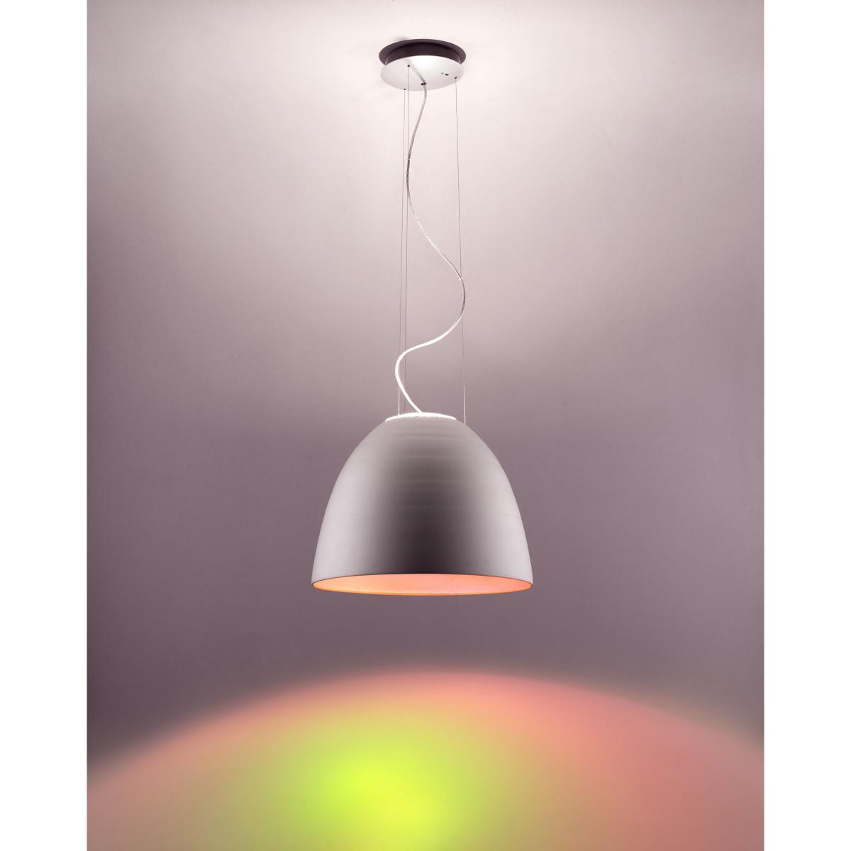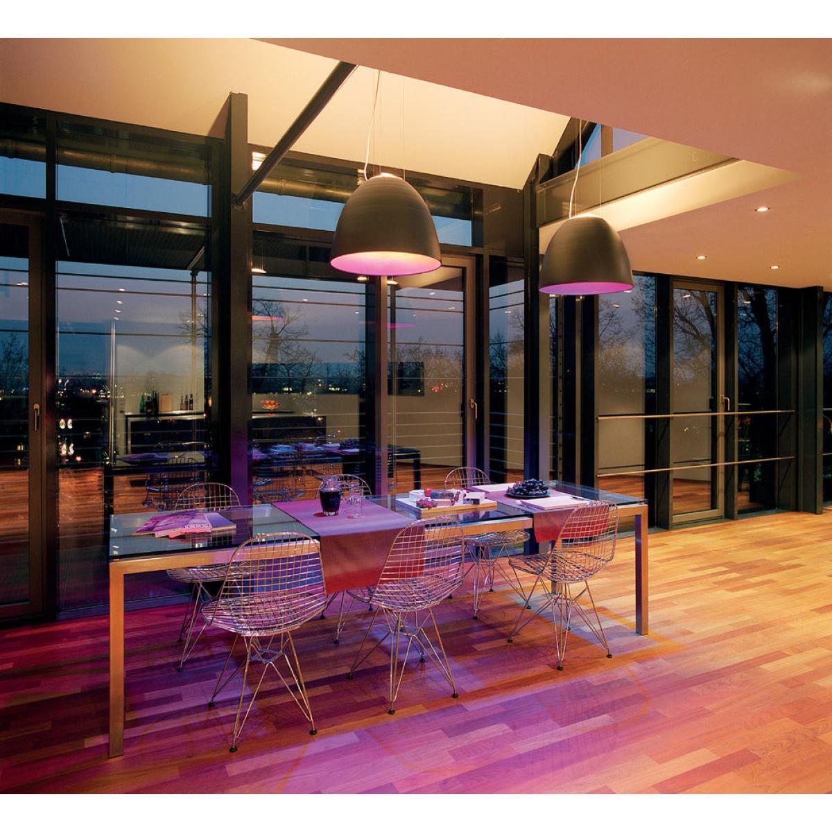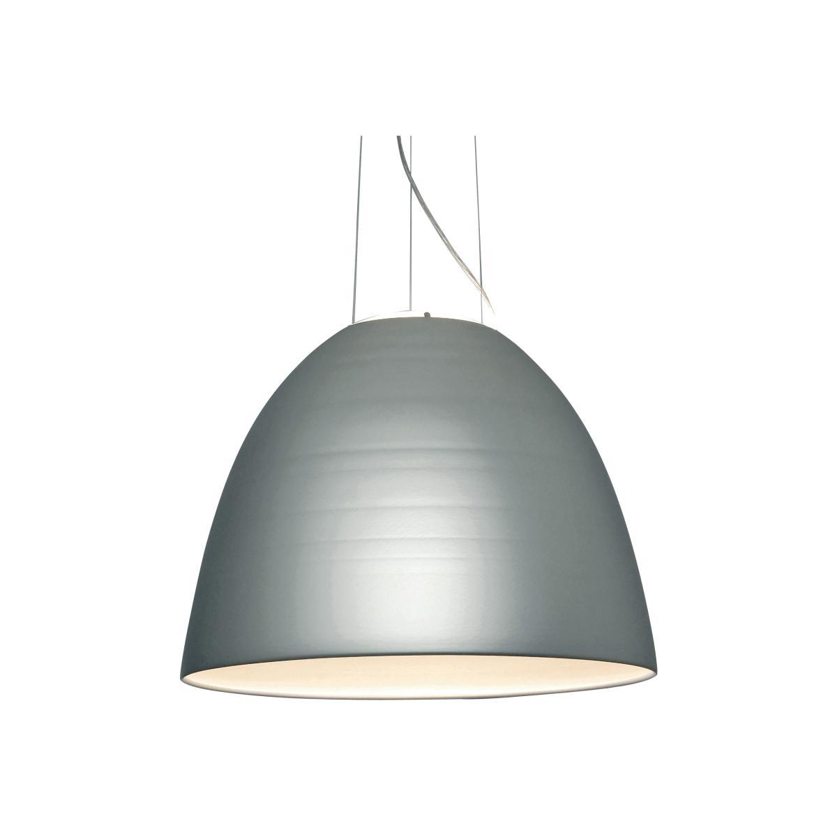 Nur is a suspension with an imposing presence. With its elongated and big cap shape, she dresses the space and the volumes with forces and very big modernity (Ø 55 - H 43 cm). Nur exists with halogen or fluorescent source compacte. These versions can be equipped of a pink or blue colored filter to choose according to the mood. The body is in aluminum. It is proposed in two different colors: gray coal and gray anodise aluminum. A superior upper cap in sandblasted glass leaves the light up and offers thus an indirect lighting. The colored filter is sold separately.