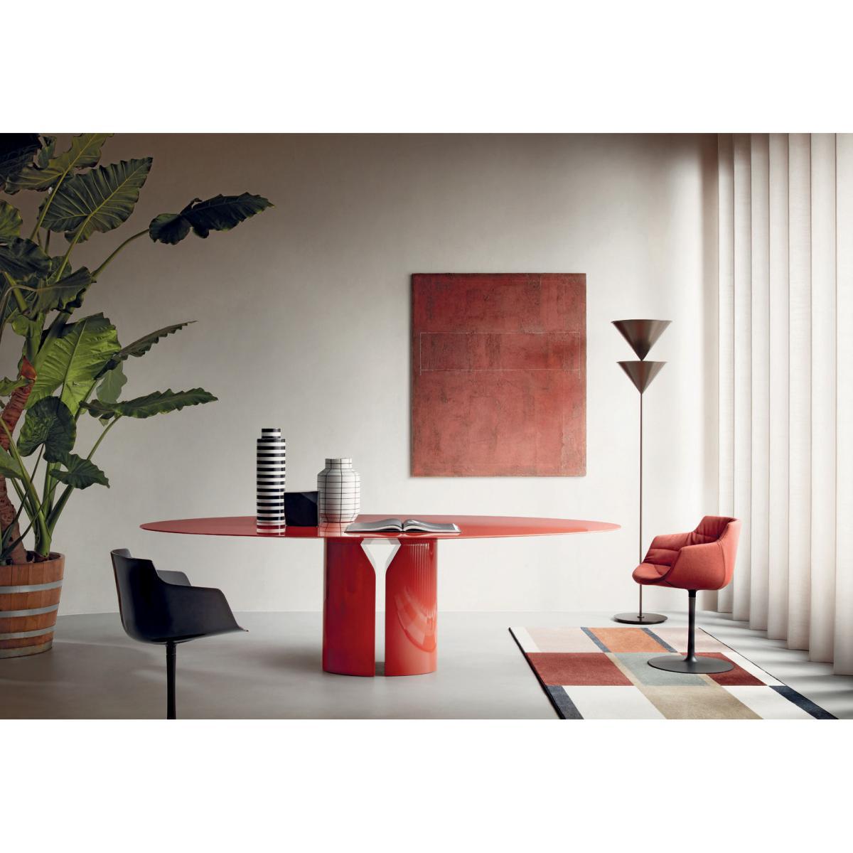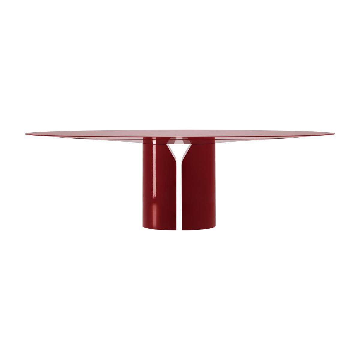 More than 200 projects in France and around the world, immense projects that have sealed his status as the most famous French architect in the world, Jean Nouvel has accumulated international awards. The NVL table is the second project that Jean Nouvel created for the MDF Italia brand. The distinctive traits of his architecture are clearly present in this table and celebrate the stylistic elements which have always characterised the work of Jean Nouvel: clean geometric shapes, formal lightness, a graphic aspect and rigour. A very strong character for this monochrome table which sports monolithic contemporary lines. The NVL table is based around simple geometric shapes: a cylinder with a round base for the round table and a cylinder with an oval base for the oval table. Jean Nouvel took inspiration from trilithons: in archaeology, trilithons are megalithic structures made of two vertical stones and a third placed horizontally on top of the first two (like a lintel). Slender and light, the lacquered MDF top appears to float above the polyurethane cast-iron weighted base. The top is supported by a central baser comprised of two symmetric shapes which get thinner toward the top to reduce the intersecting surface between the legs and the top as much as possible. The shape of the base divided into two distinct parts highlights the constructive force linking the three elements of the table: the two legs and the top. "a two-focus ellipse, a two-legged table", Jean Nouvel.