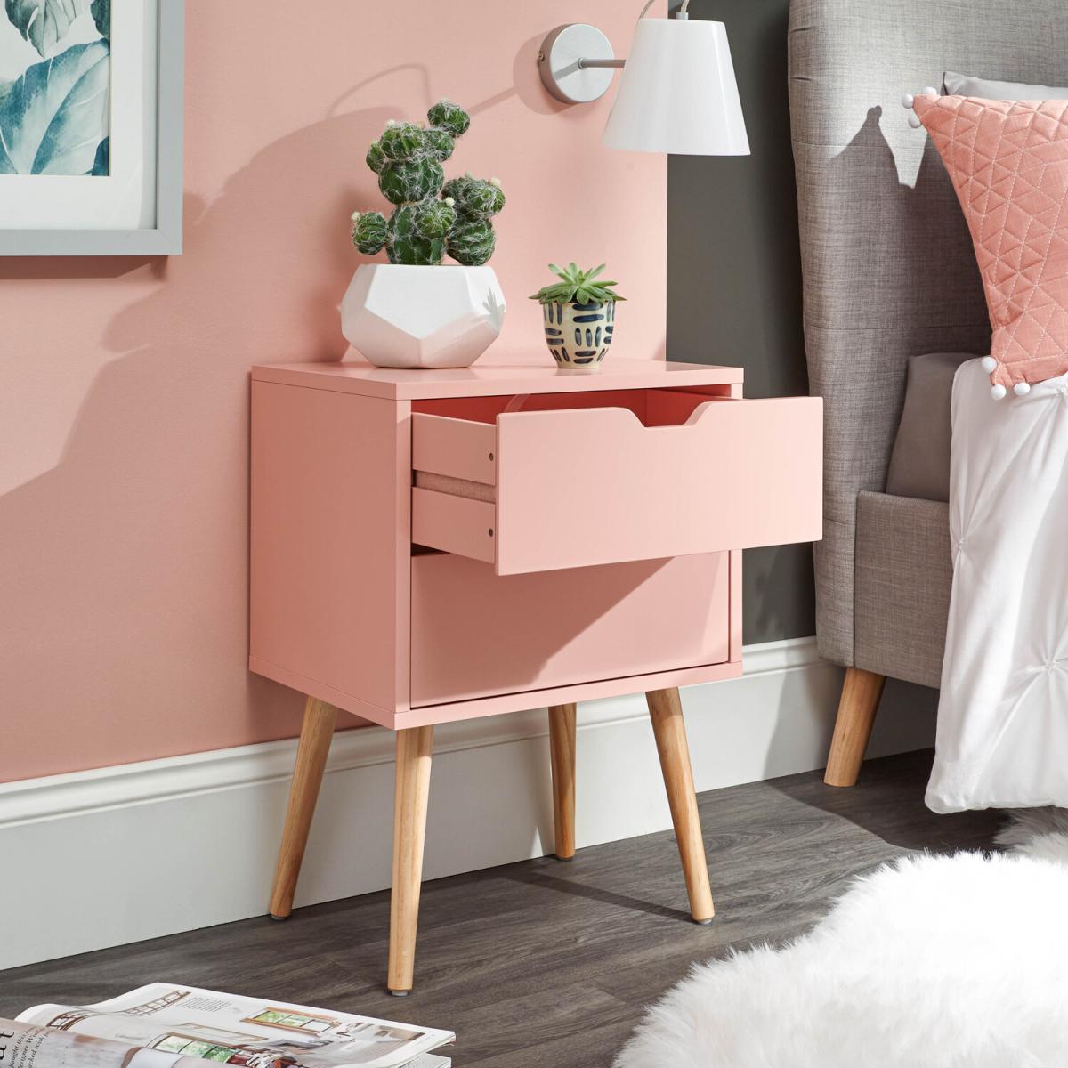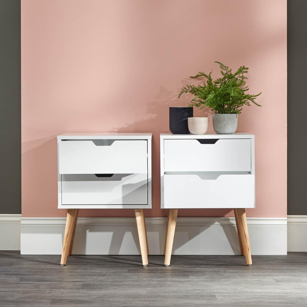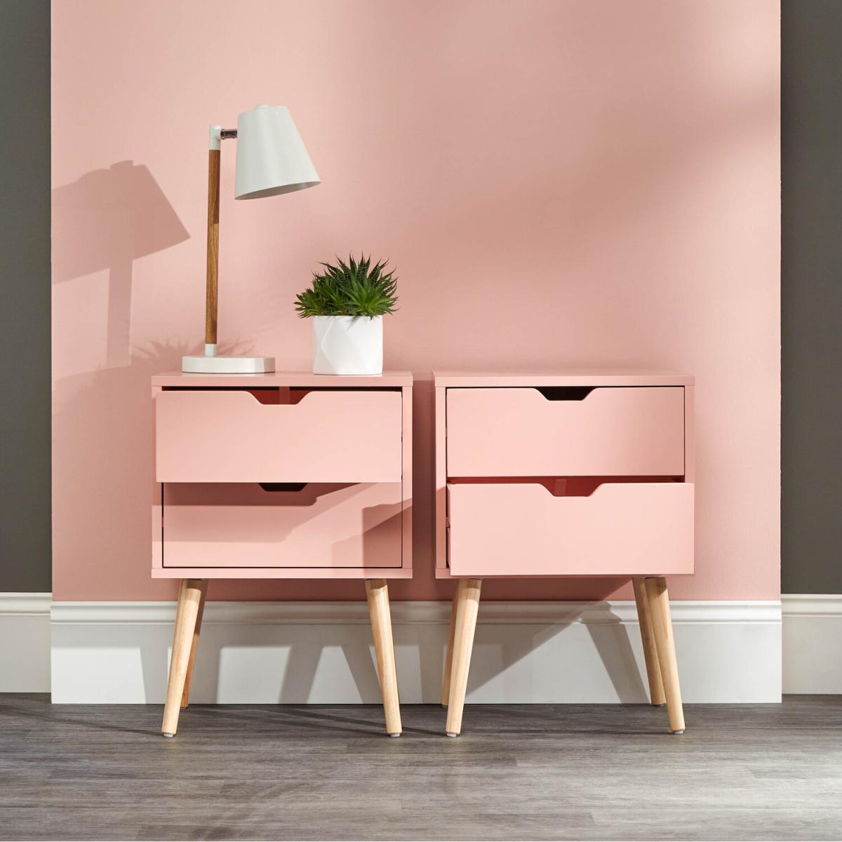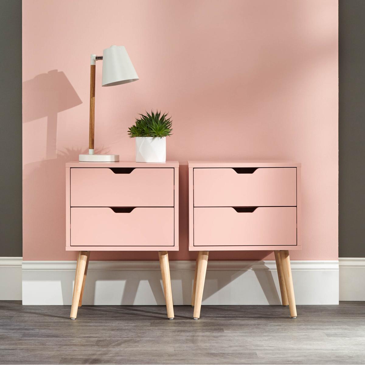 Spruce up your bedroom with a funky Nyborg bedside table - or two! This Scandi-inspired unit makes a virtue out of simplicity. The classic cuboid form is just the right size to accommodate a lamp and a book or two, while the two handy drawers feature classic cut-out handles for simple yet effective operation. The whole is painted in a choice of on-trend colours - including exciting new shades of warm pink, soft green and ink blue - and mounted on pale-wood legs.