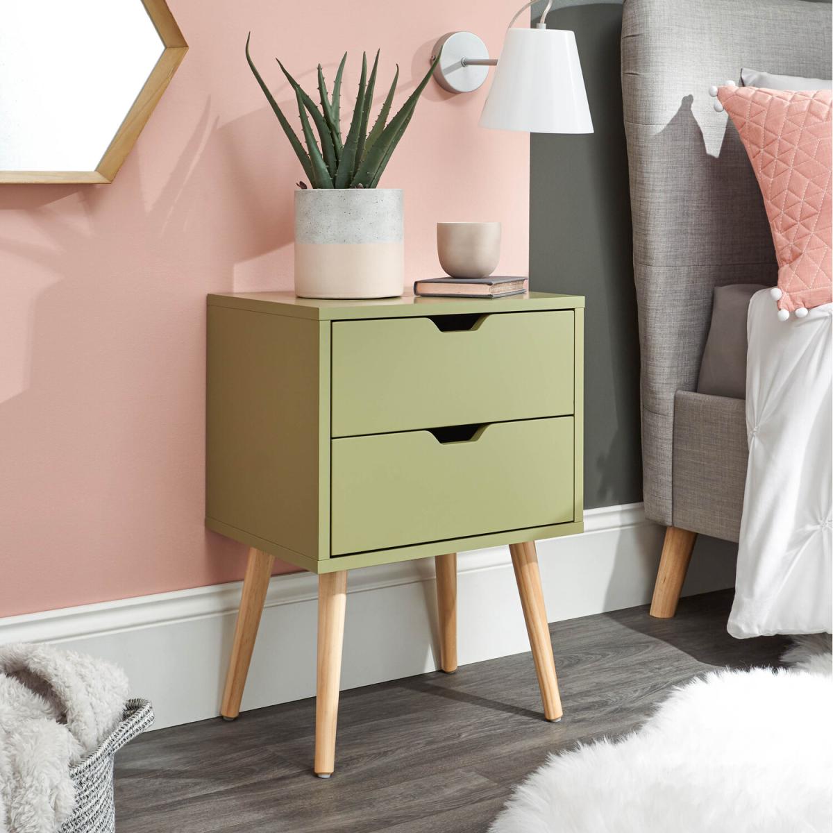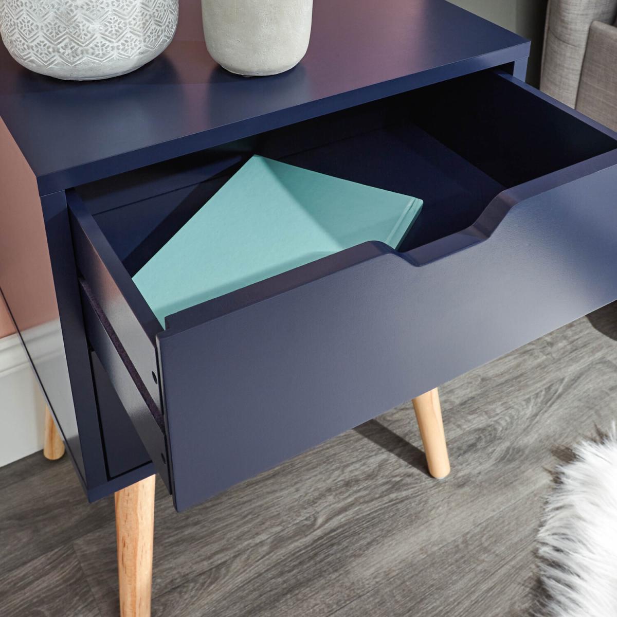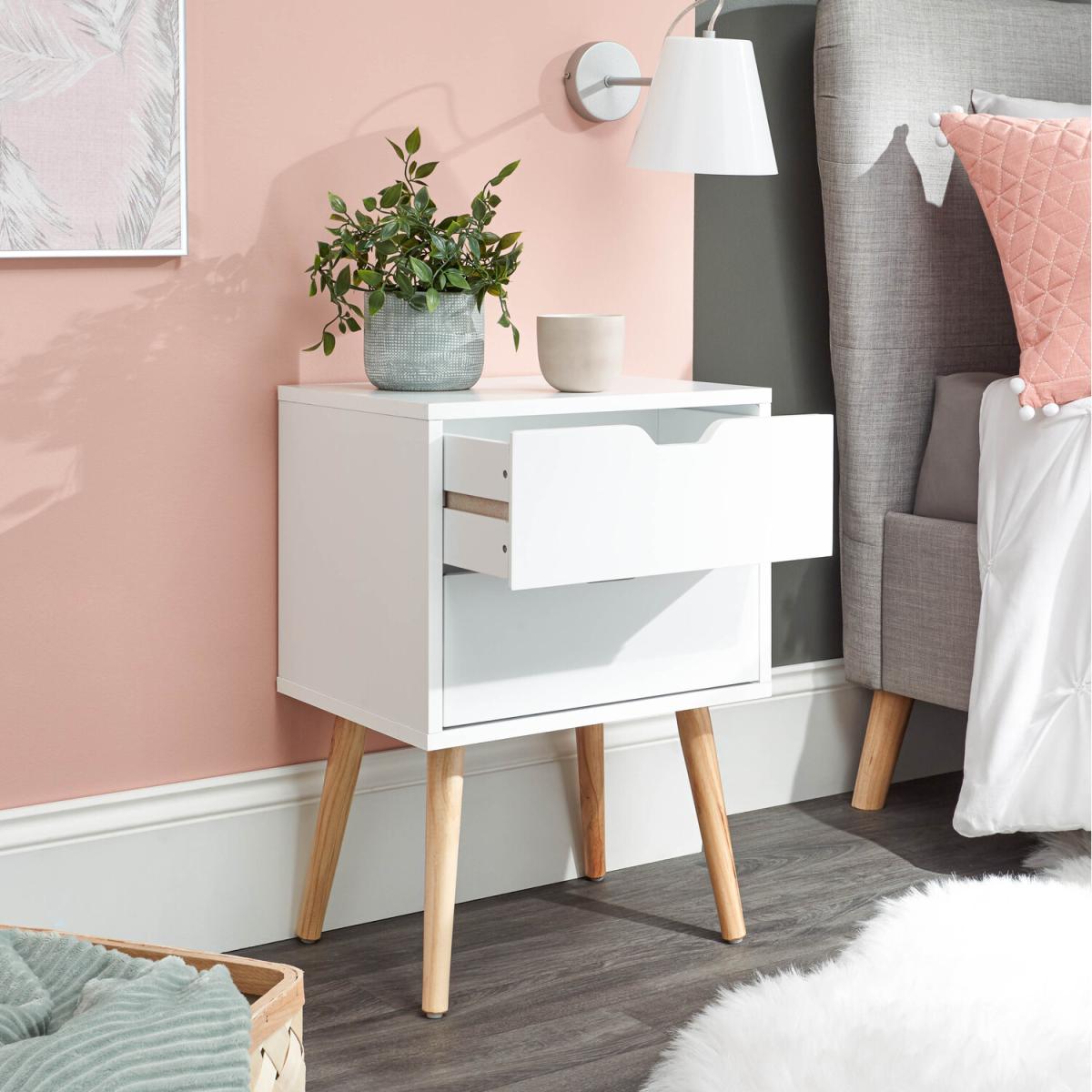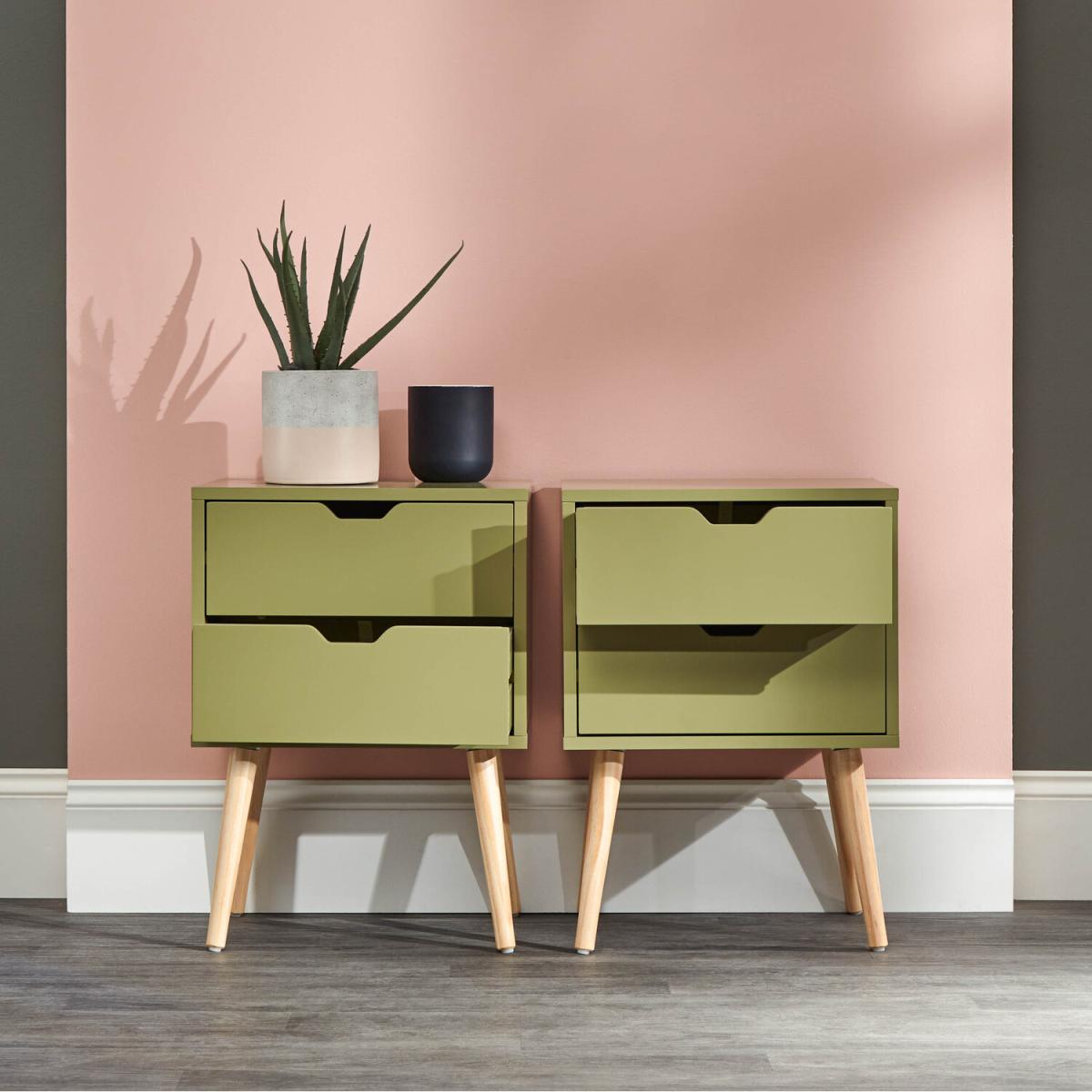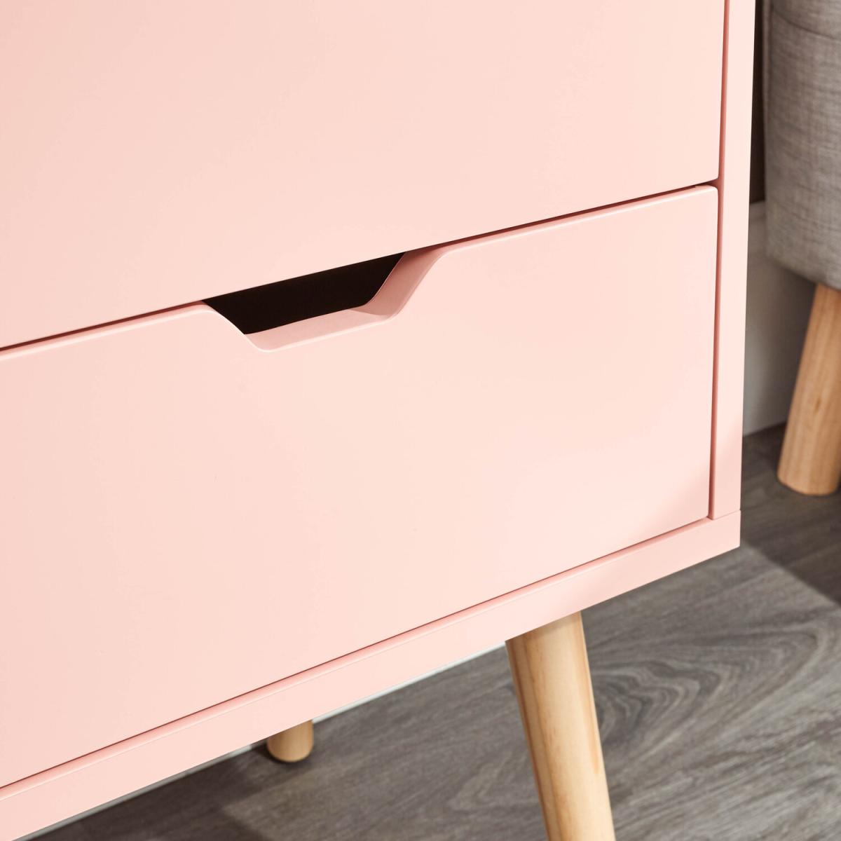 Spruce up your bedroom with a funky Nyborg bedside table - or two! This Scandi-inspired unit makes a virtue out of simplicity. The classic cuboid form is just the right size to accommodate a lamp and a book or two, while the two handy drawers feature classic cut-out handles for simple yet effective operation. The whole is painted in a choice of on-trend colours - including exciting new shades of warm pink, soft green and ink blue - and mounted on pale-wood legs.